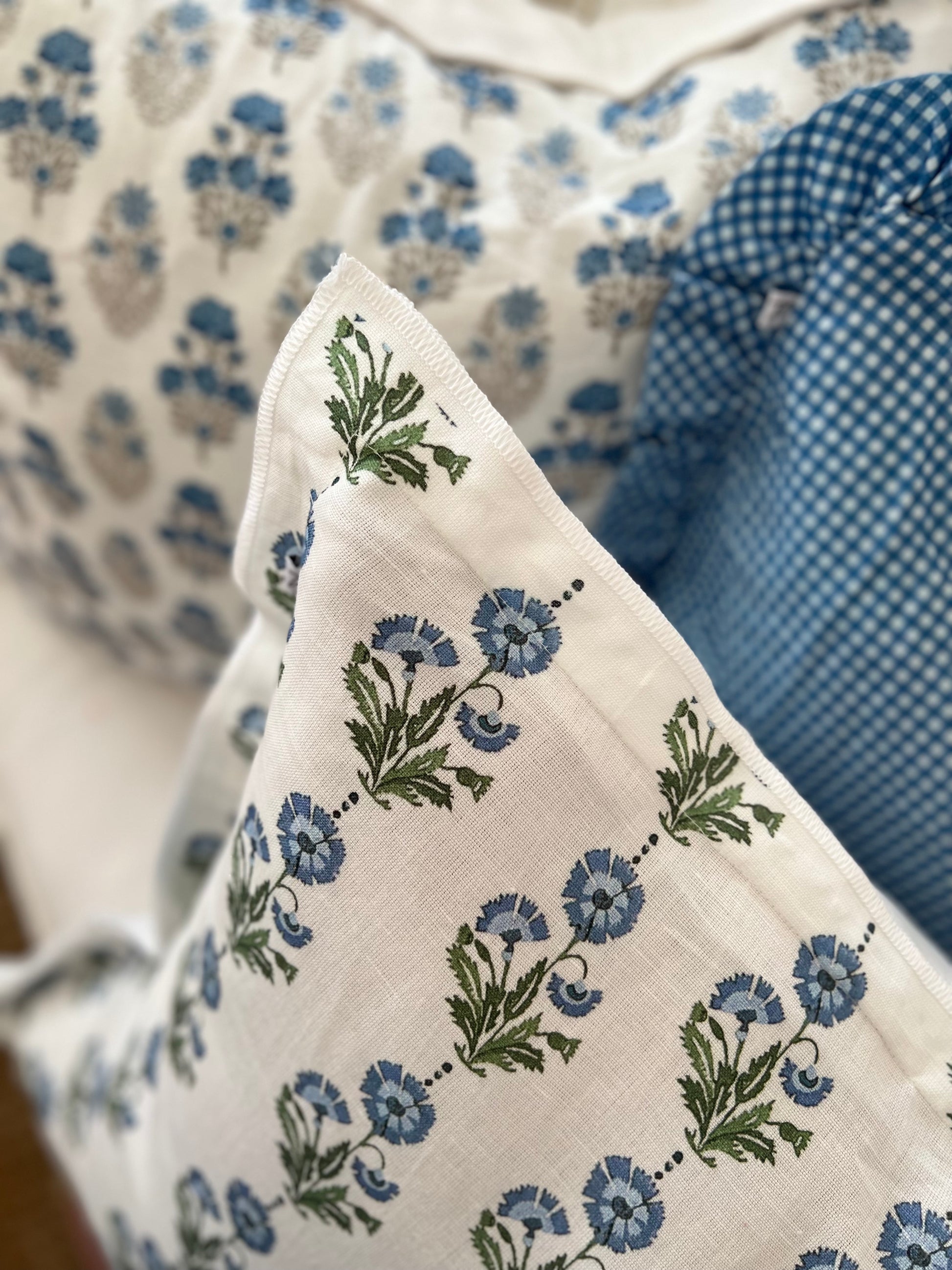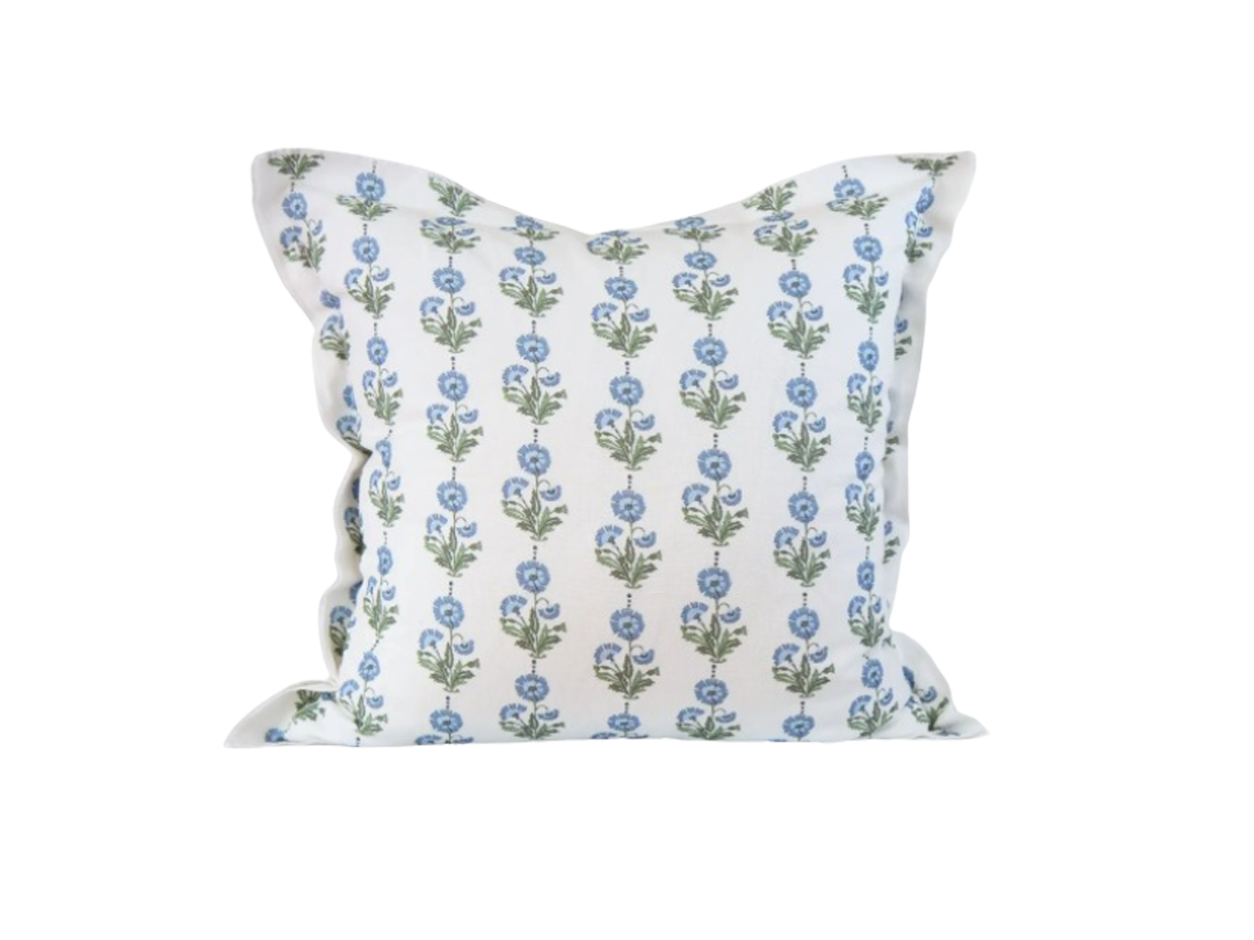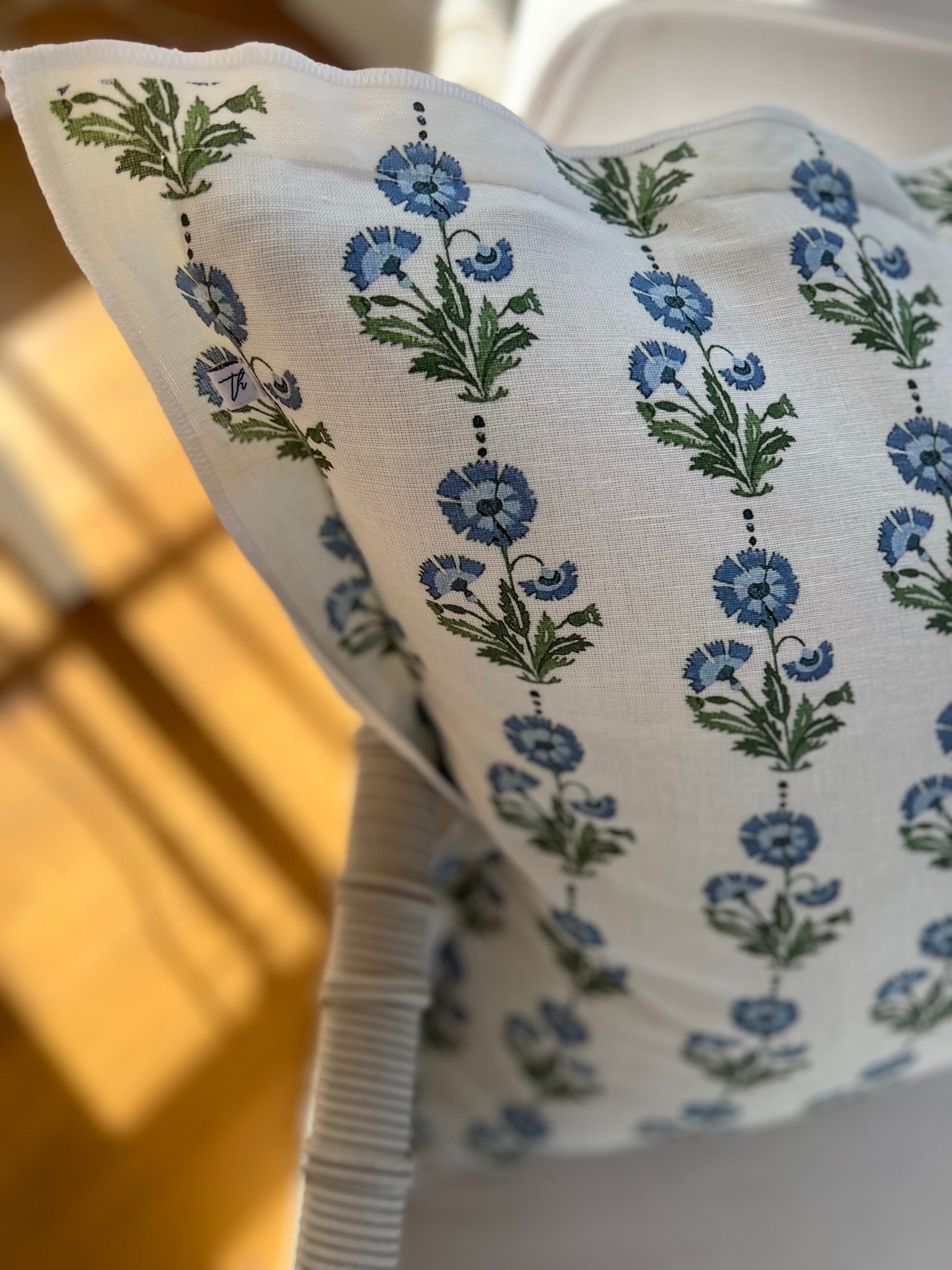 Introducing our Amalthea Linen Block Print Pillow Cover from Tajik Home. Inspired by vintage Indian designs, this meticulously crafted piece seamlessly blends traditional elegance with modern flair. Each intricate detail is carefully curated, drawing from historic art found in old wallpaper books, vintage homes, and antique marketplaces. Tajik Home has infused vibrant, modern colors to breathe new life into classic patterns, ensuring a perfect blend of timeless charm and contemporary style. Featuring a captivating blue and white floral print, it evokes serene coastal vibes and effortlessly complements our coastal collection. Its versatile design allows for effortless mixing, matching, and layering with other pillows from our collection, empowering you to create your own unique aesthetic with ease.