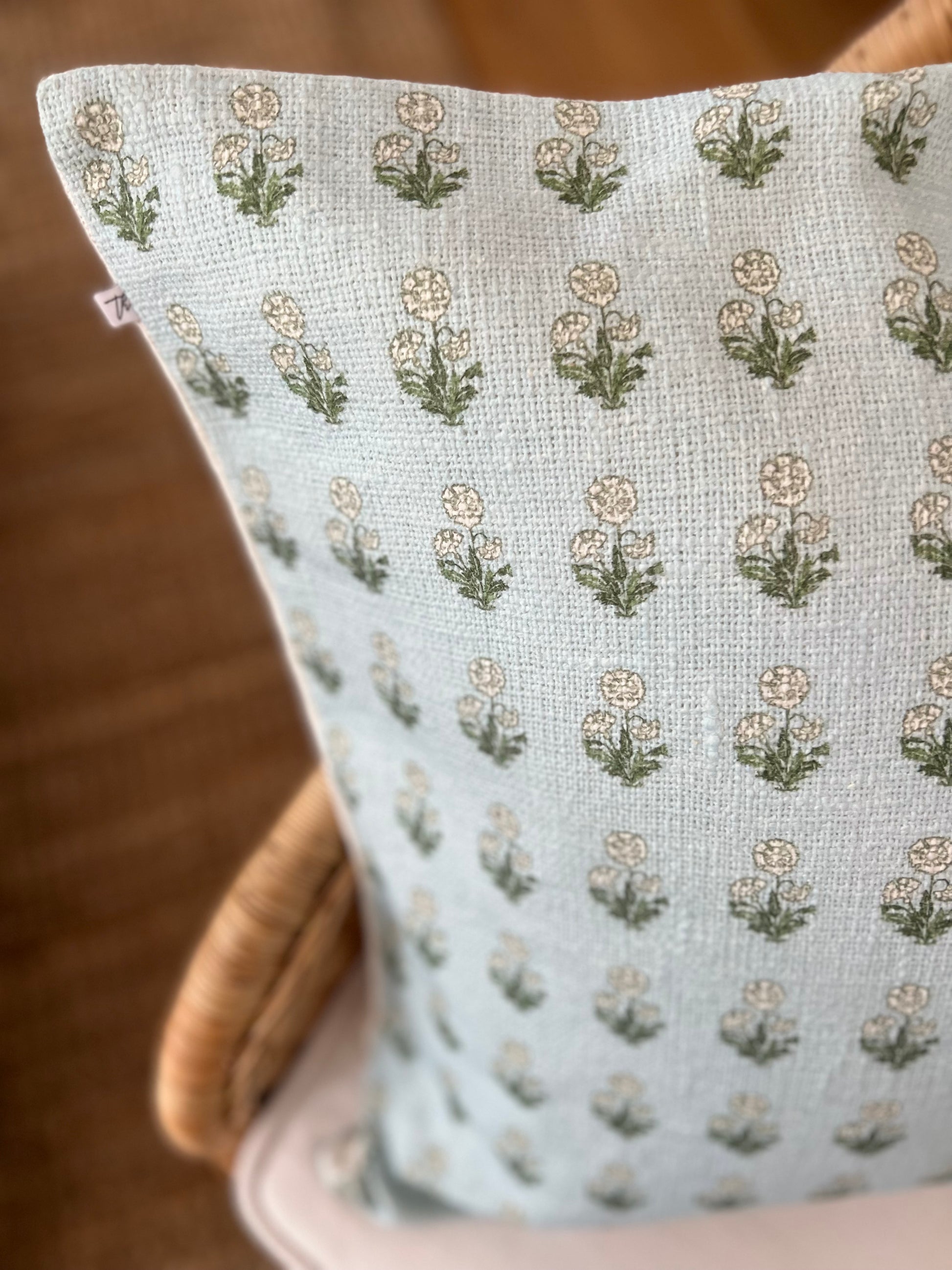 Introducing our Arabella Block Print Pillow Cover from Tajik Home. Inspired by vintage Indian designs, this meticulously crafted piece seamlessly blends traditional elegance with modern flair. Each intricate detail is carefully curated, drawing from historic art found in old wallpaper books, vintage homes, and antique marketplaces. Tajik Home has infused vibrant, modern colors to breathe new life into classic patterns, ensuring a perfect blend of timeless charm and contemporary style. Featuring a captivating blue and white floral print, it evokes serene coastal vibes and effortlessly complements our coastal collection. Its versatile design allows for effortless mixing, matching, and layering with other pillows from our collection, empowering you to create your own unique aesthetic with ease.