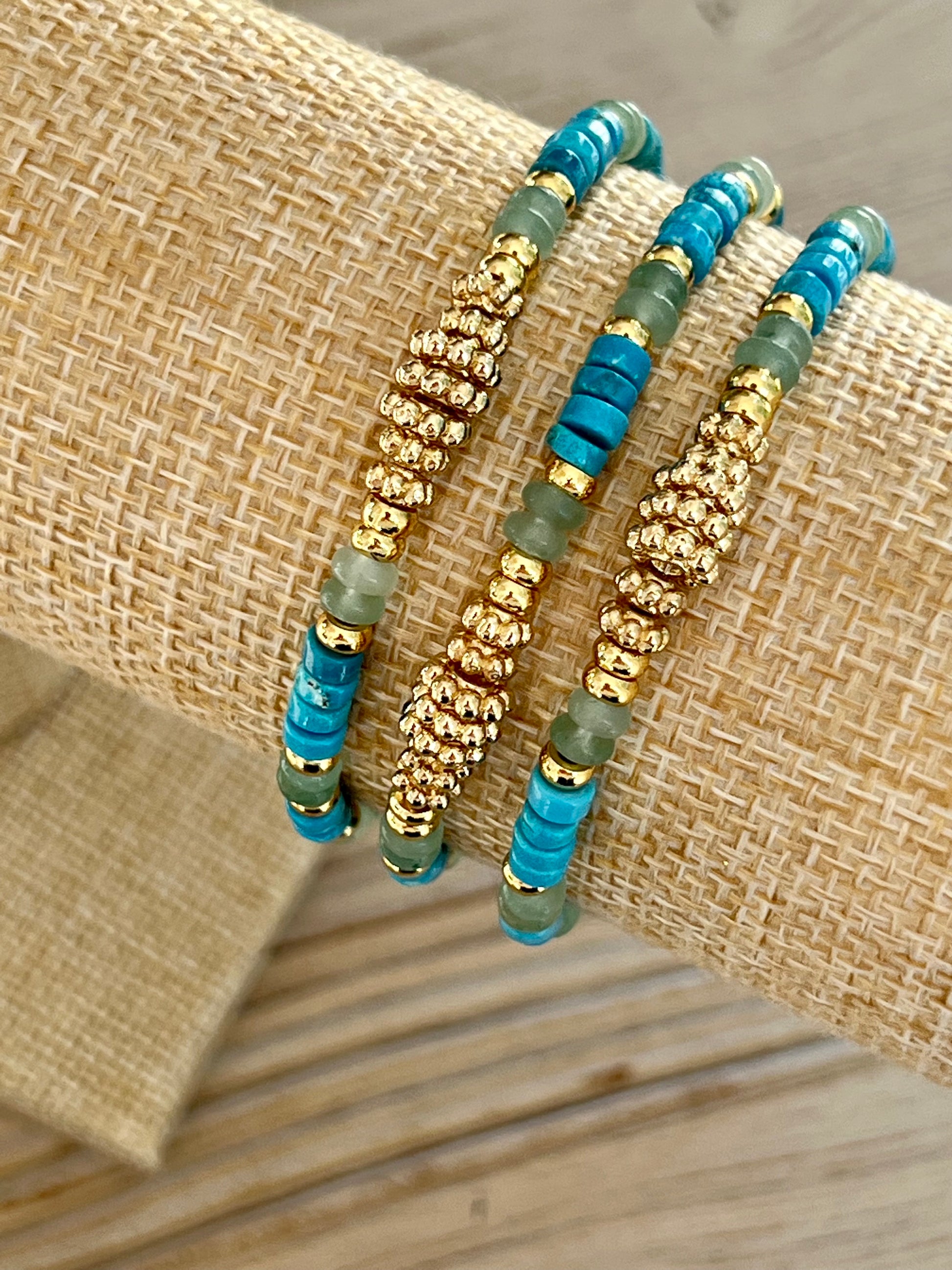 Details: Crafted with precision, it features Heishi polymer beads, elegant gemstones, and golden brass washers for a harmonious blend of style.