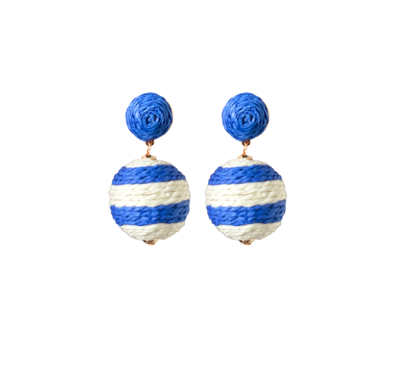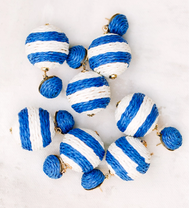 Inspired by the classic beach clubs of the Italian Riviera! The on-trend “Lido” is a fun way to embrace the bon bon and pom-pom earring trend. Navy blue and white wrapped raffia beads create a flattering silhouette that instantly transforms dresses and tops for summer!
