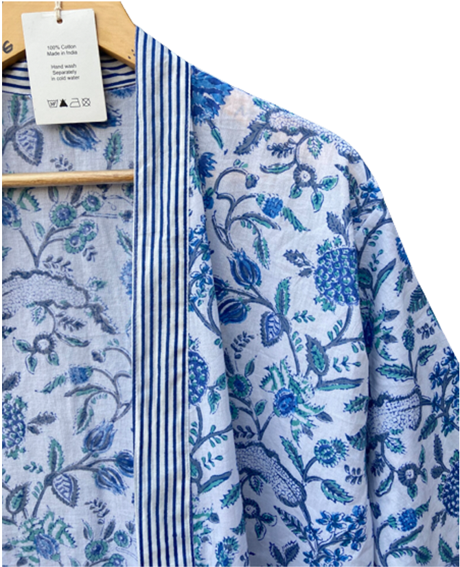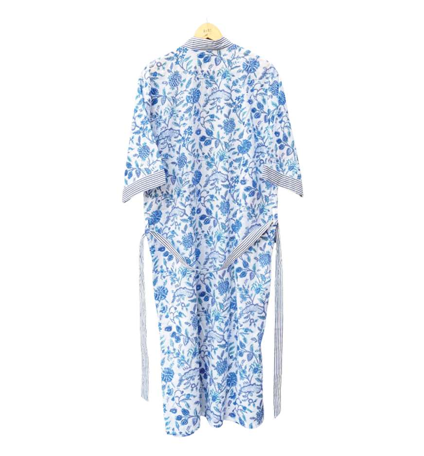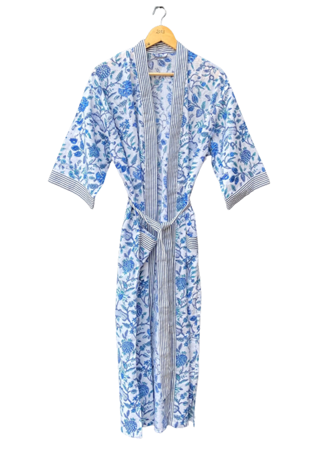 Our cotton kimono robes are perfect for lounging around the home or at the beach or for a bridal shower. The block print floral robe features 3/4th sleeves, a waist tie and two front pocket.