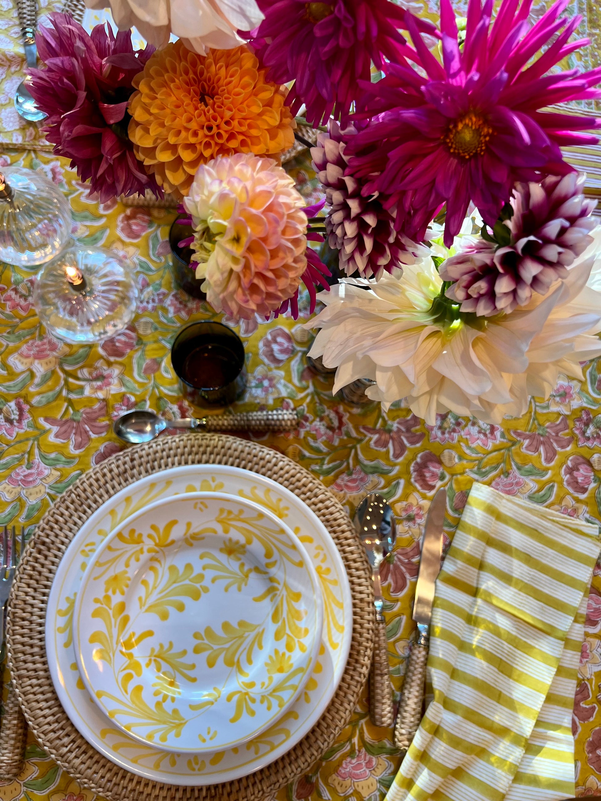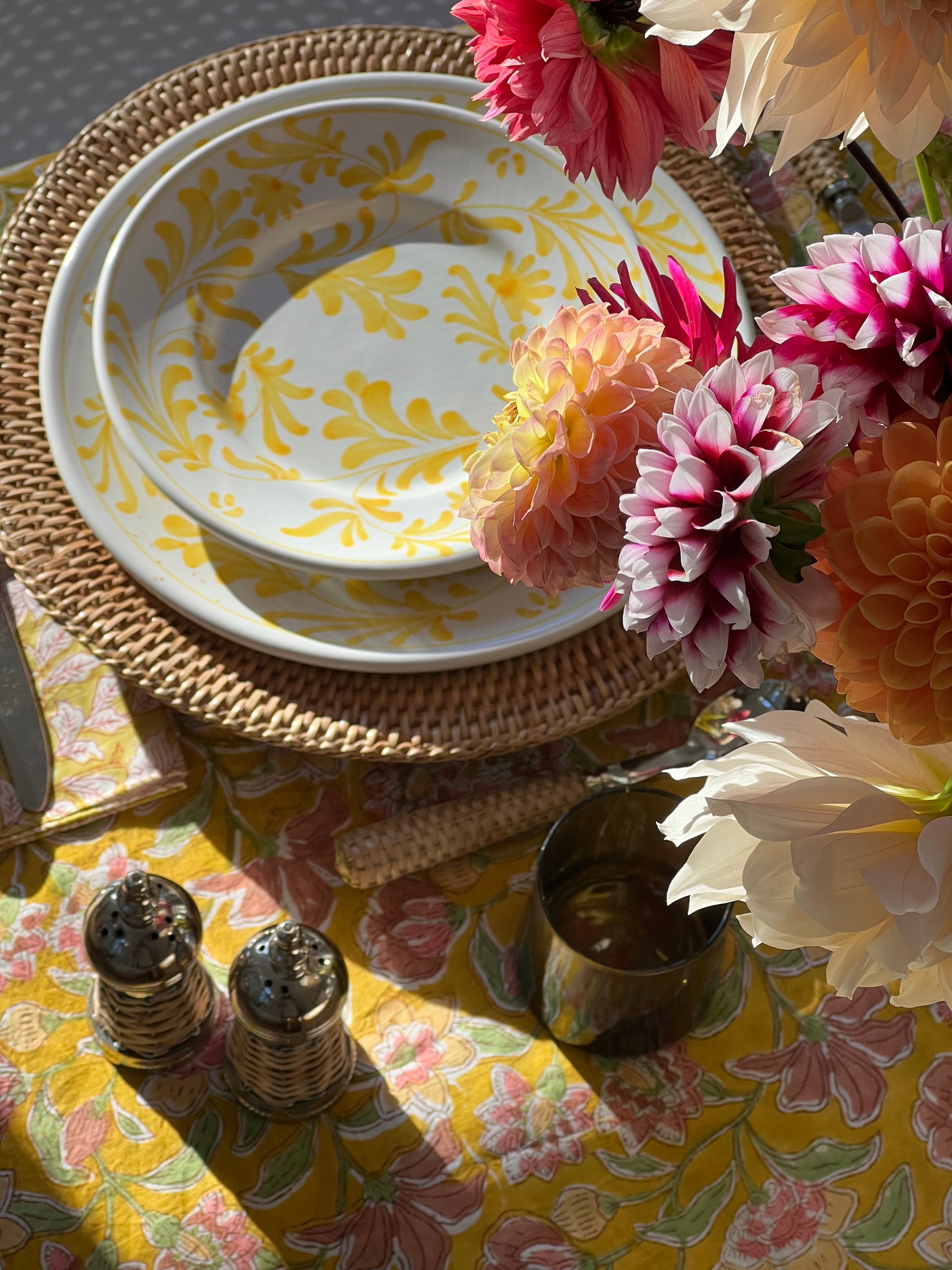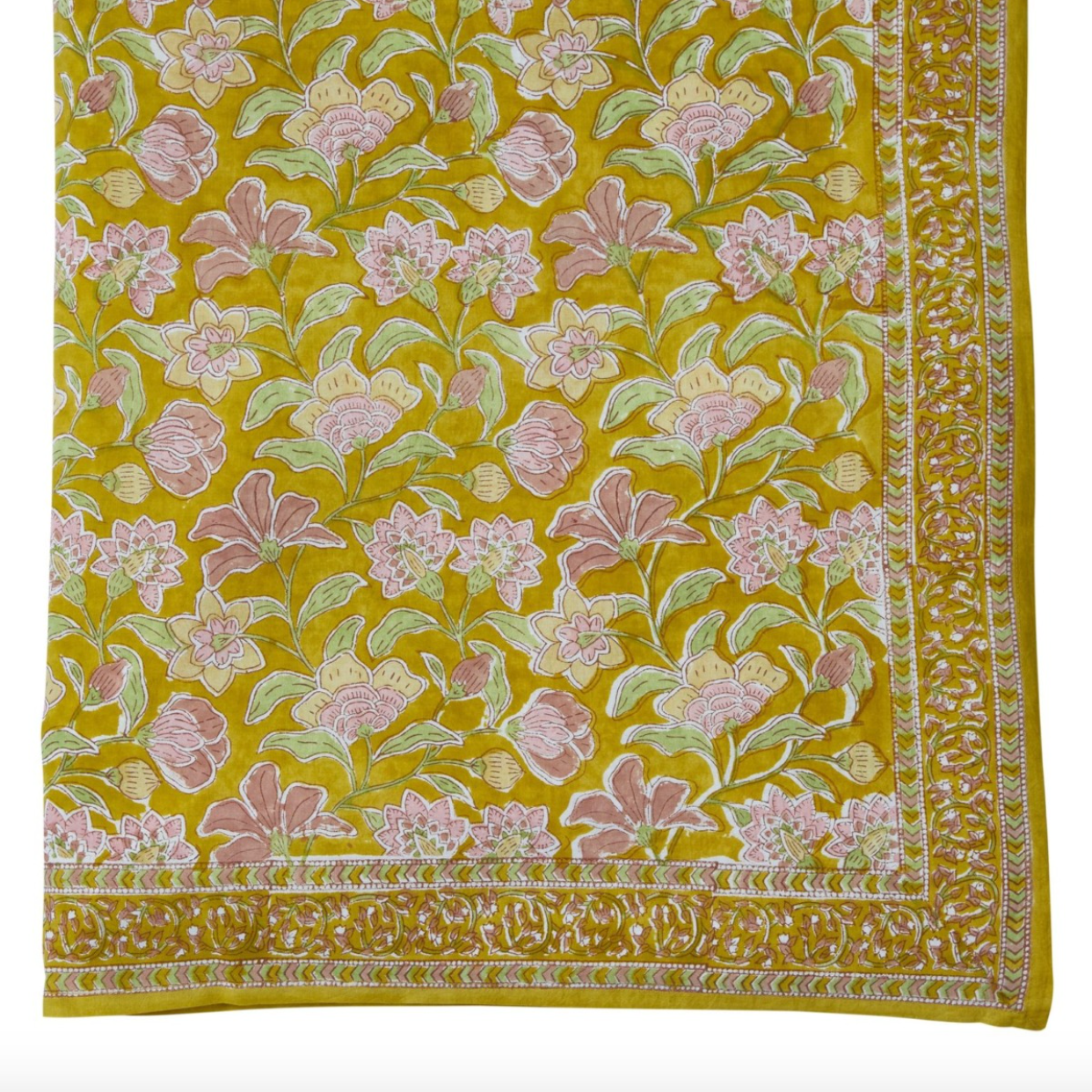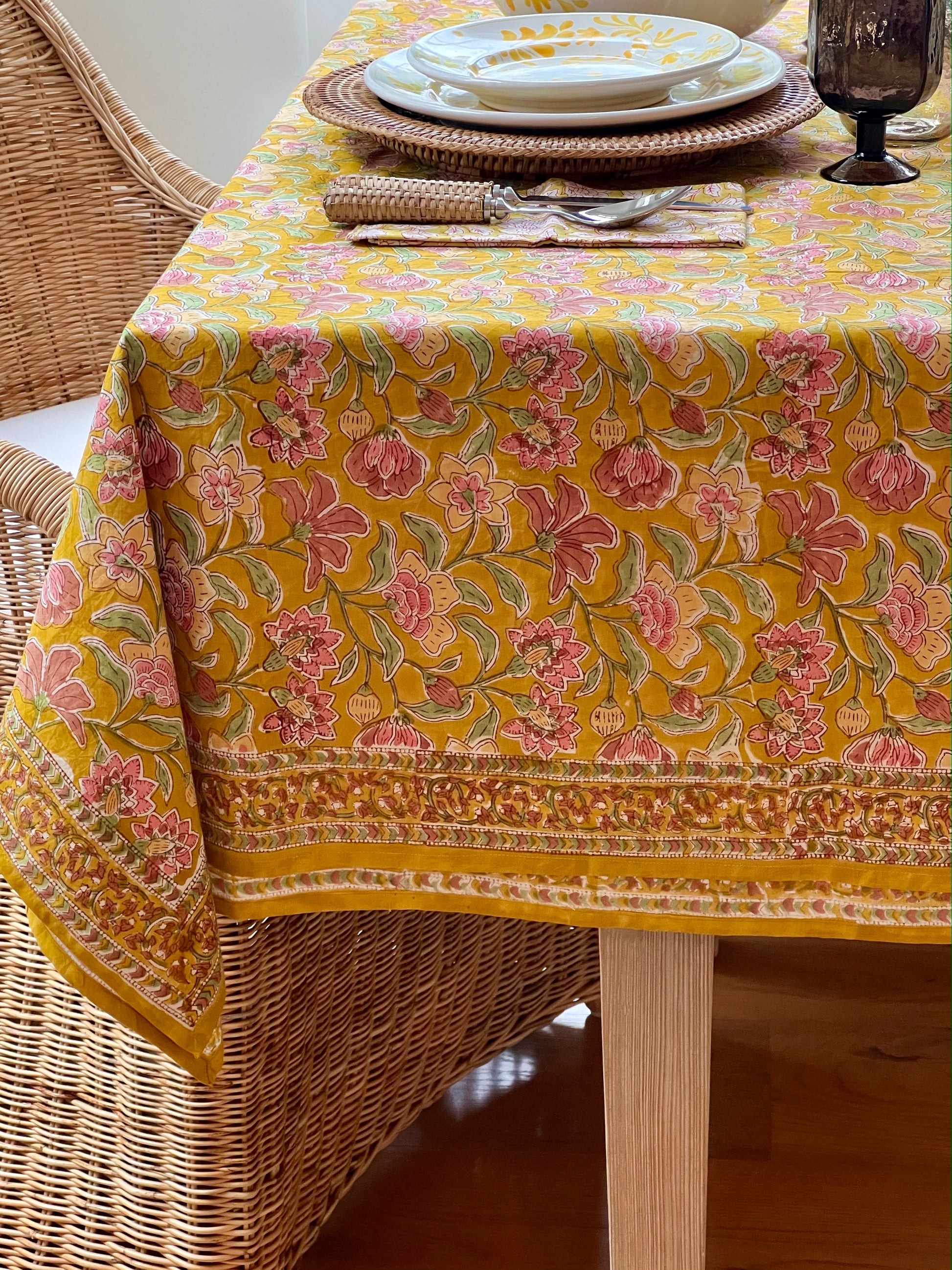Our Bohemian saffron tablecloth with floral prints was designed by a team of French stylists and then hand-printed by artisans in Jaipur using the traditional technique of hand-carved wooden block stamps. The vibrant saffron color palette will add a lively touch to your summer moments with family and friends.