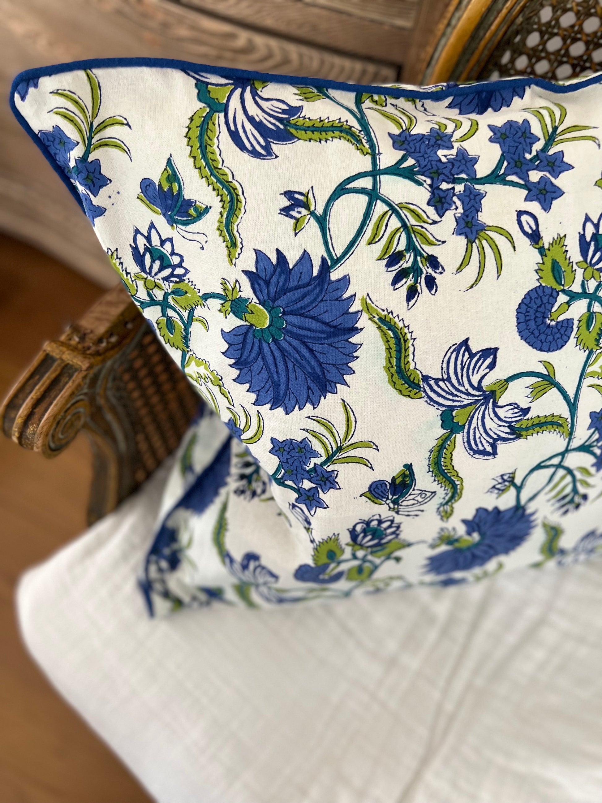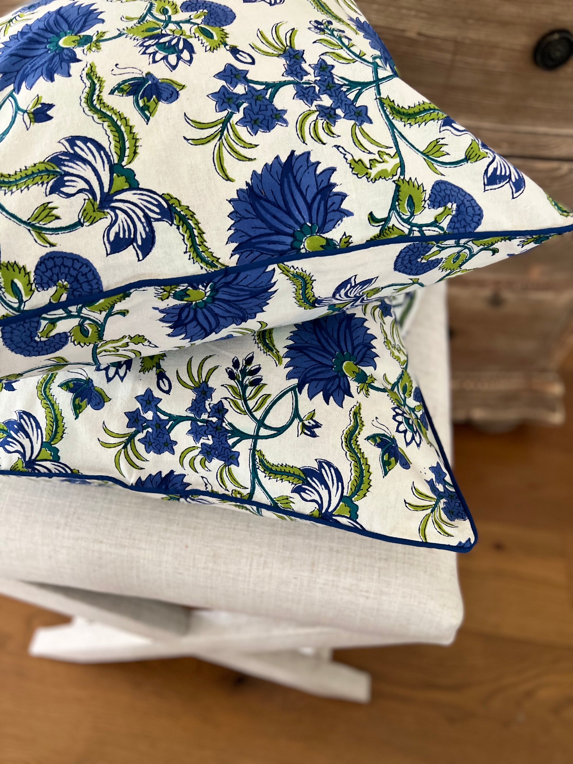 Enhance the comfort and style of your sofa or bed with our Cape Cod cushion covers in Klein Blue and green, designed to embody the essence of coastal living. Crafted with utmost care from high-quality cotton, these covers offer a soft and luxurious feel while ensuring durability to withstand daily use. Hand block printed on both sides, they showcase intricate designs that add a touch of artistry to your space. With neatly tailored stitching from the inside and a convenient zip closure, these covers are easy to use and maintain.