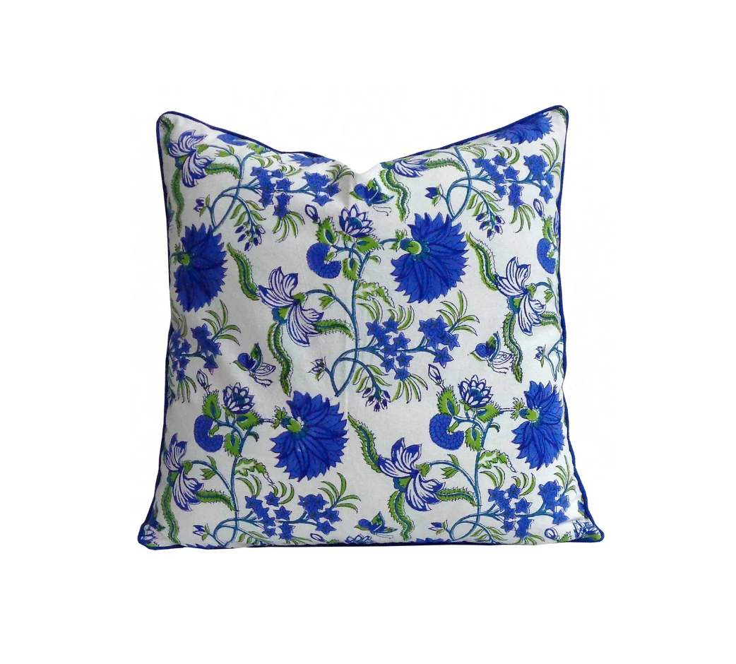 Cape Cod Klein Blue and Green Floral Pillow with Piping