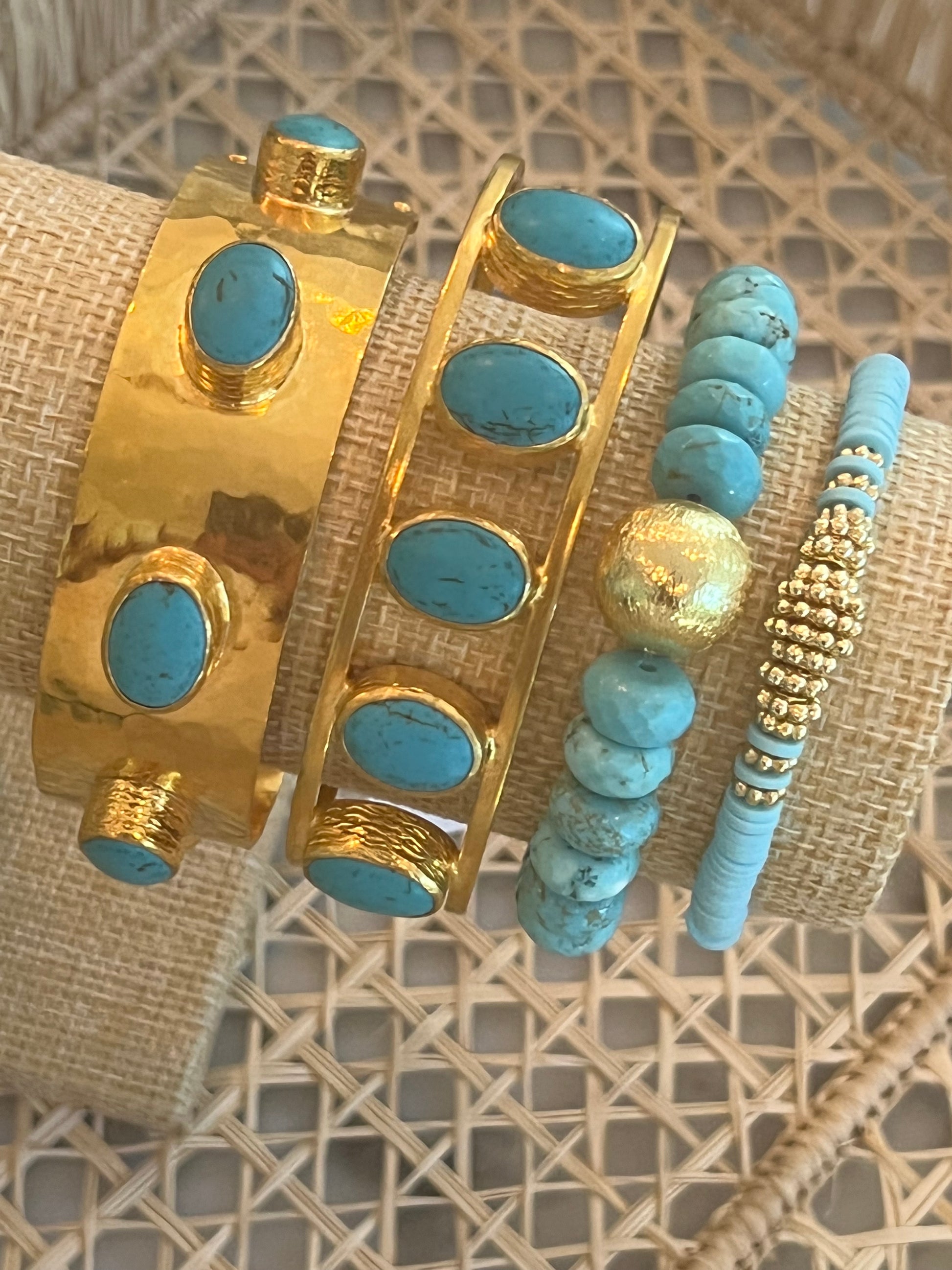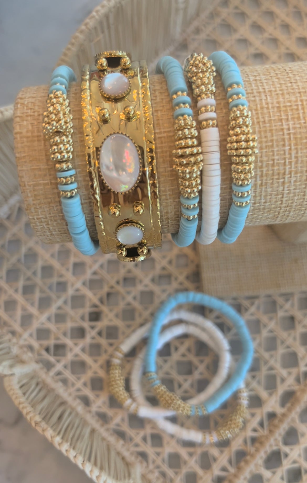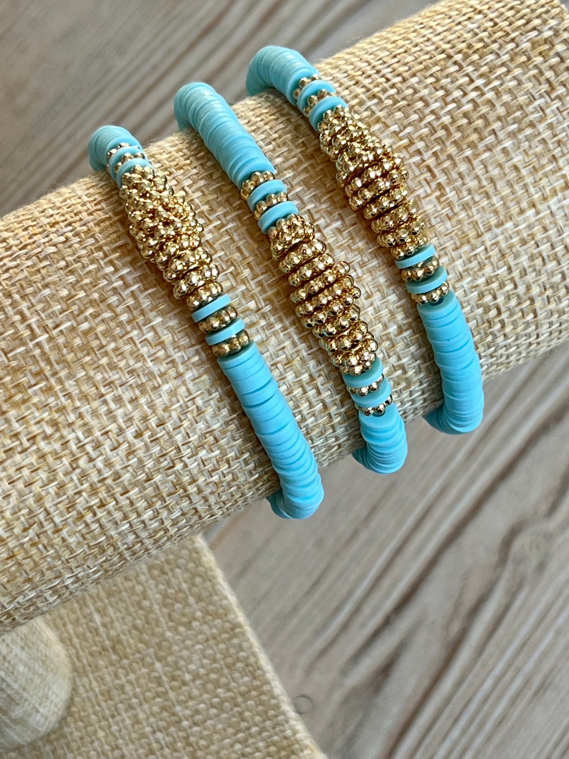 Composition: Sky Blue Polymer Heishi beads dyed with golden brass beads.