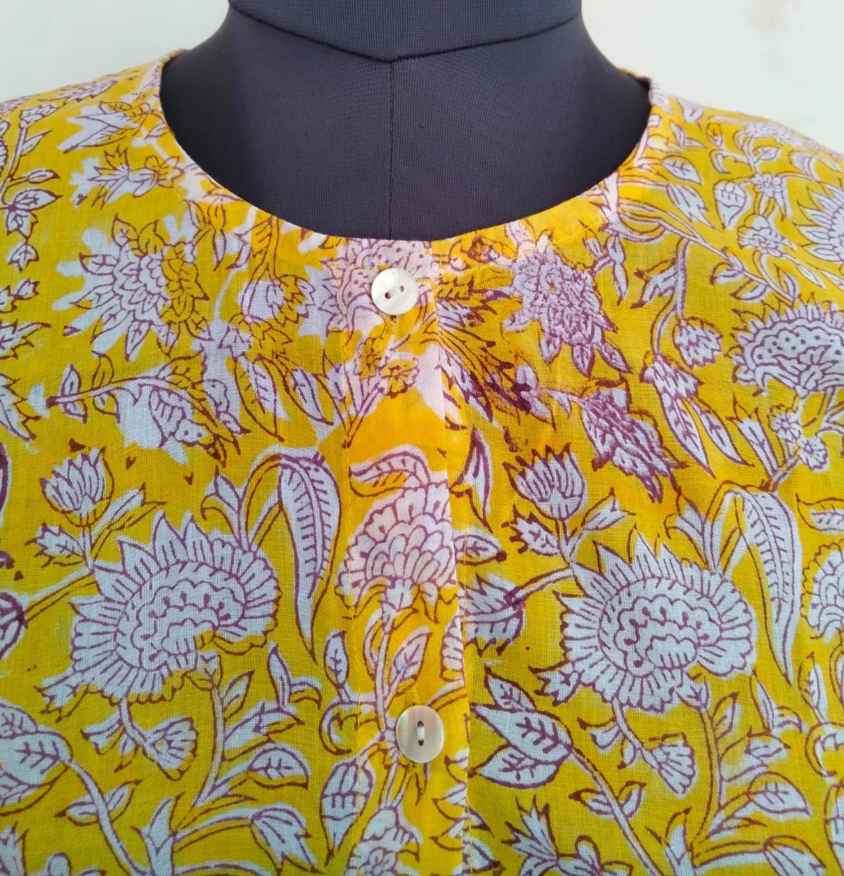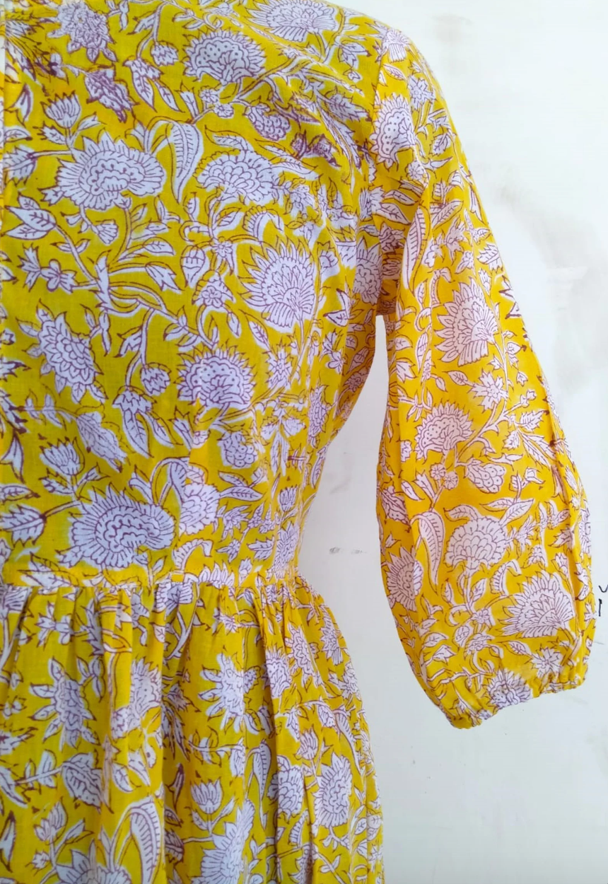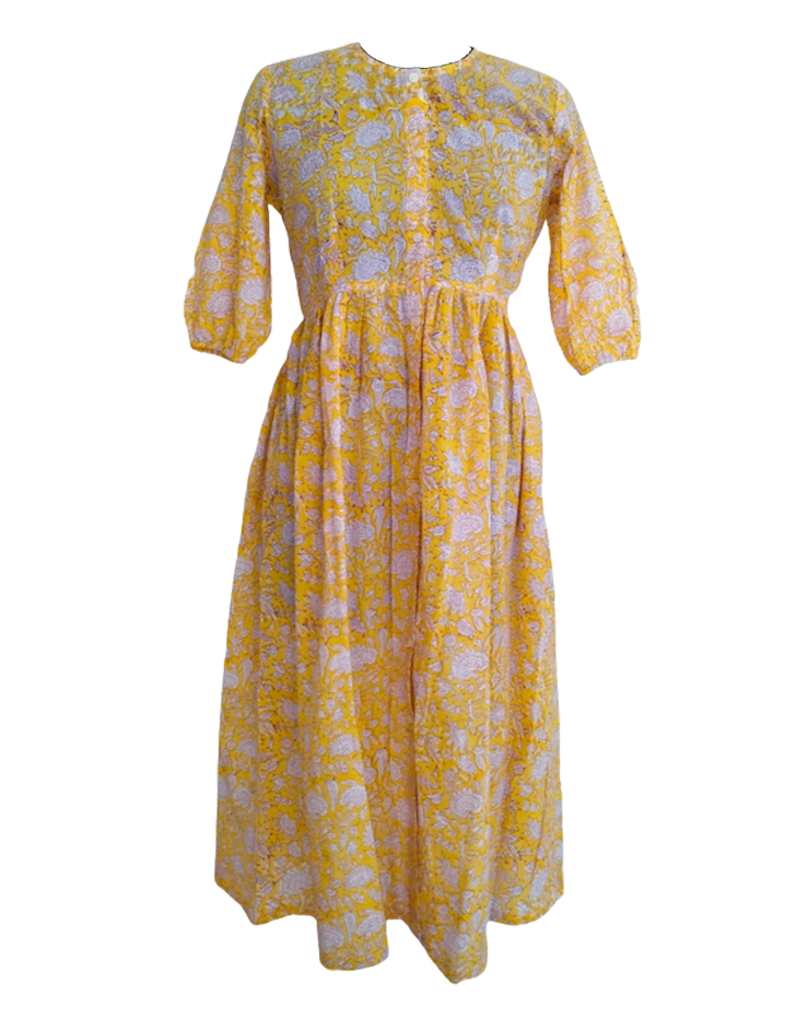 This elegant and sunny, handmade, block printed, yellow floral dress is a perfect choice for the summer. Made from 100% cotton, it looks equally great whether going to the beach or strolling out for dinner, evening drinks and garden parties.