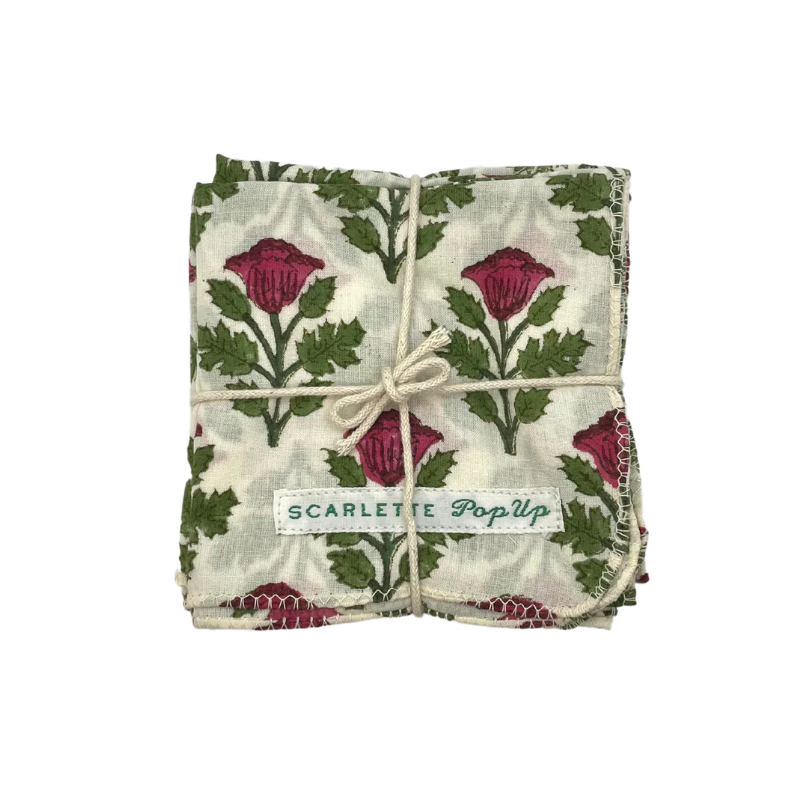 Set of 4 lovely floral napkins in crimson red, white and green.