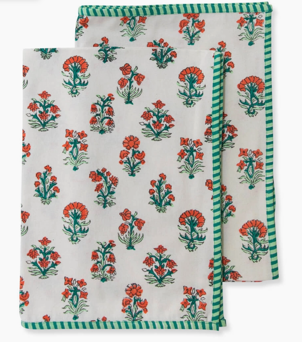 Chic and timeless, these pretty blockprint kitchen towels elevate the everyday and add a colorful charm to your kitchen or powder room.
