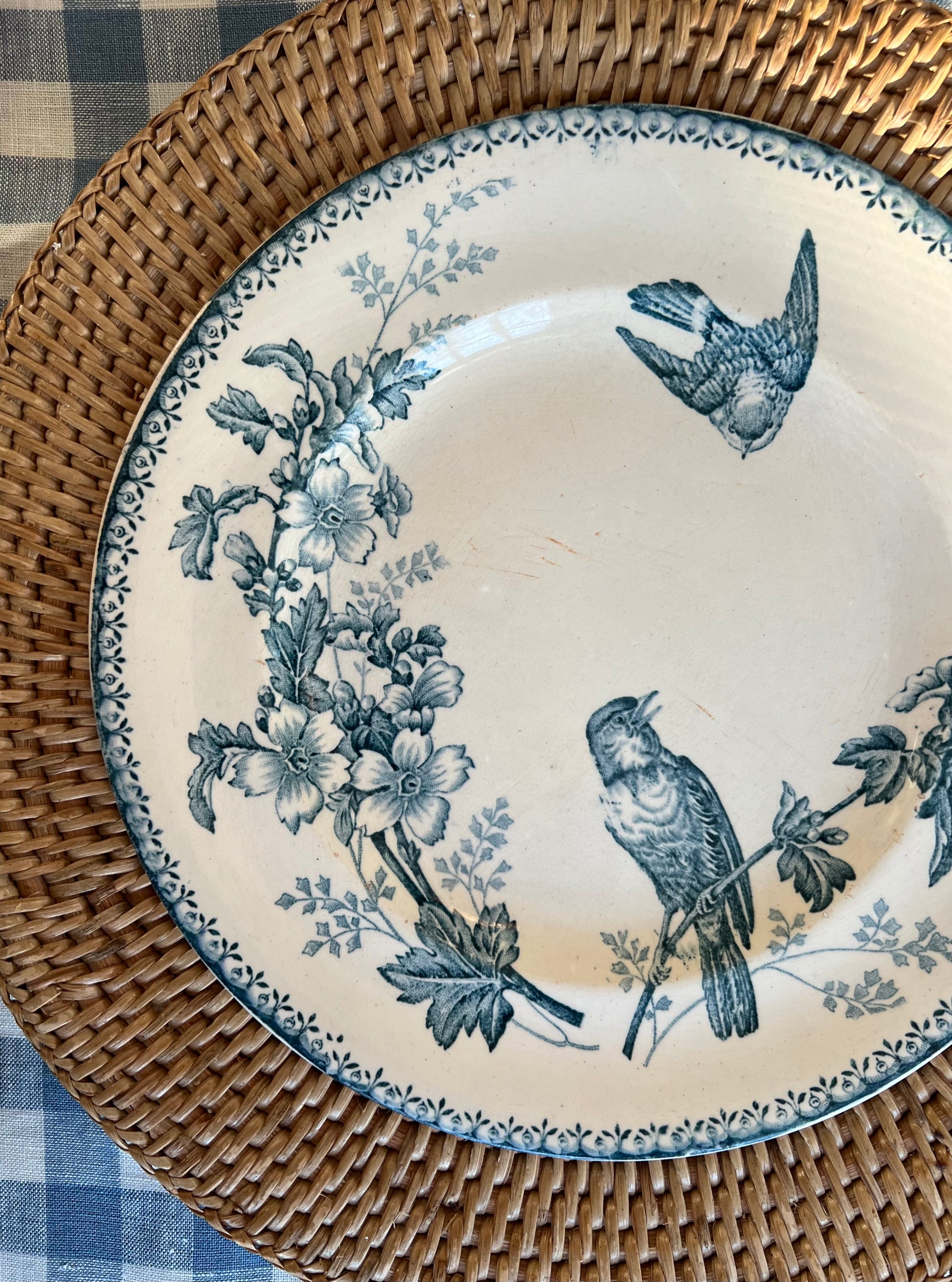 Step into the 19th-century splendor with our exquisite French 'Terre de Fer' collectible ironstone plate "Mésanges" by Longwy. Crafted with meticulous detail, this plate evoke timeless beauty despite small utensil marks on the surface.