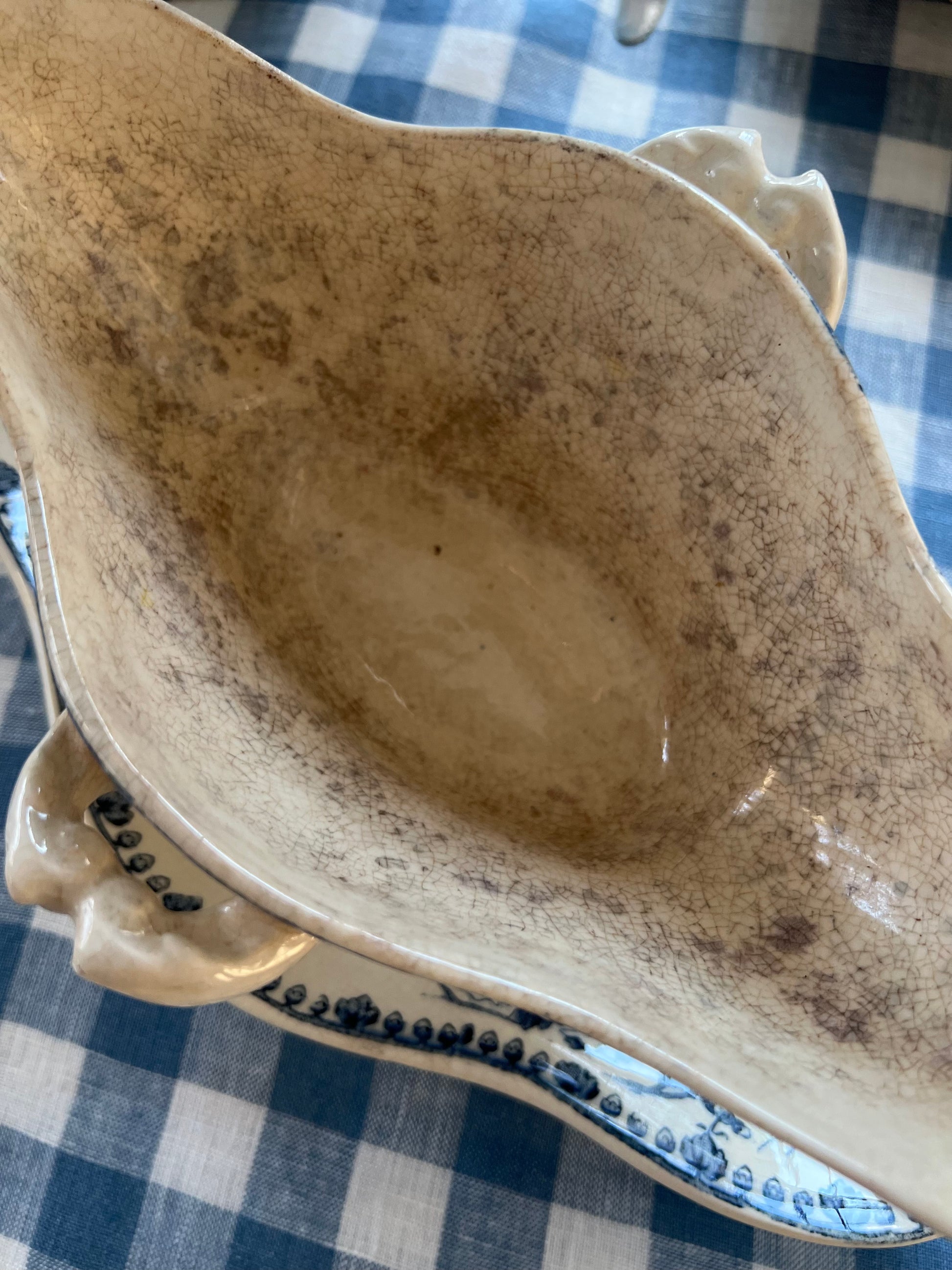 Experience 19th-century elegance with our exquisite French 'Terre de Fer' sauce boat. Despite the signs of aging, with a stained interior and a slight chip on the side, this model is full of French charm.