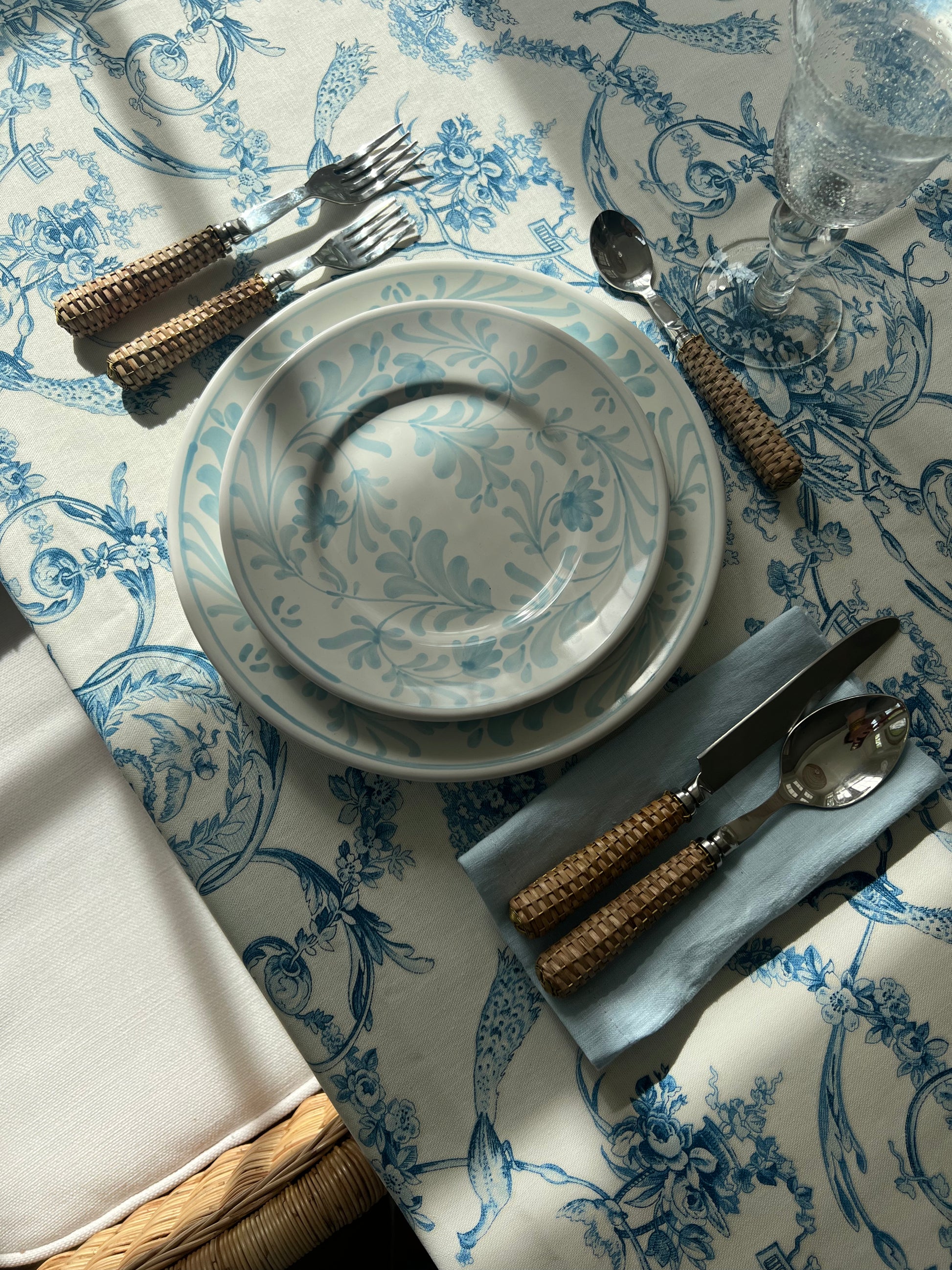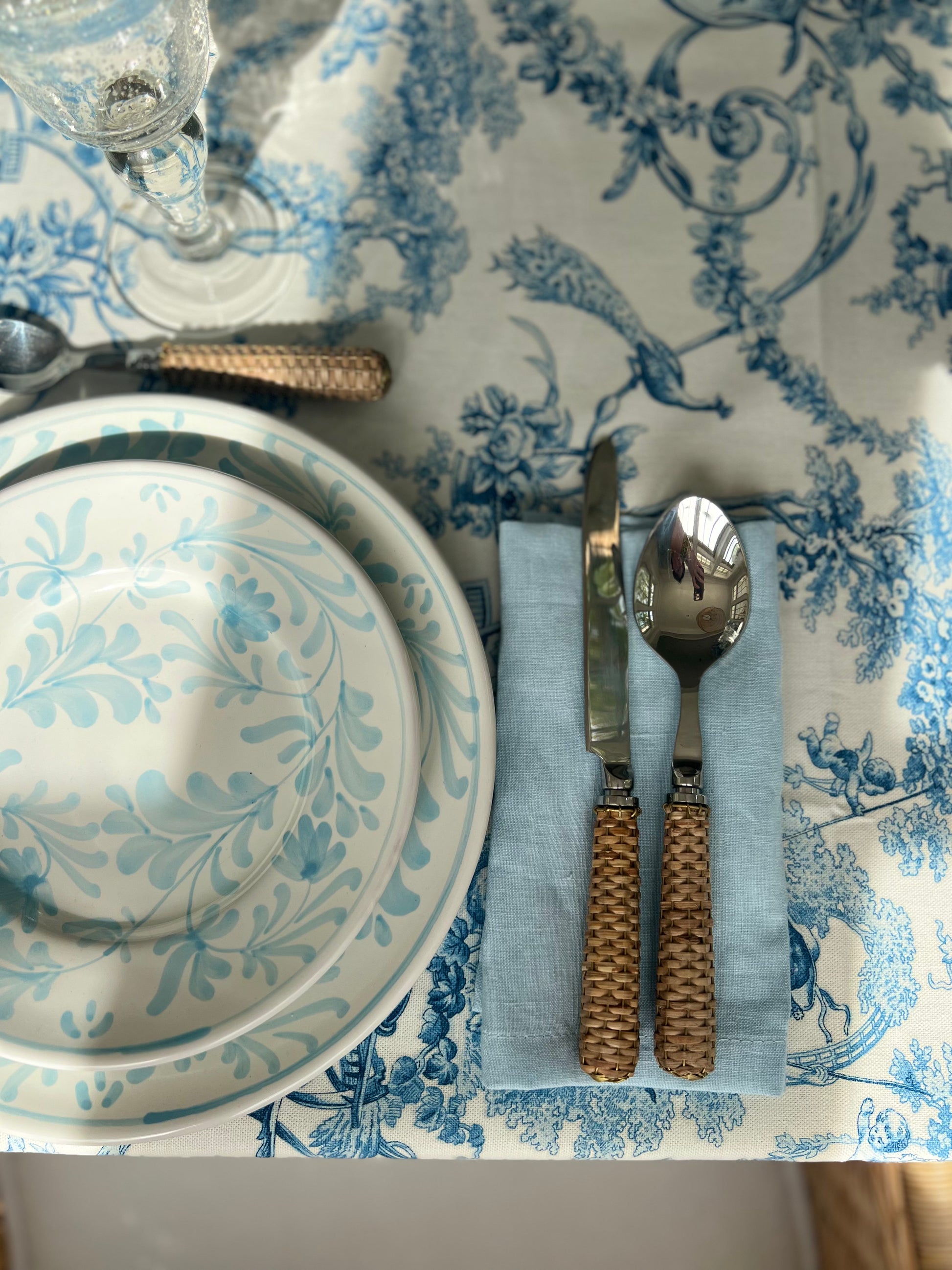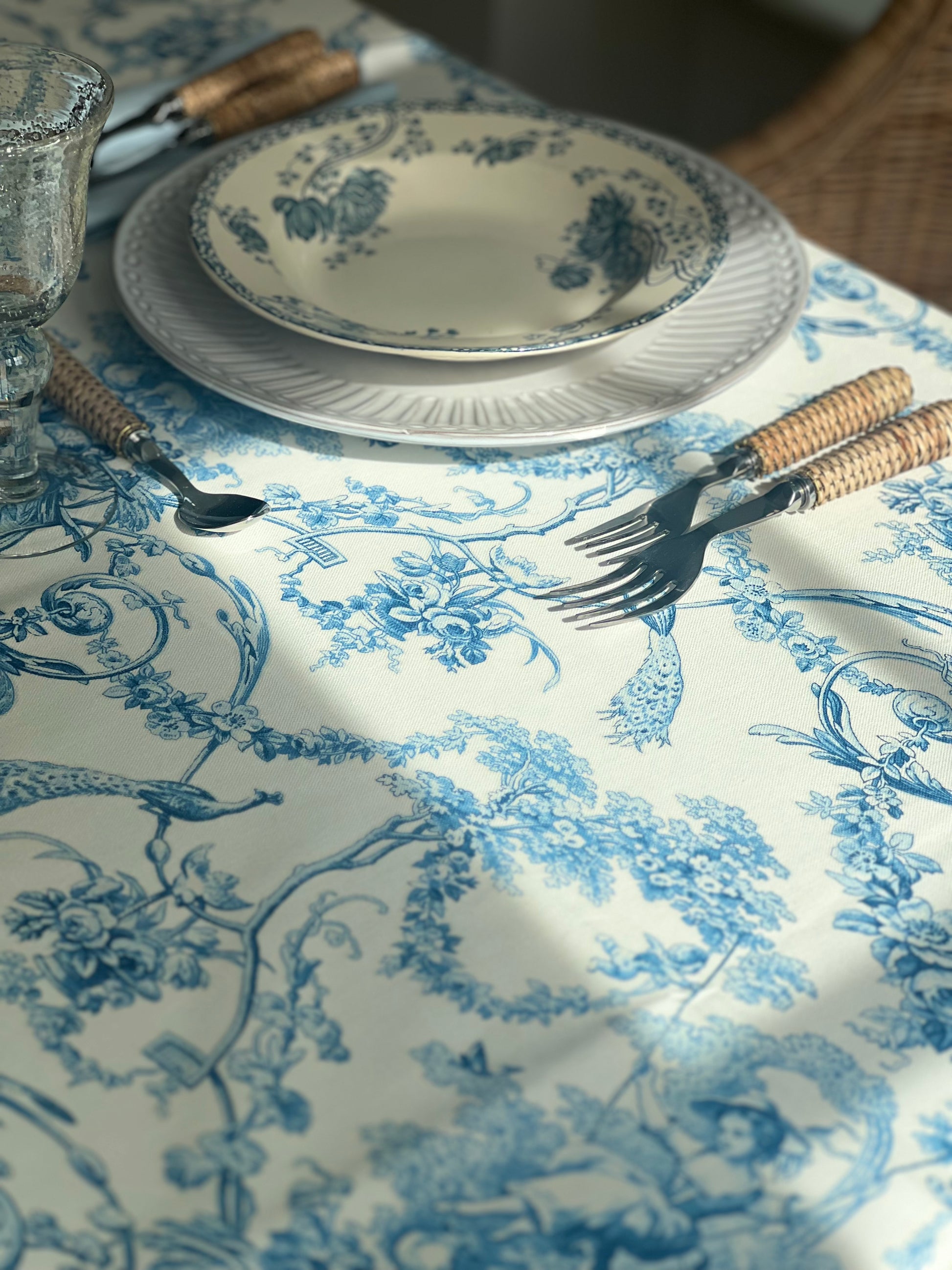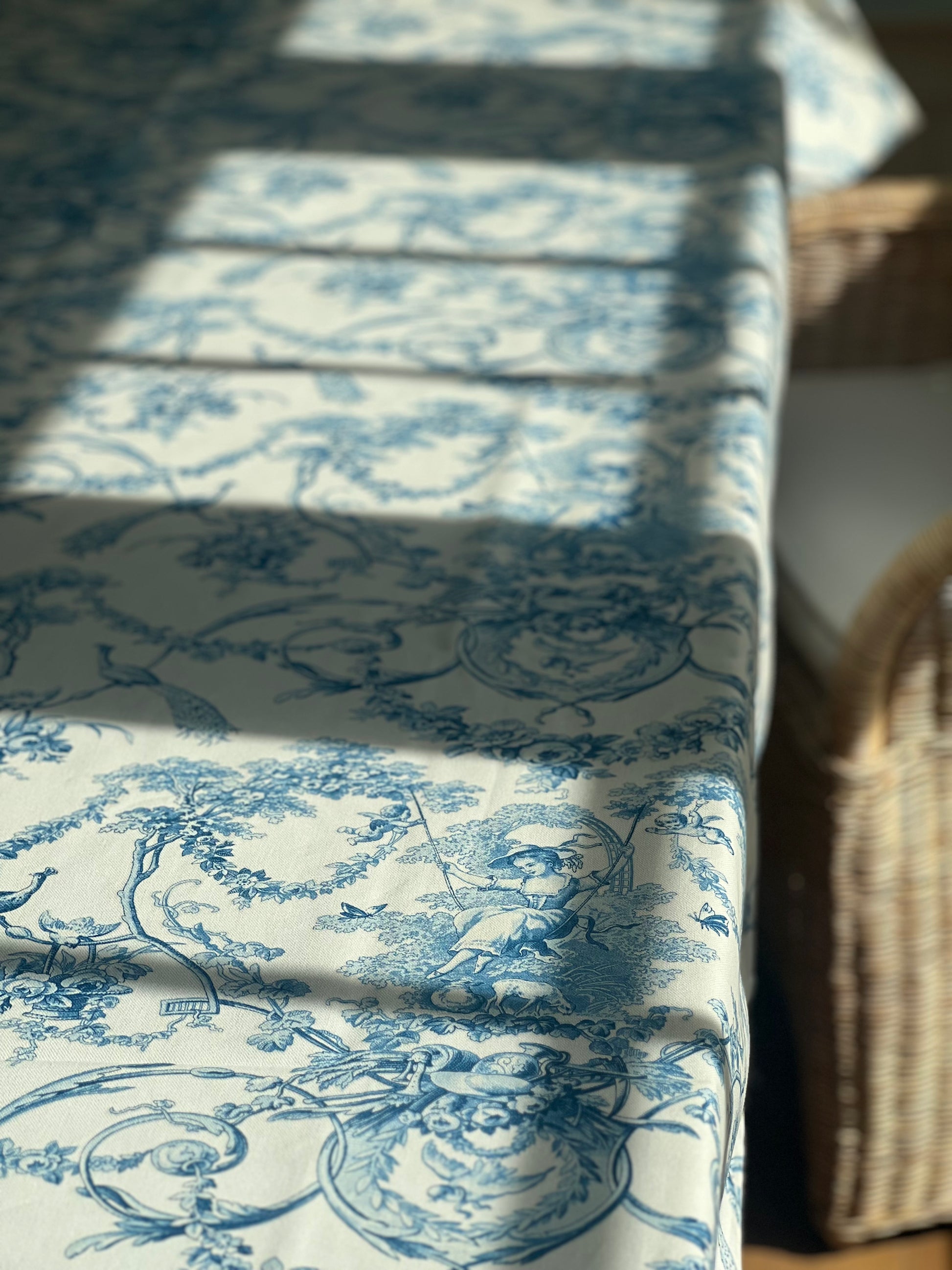 Handmade in Provence from 100% cotton, this elegant French blue toile tablecloth brings rustic charm and timeless style to your home. Featuring a classic pastoral pattern in blue tones, it’s perfect for both everyday dining and special occasions.