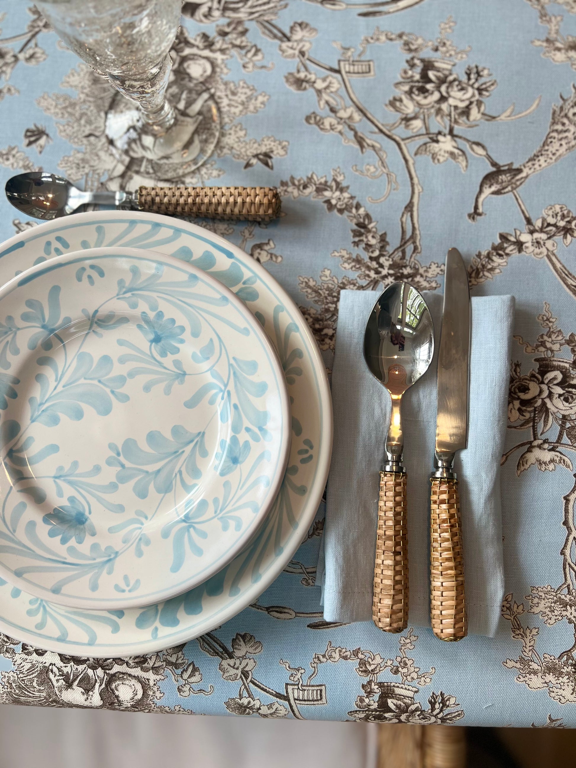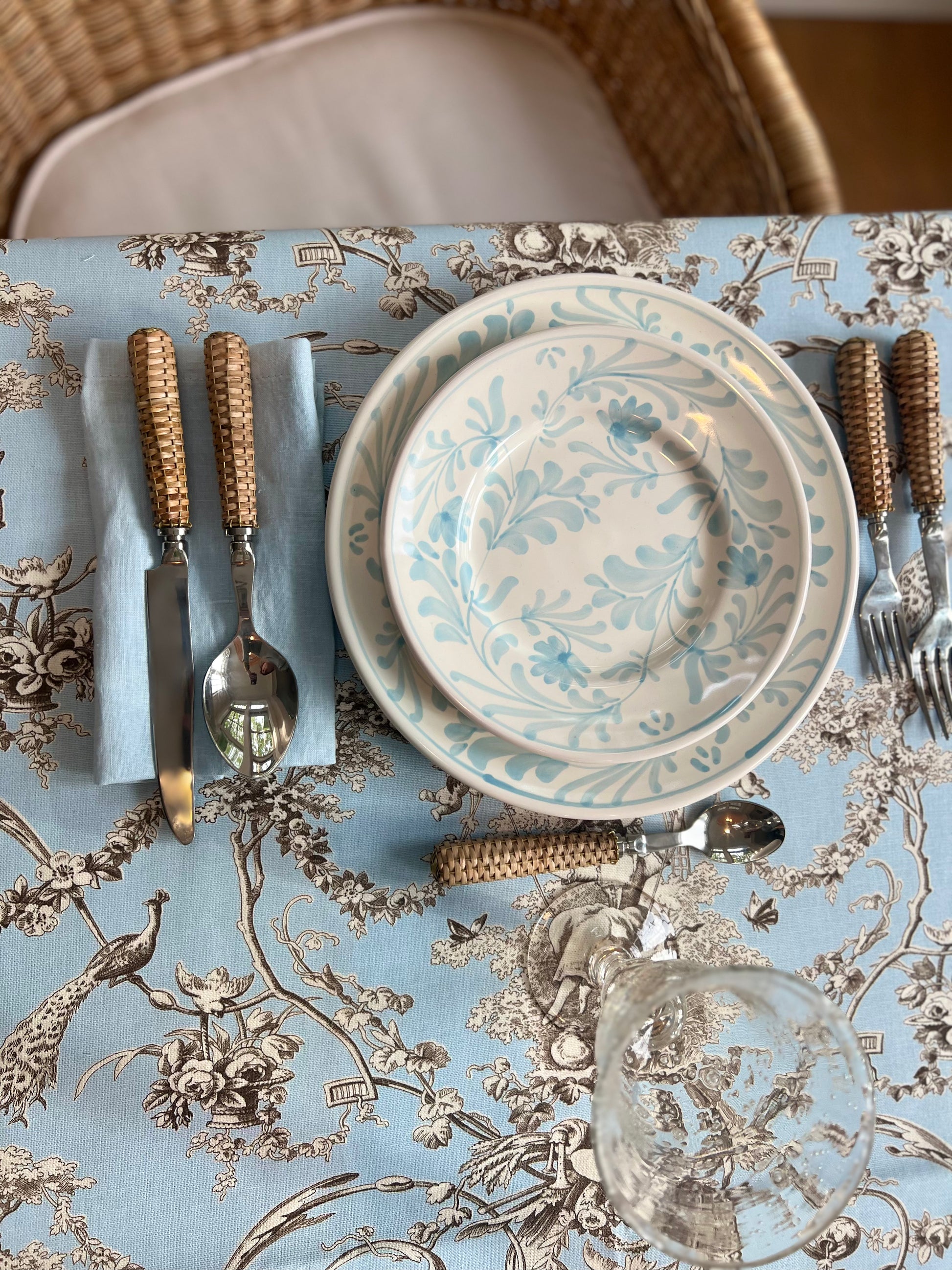Handmade in Provence from 100% cotton, this elegant French blue toile tablecloth brings rustic charm and timeless style to your home. Featuring a classic pastoral pattern in blue and brown tones, it’s perfect for both everyday dining and special occasions.