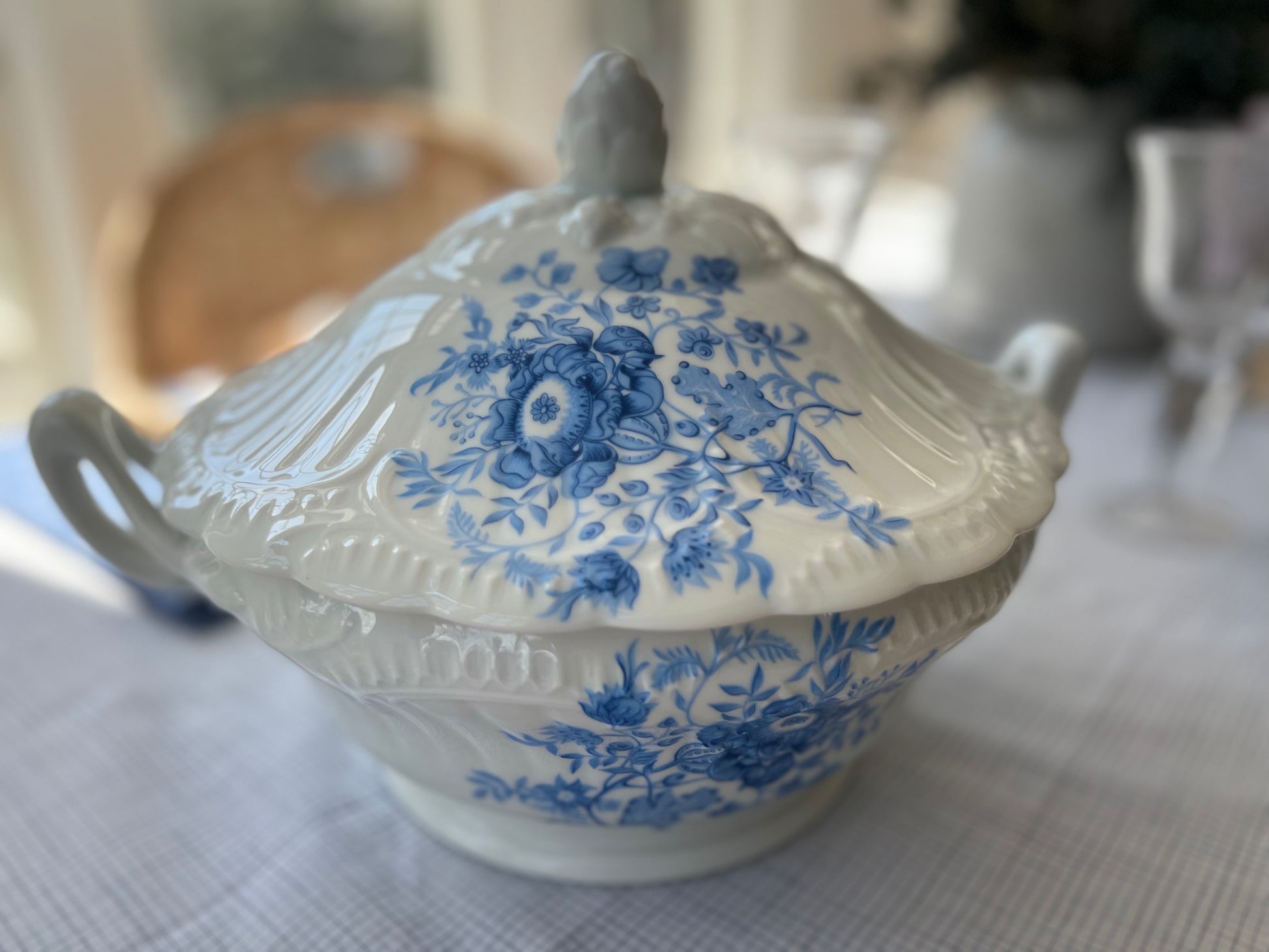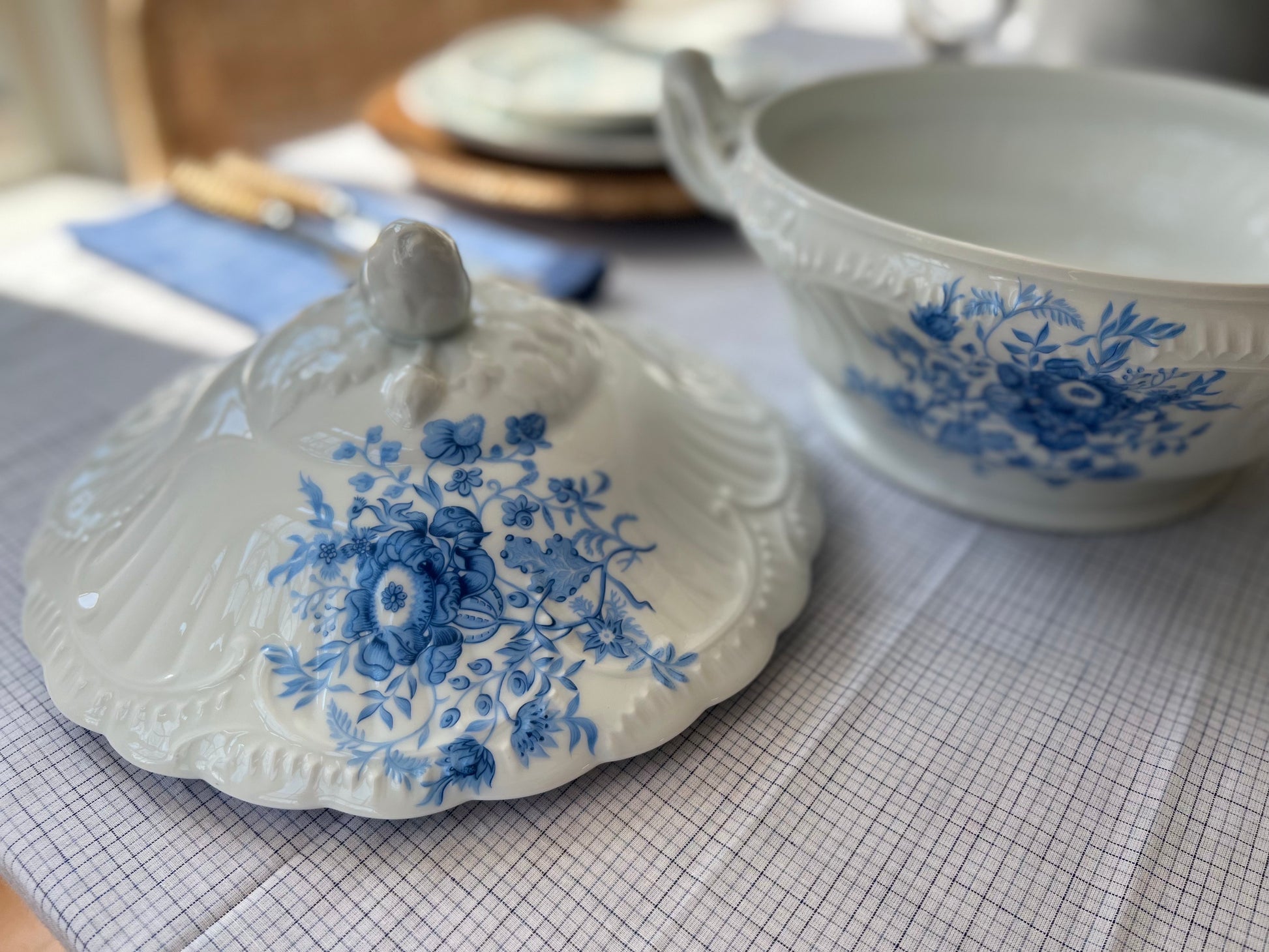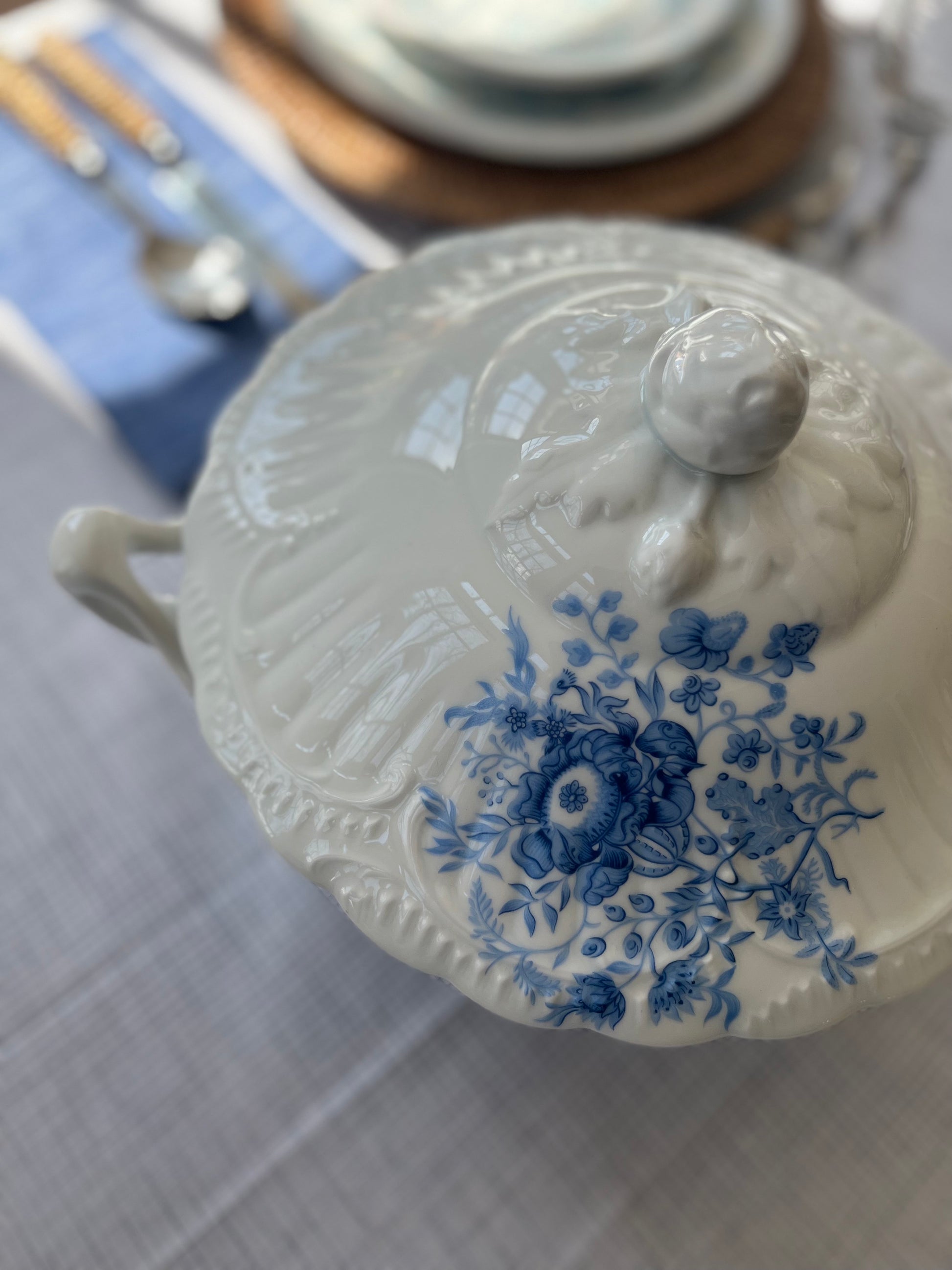 Introducing a timeless treasure from the renowned Limoges region: a magnificent vintage tureen that seamlessly blends French country aesthetics with a hint of seaside charm. Crafted from delicate porcelain, this exquisite piece exudes sophistication and charm, transporting you to the idyllic landscapes of the French countryside with its delicate blue flowers dancing across pristine white porcelain.