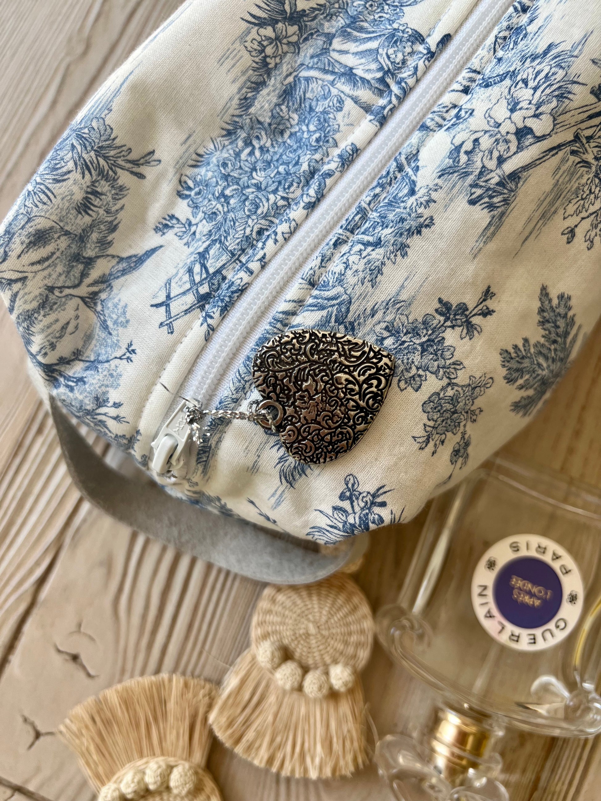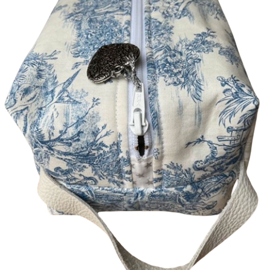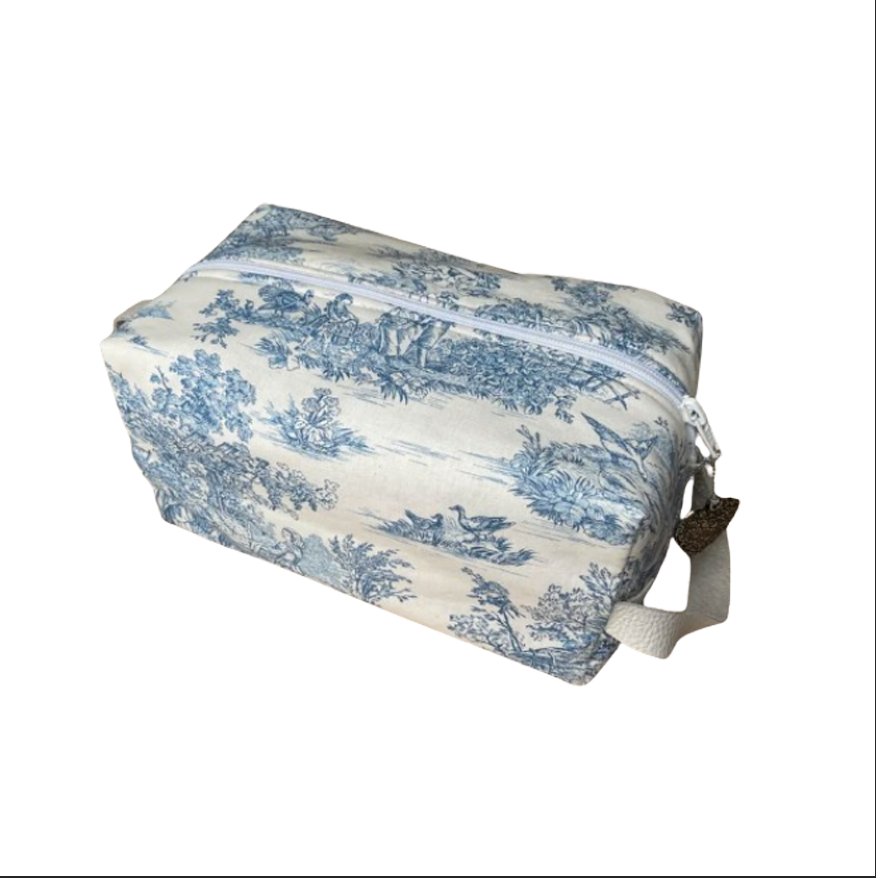 Crafted for chic and effortless travel, our toiletry or makeup pouch is the epitome of French elegance — a perfect gift for those spontaneous weekend escapes! Made from luxurious blue and cream toile de Jouy cotton fabric, delicately padded and lined, with genuine leather handles for added sophistication.