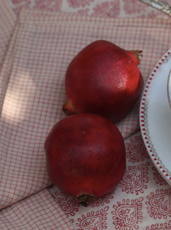 Made of red check cotton: it is spun and then woven by hand on wooden looms in South India. It is very soft and very light.