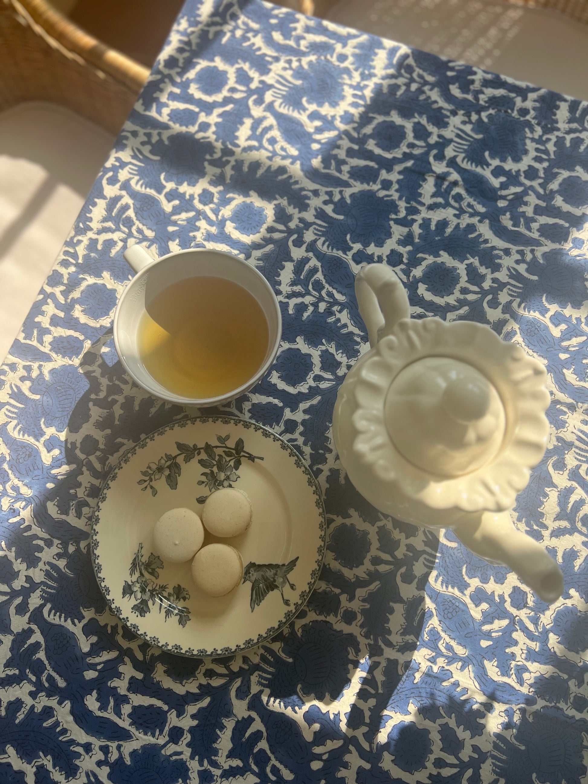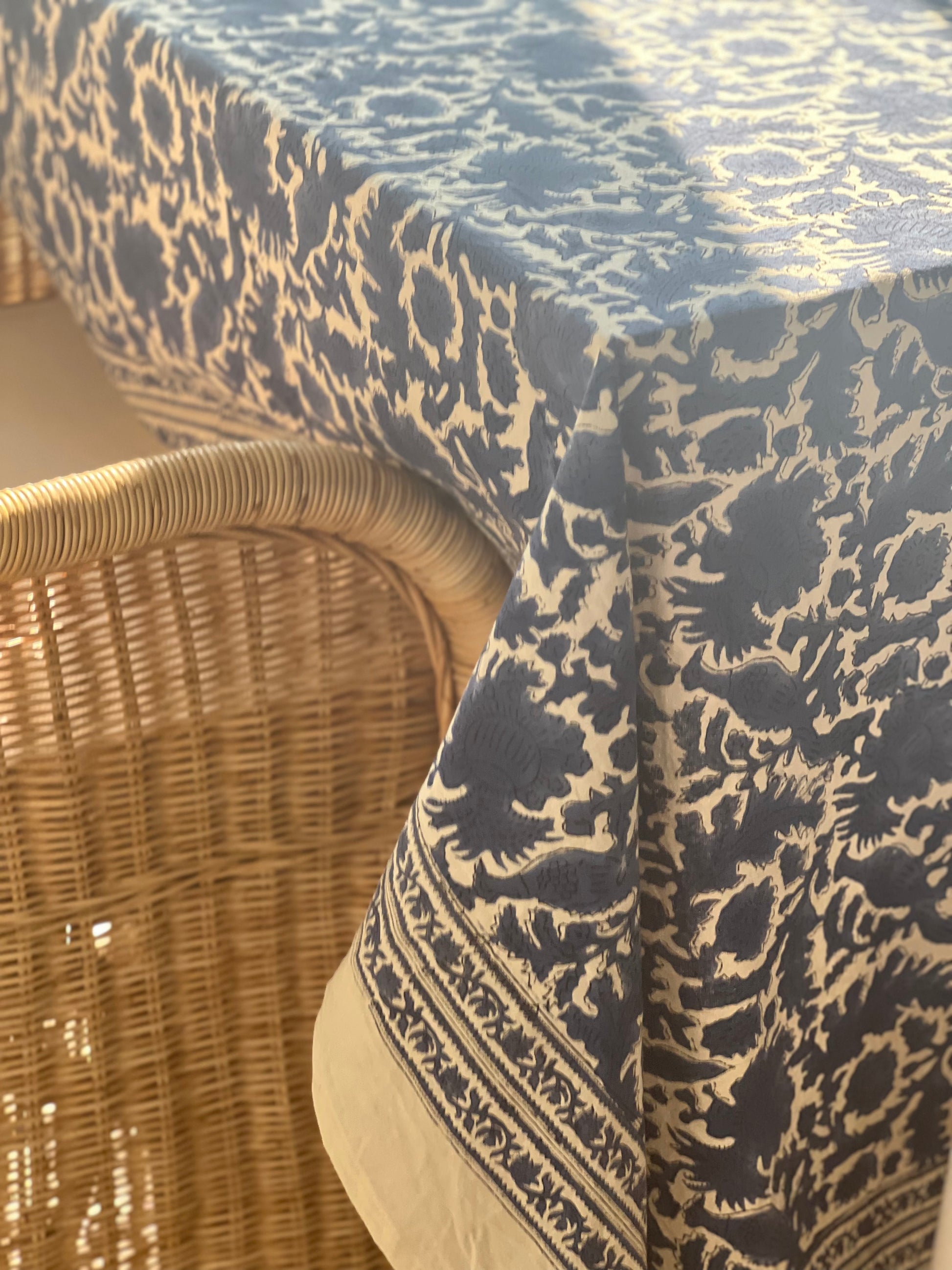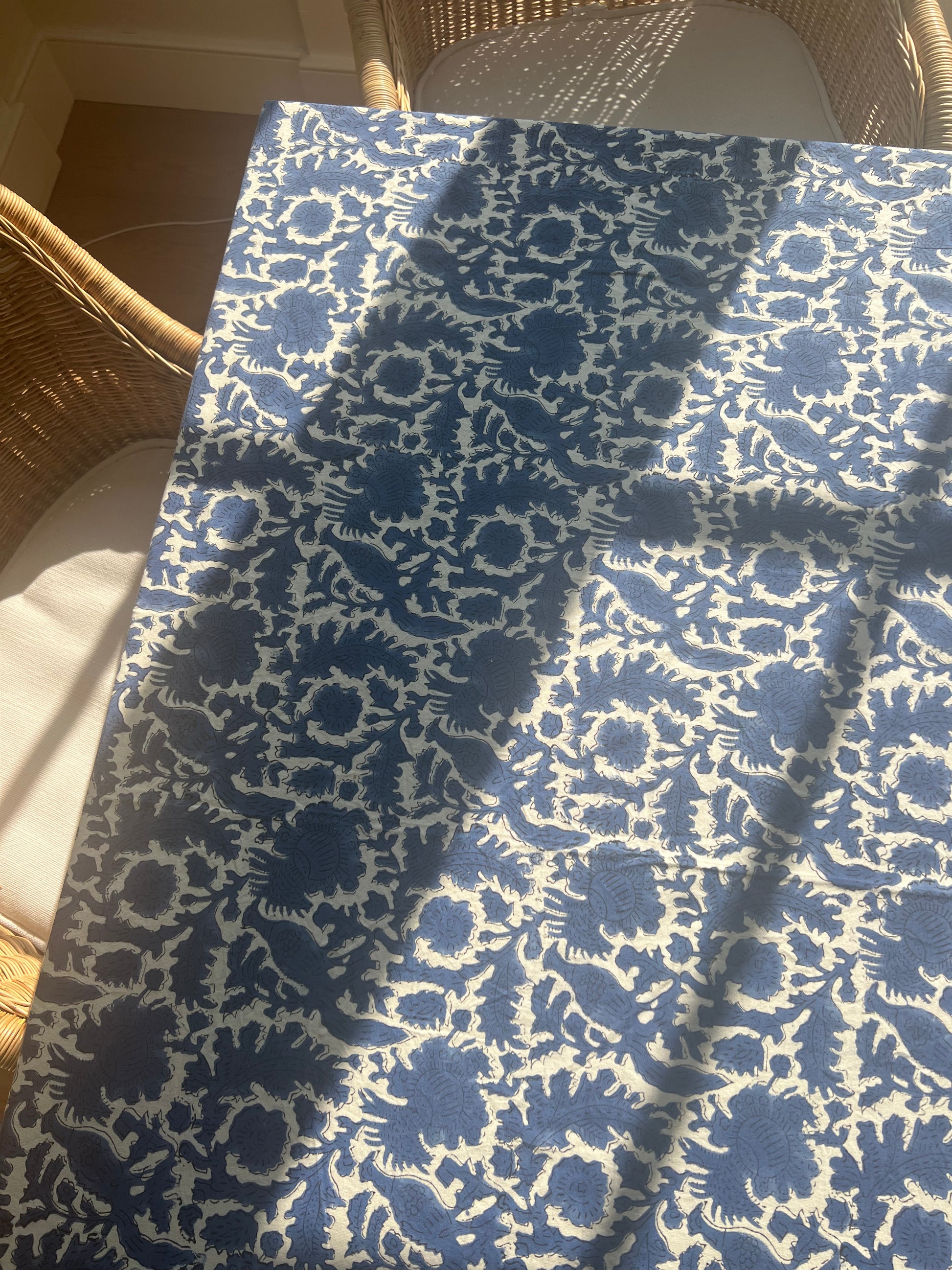 Our Indigo Pheasant Tablecloth is hand block printed, showcasing intricate, timeless craftsmanship, made with traditional techniques passed down through generations. Each design is carefully stamped onto the fabric using hand-carved wooden blocks, creating a one-of-a-kind pattern that reflects both artistry and heritage. The vibrant colors and detailed motifs bring a warm, inviting feel to any dining setting, adding an elegant yet cozy touch to your table.