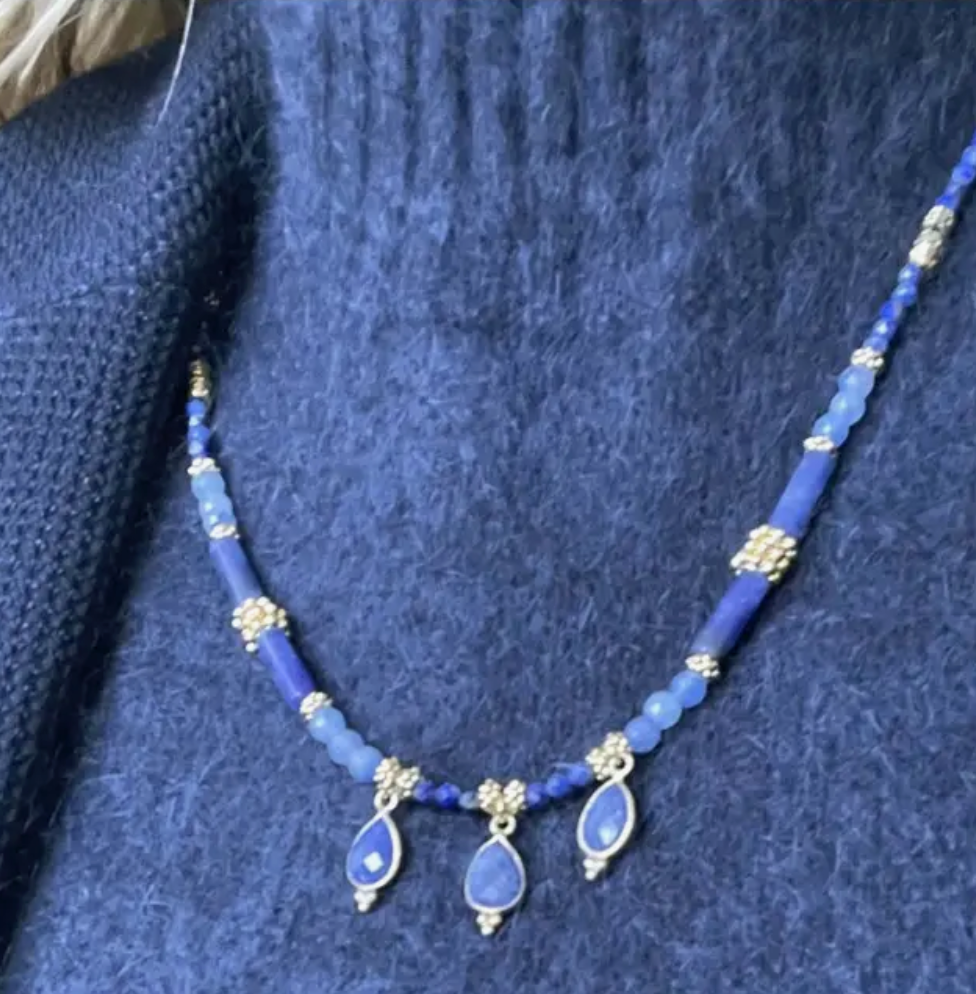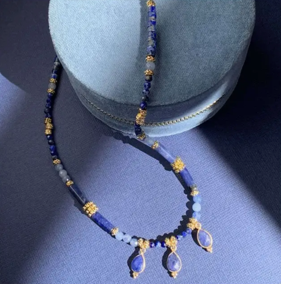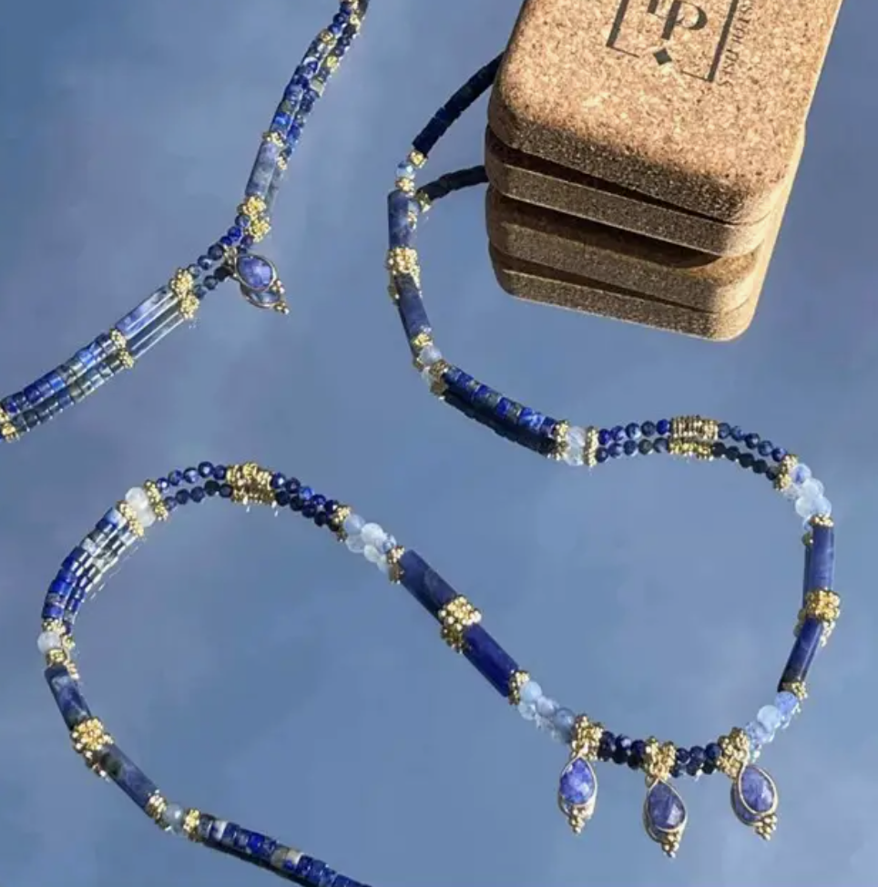 Materials : Lapis from Afghanistan, sodalite, blue aventurine from Brazil Pearls gilded with 24 carat fine gold.