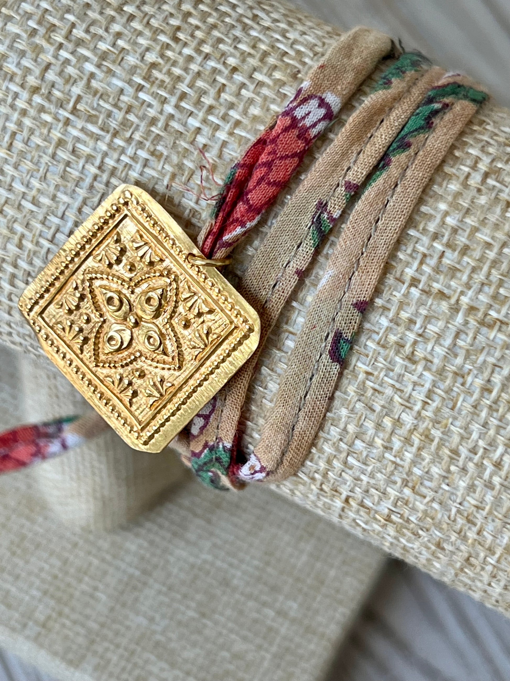 A lovely 2cm square pendant, delicately engraved with flowers, gold-plated with 1-micron thickness, on an Indian beige cotton ribbon.