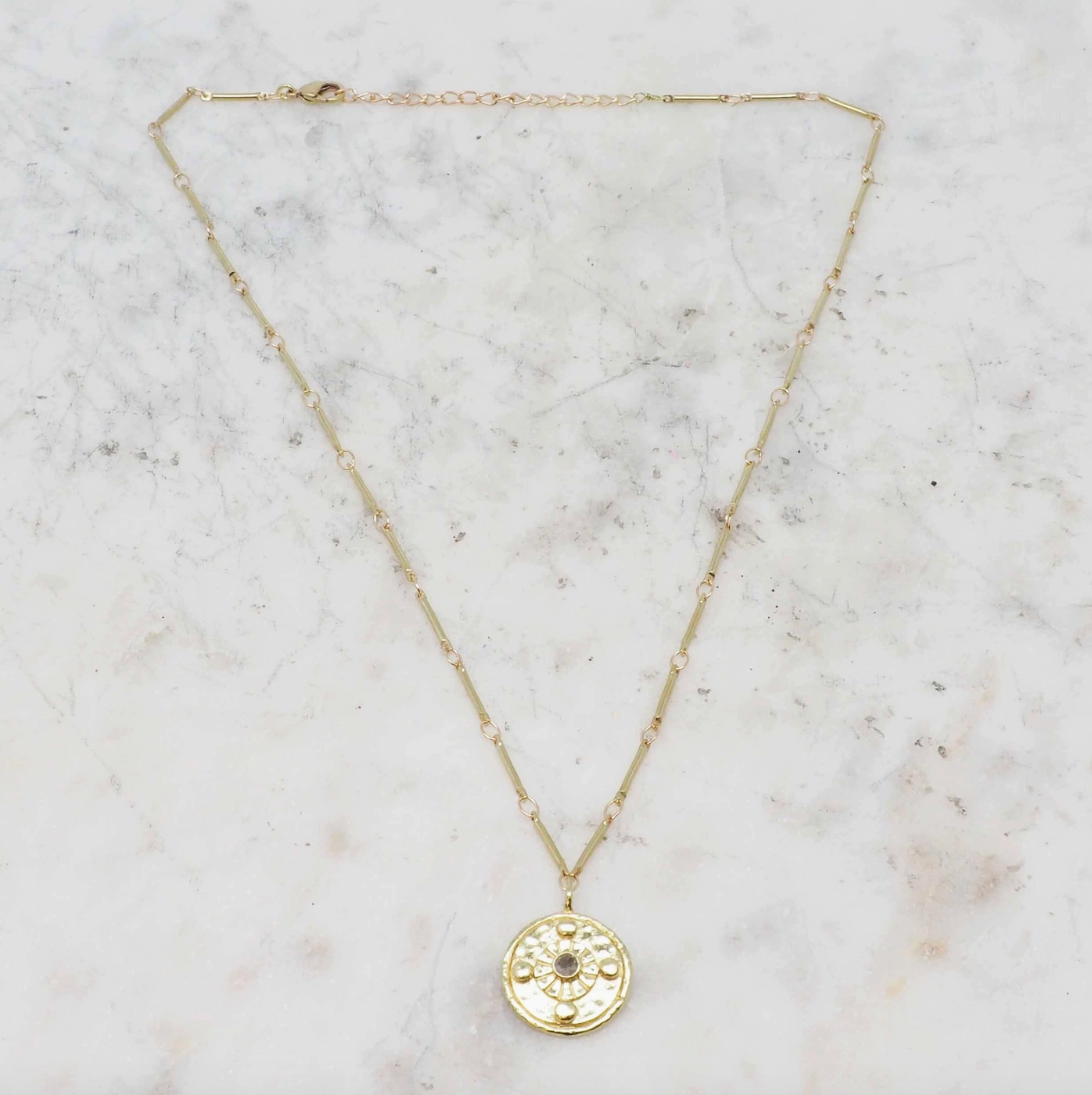 Elevate your style with this sophisticated semi-precious stone necklace, designed for the modern woman. Crafted from gold-filled material and featuring a captivating labradorite stone, this necklace exudes elegance with its golden and gray tones. Perfect for both everyday wear and special occasions, it comes beautifully packaged in a brand pouch, making it an ideal addition to any jewelry collection.