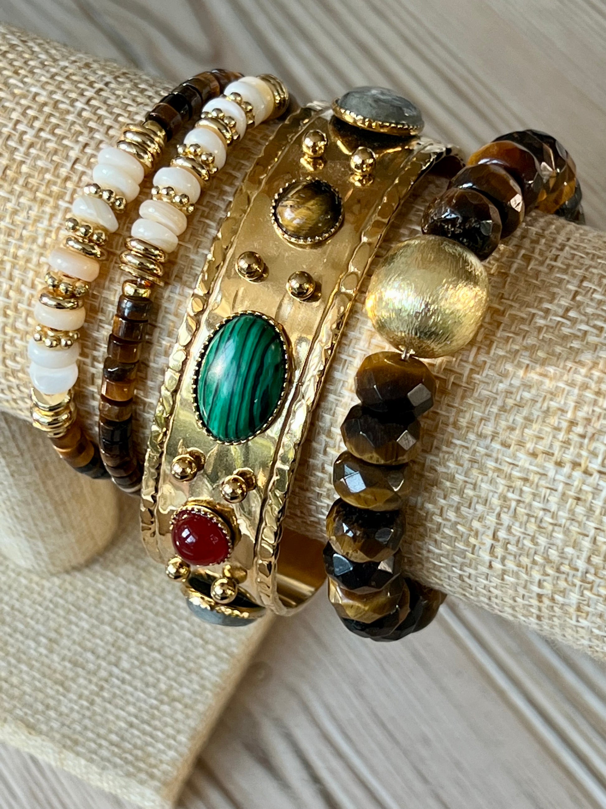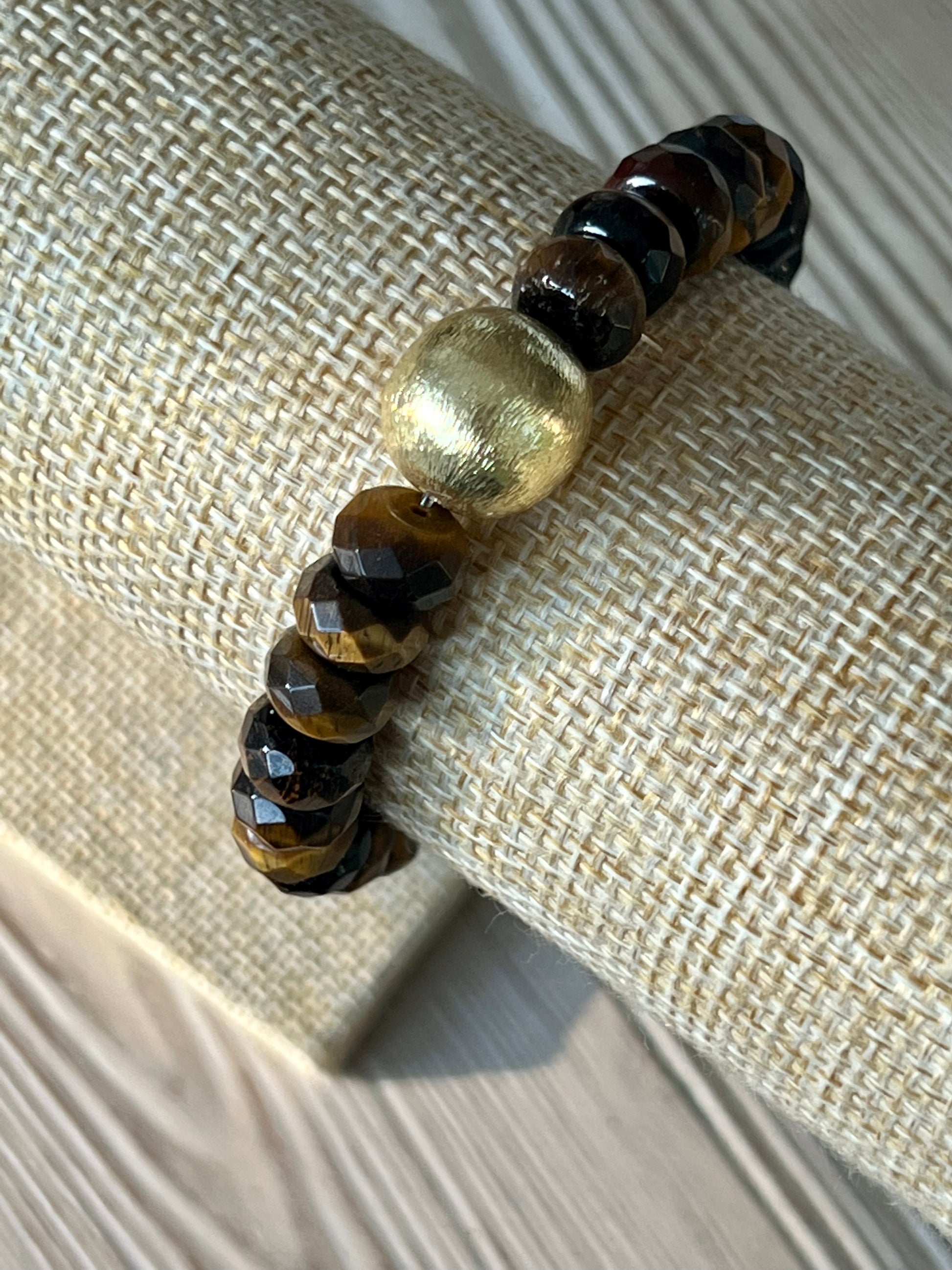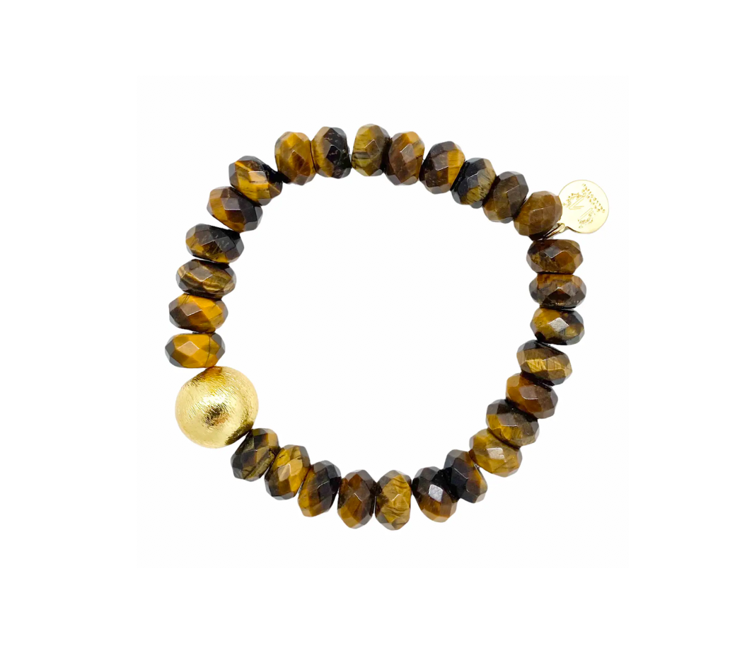 Introducing the exquisite brown tiger eye stretch bracelet by M Donohue Collection, a timeless and elegant piece handcrafted with meticulous attention to detail in the United States. This beautiful stretch bracelet features stunning brown tiger eye beads delicately complemented by a single gold-plated copper bead and is a testament to the artistry and passion of a woman-owned company.