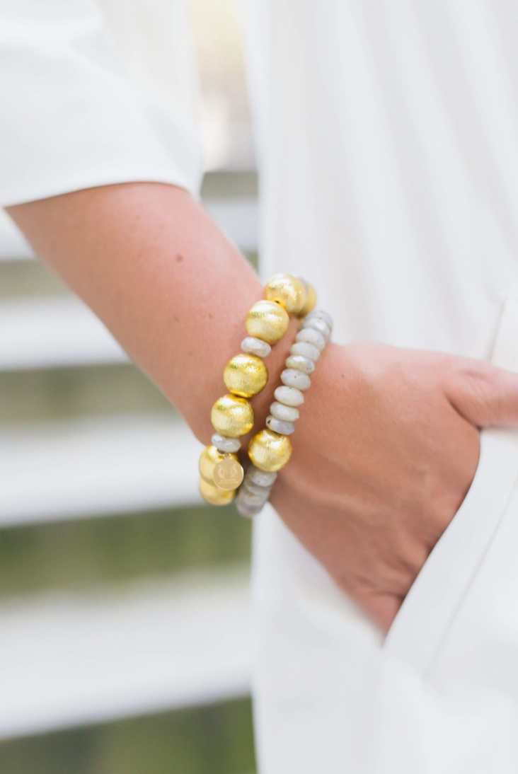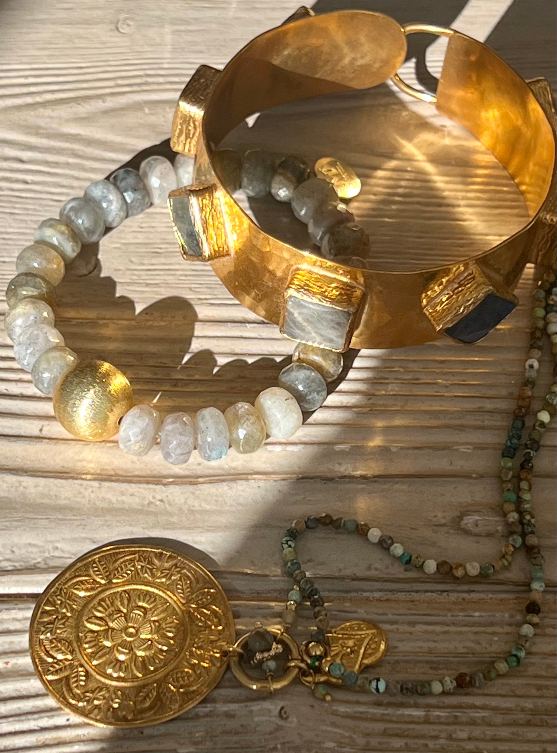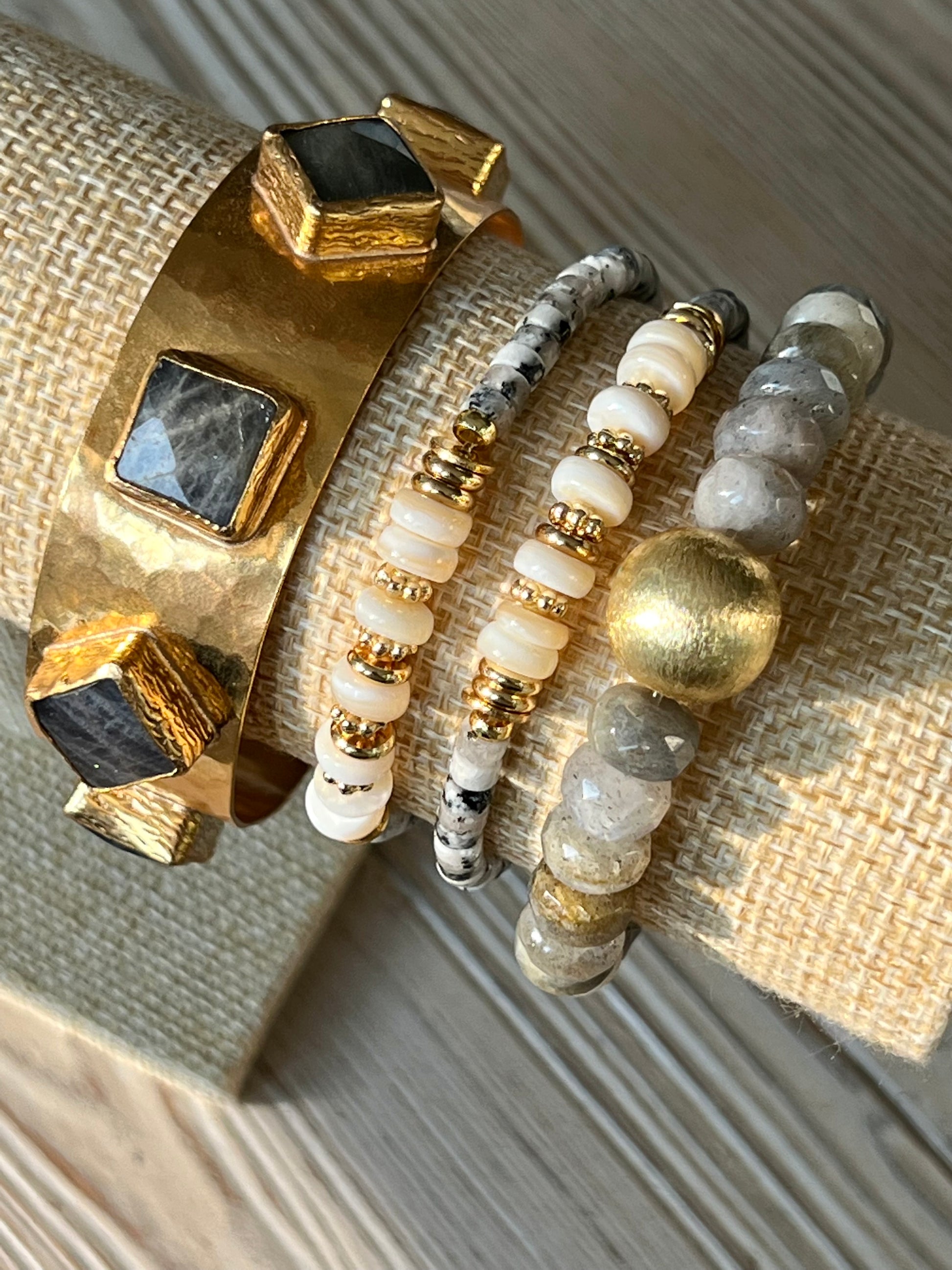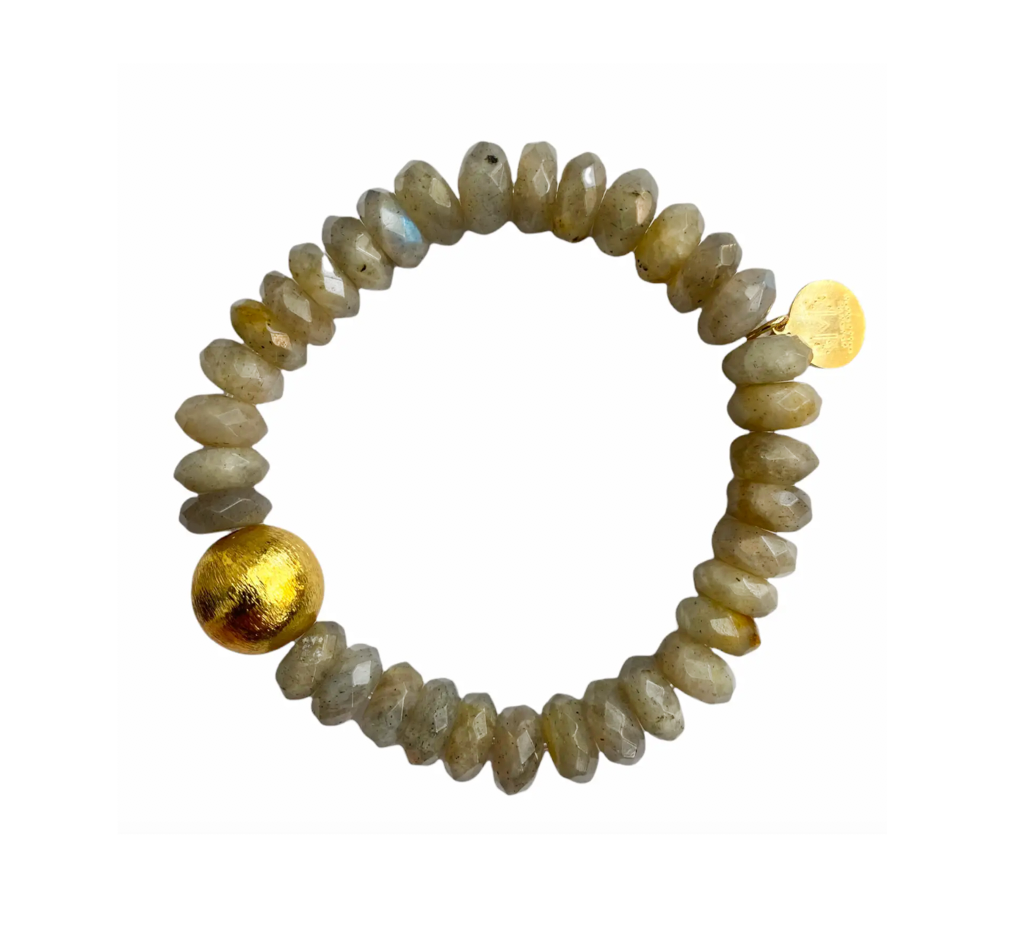 Introducing the exquisite labradorite stretch bracelet by M Donohue Collection, a timeless and elegant piece handcrafted with meticulous attention to detail in the United States. This beautiful stretch bracelet features stunning grey labradorite beads delicately complemented by a single gold-plated copper bead and is a testament to the artistry and passion of a woman-owned company.