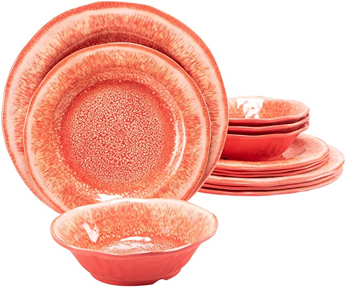 This stunning 12-piece coral melamine dinnerware set includes: 4 dinner plates (11 inch), 4 salad plates (9 inch), 4 bowls (7 inch).