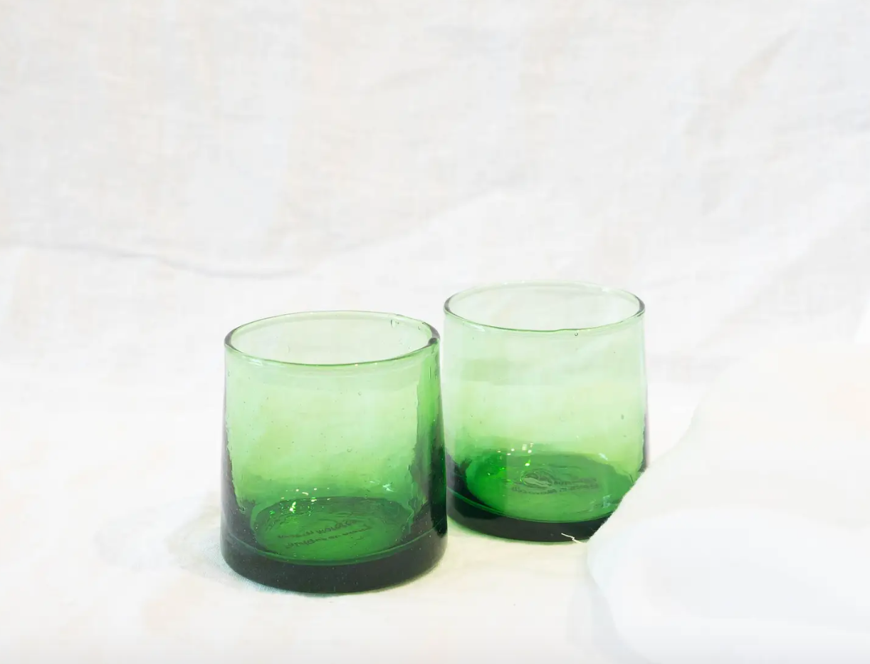 Beautifully shaped and sustainable, our green moroccan tumblers are handblown from recycled glass. Quench your thirst with modern style. Hand blown from recycled glass in morocco. Set of 6 tumblers.