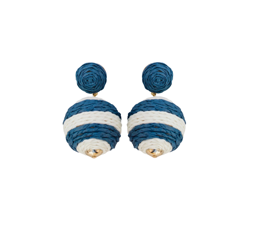 Inspired by the classic beach clubs of the Italian Riviera! The on-trend “Lido” is a fun way to embrace the bon bon and pom-pom earring trend. Navy blue and white wrapped raffia beads create a flattering silhouette that instantly transforms dresses and tops for summer!