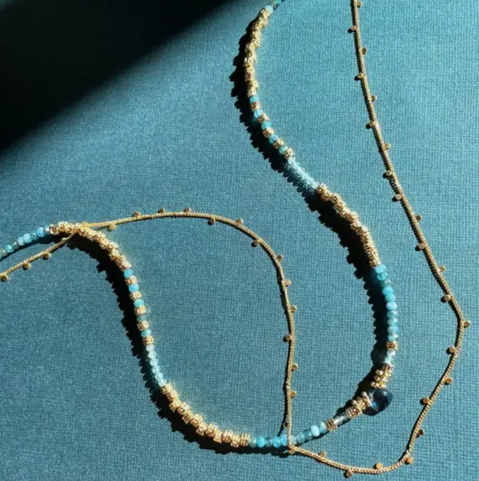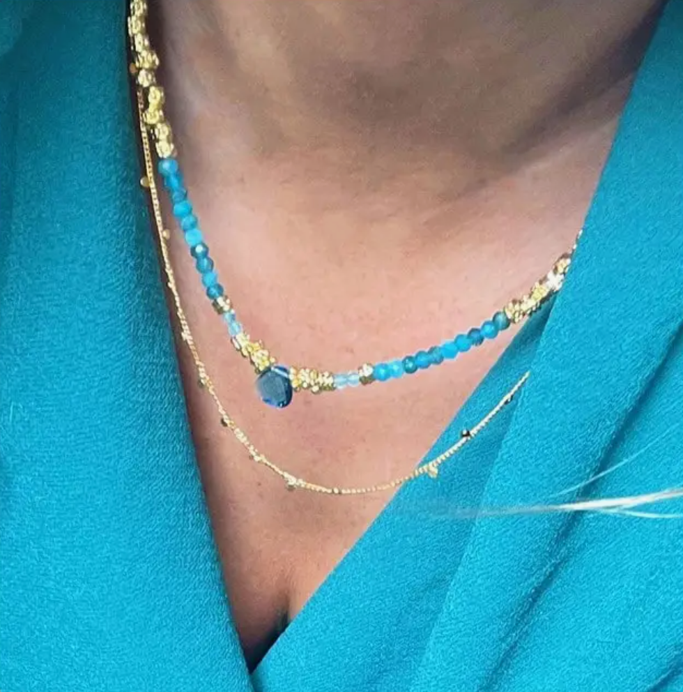 Fine stone double necklace: Apatites, amazonites from Peru, topaz drop/pearls gilded with 24 carat fine gold. Chain gilded with 18 carat fine gold decorated with small gold pendants.