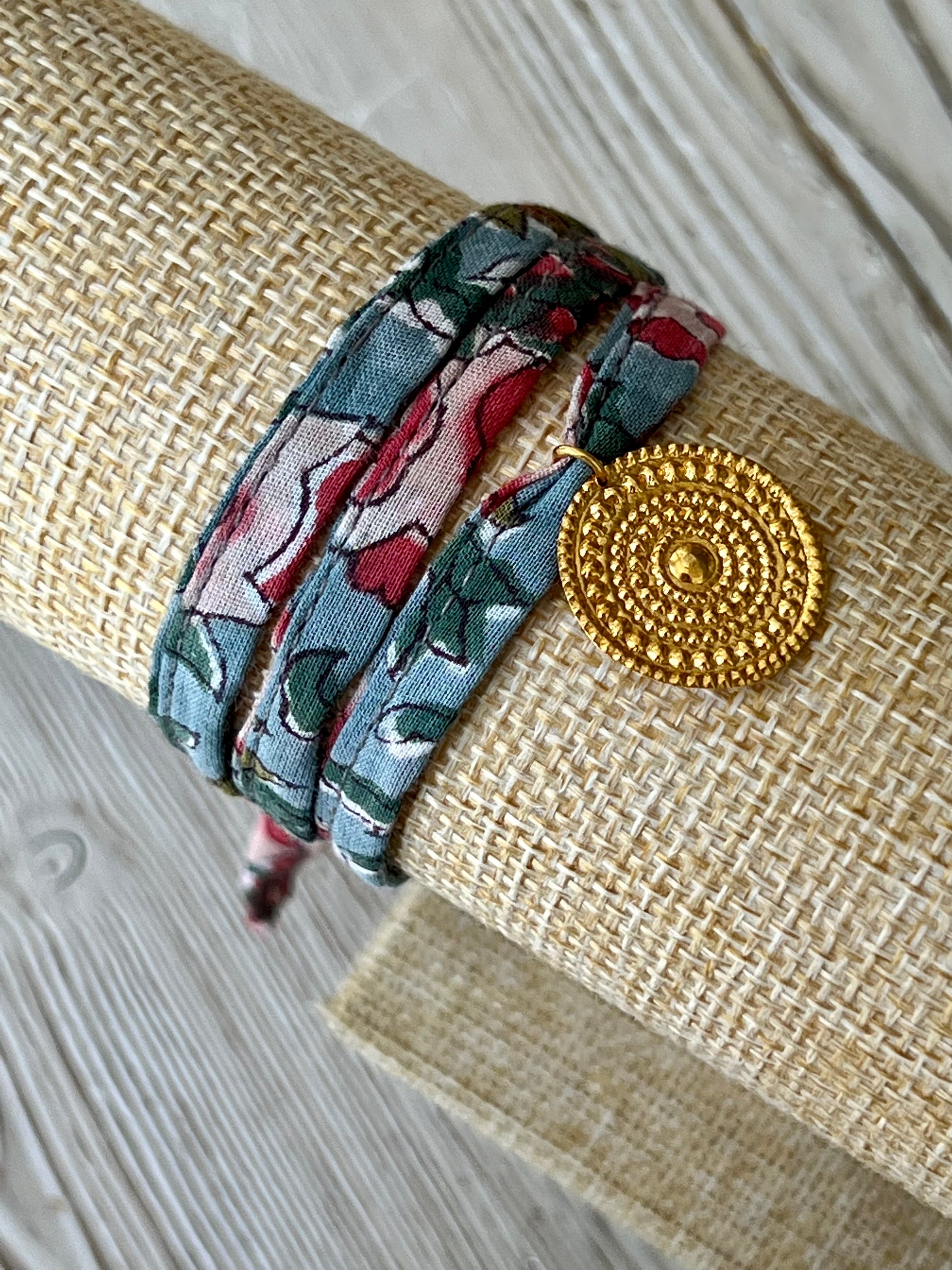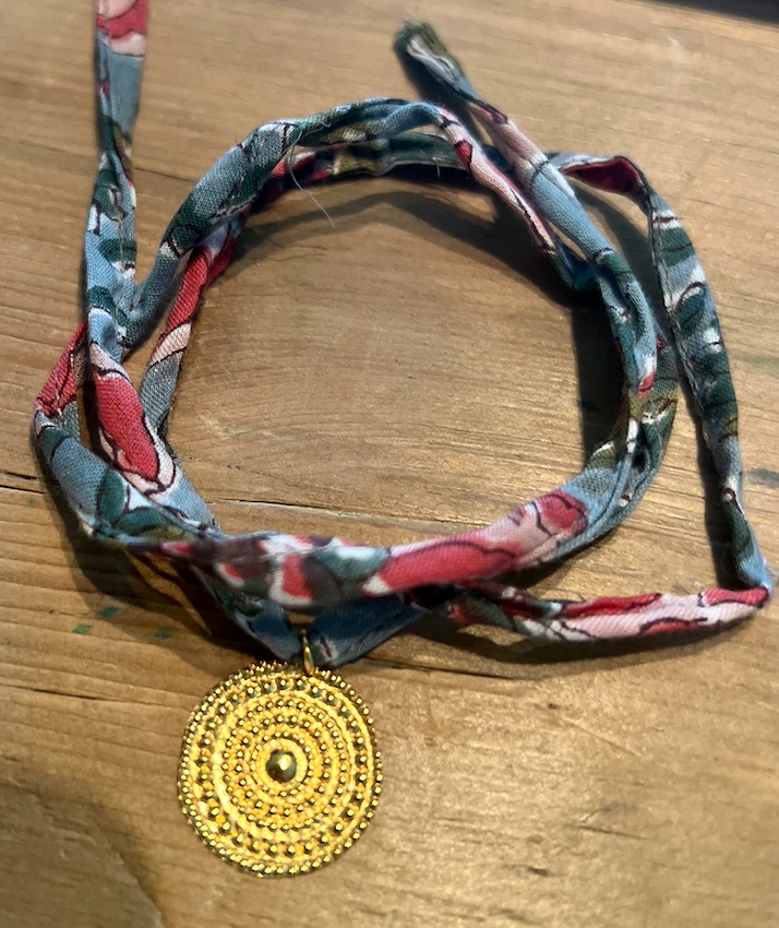 Beautiful round amulet, gold-plated with 1-micron thickness, on an Indian cotton ribbon.