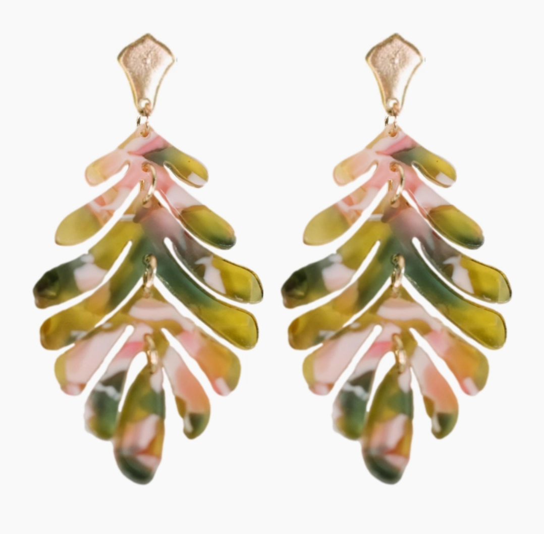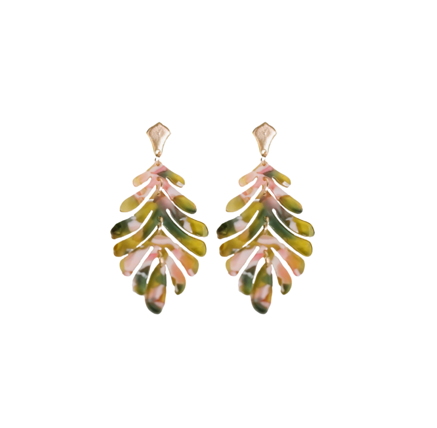 Pink and green camo palm tree leaf 2 inch drop post back weightless design Made of custom die-cut interlocking acrylic beads