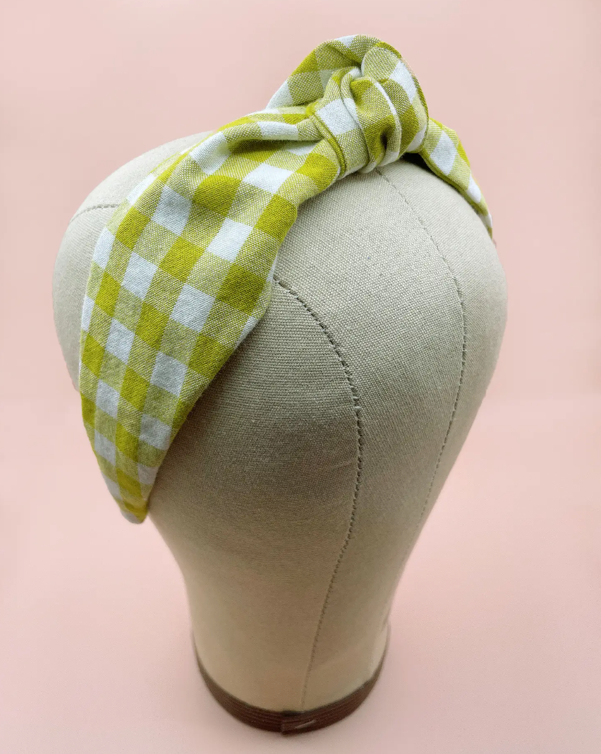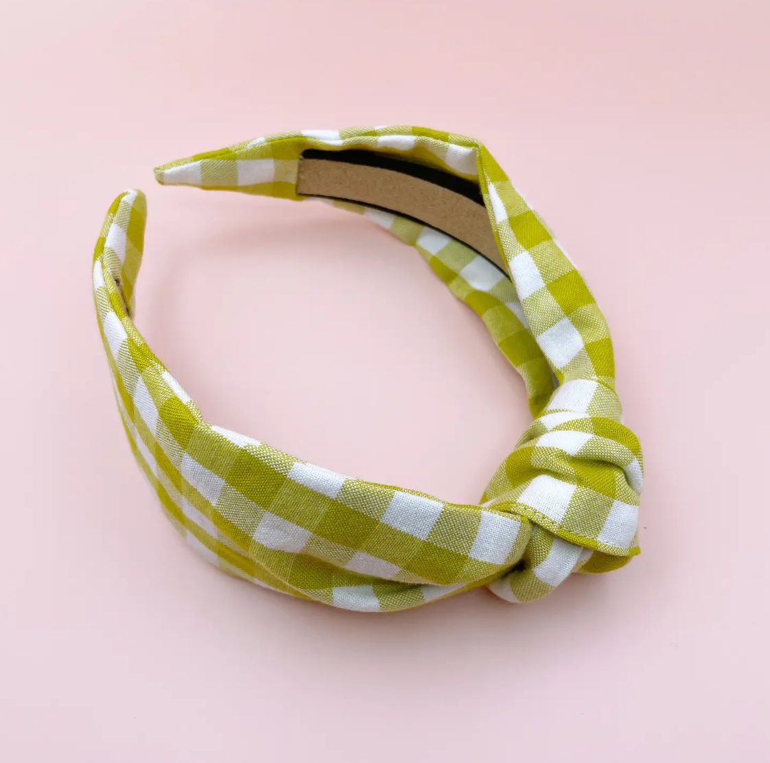 A cotton knotted headband with a vibrant gingham plaid print. This headband has an eye-catching knot detail on the front and a bold green color to draw in more compliments. It's perfect for customers who love modern boho accessories!