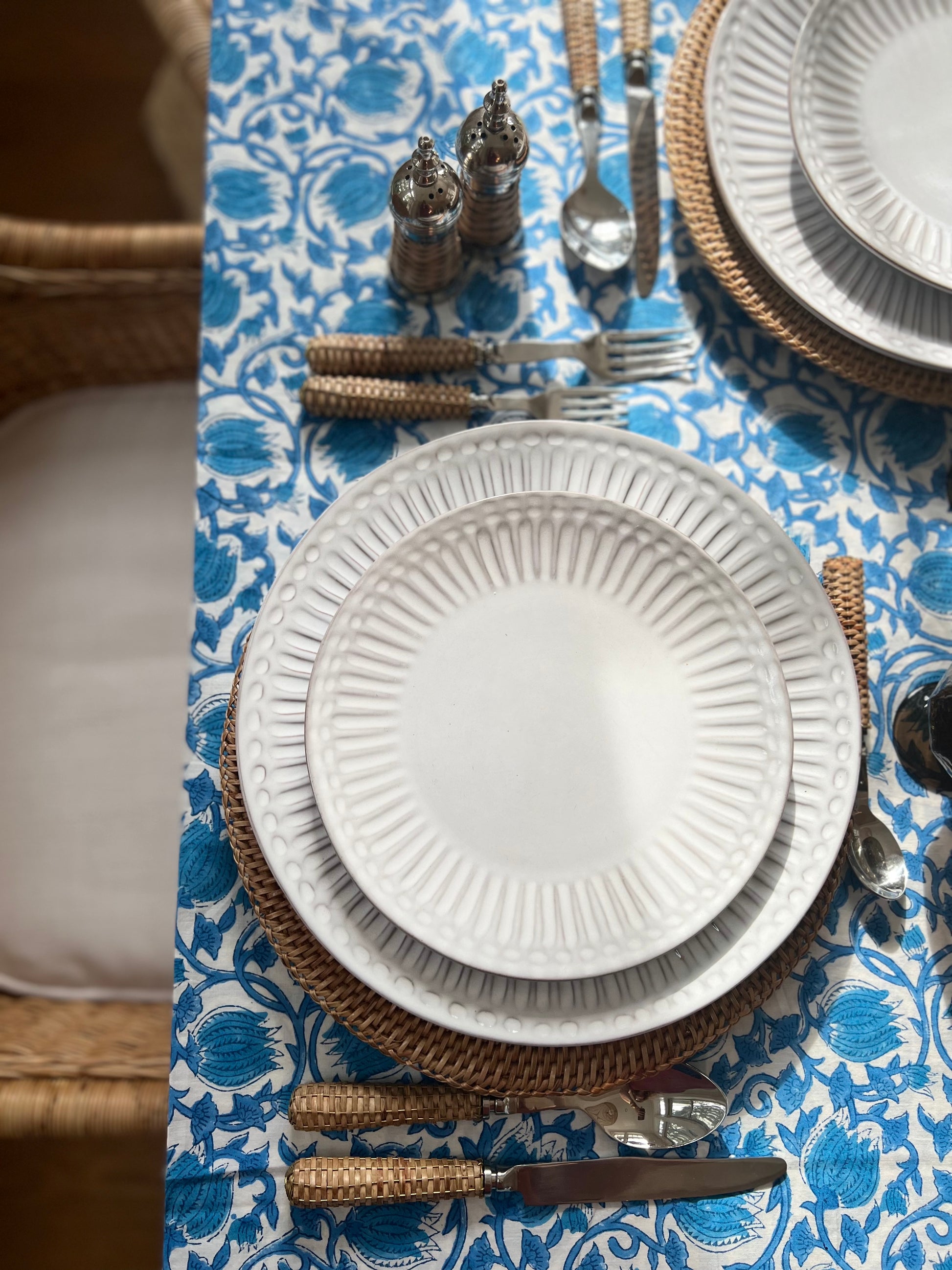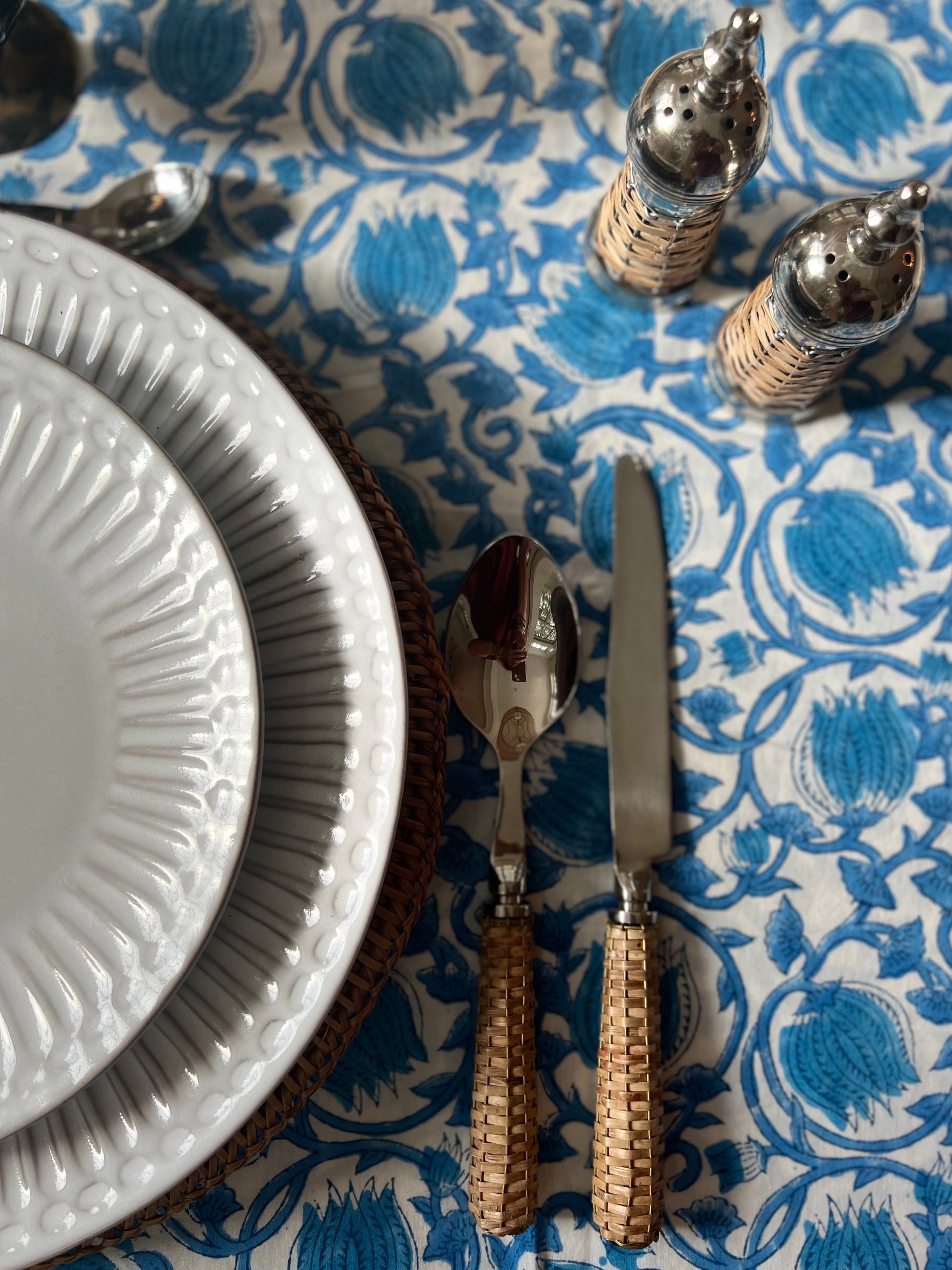 Elevate your dining experience with this exquisite tablecloth featuring a beautiful large blue and white floral design, inspired by the serene coastal atmosphere. Perfect for your long summer nights, this tablecloth comfortably accommodates 8-10 seaters, showcasing the timeless charm of the blue tulip pattern.