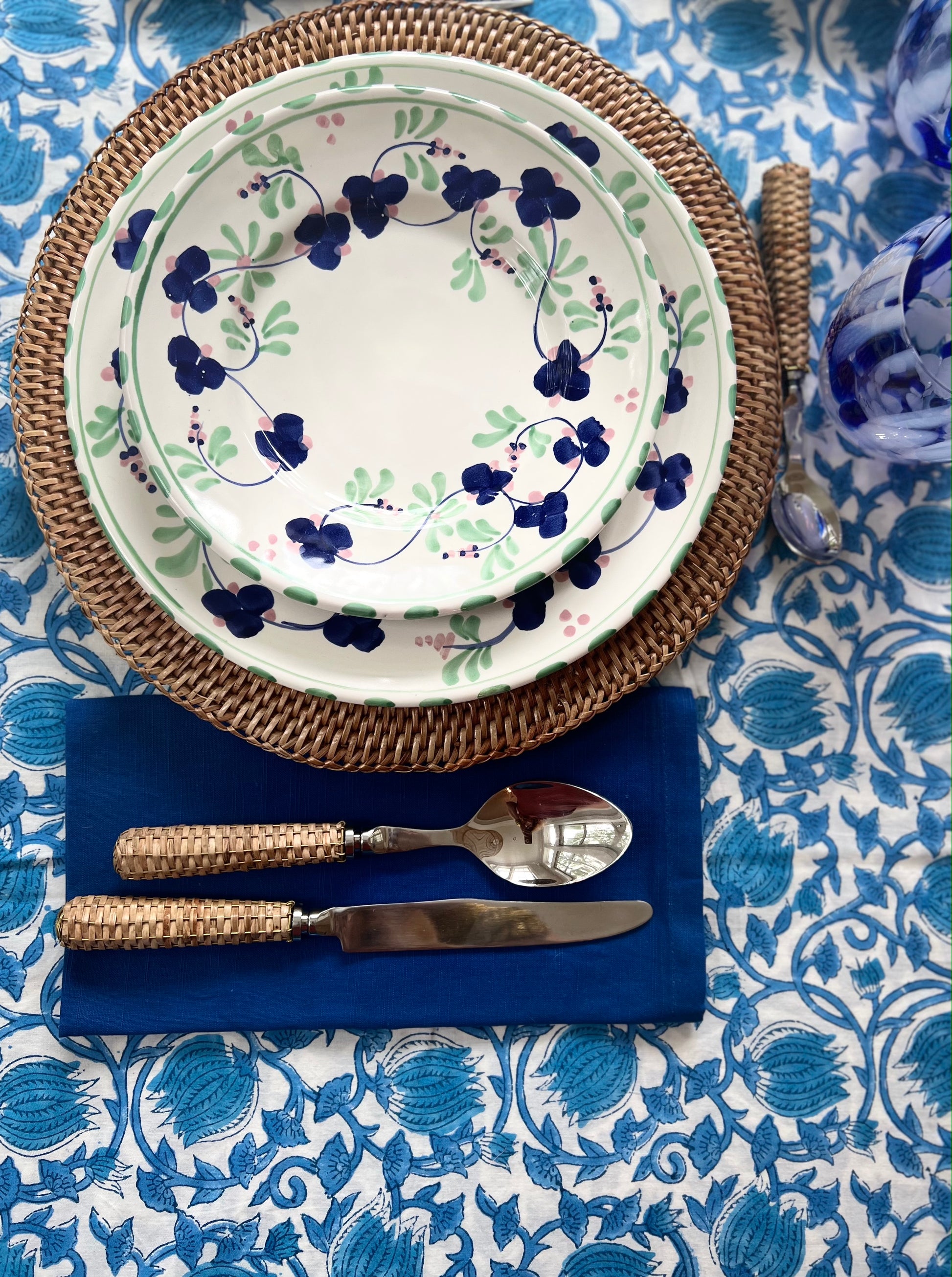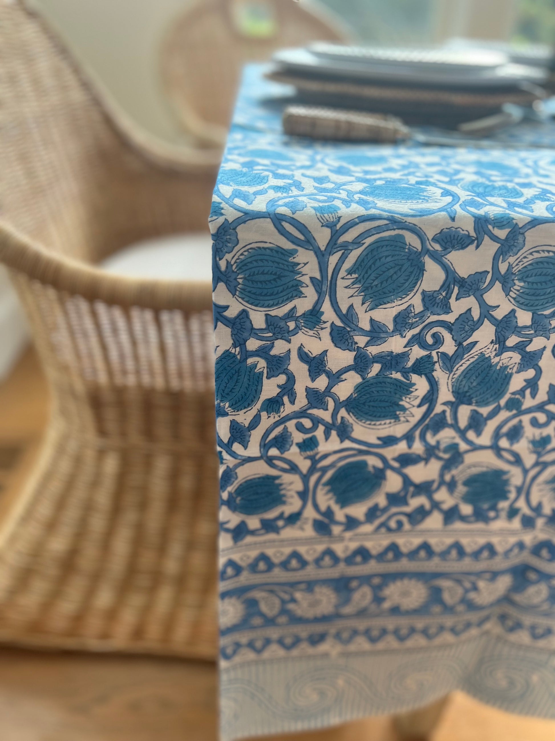 Provincetown Blue Floral Block Print Tablecloth (Large)