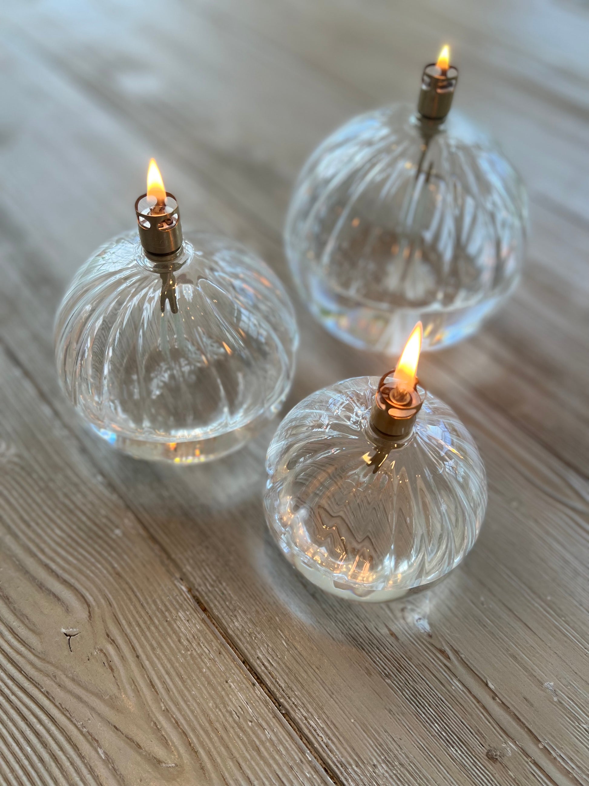 Made from clear glass accented with a traditional fiberglass wick, it burns using paraffin. We always recommend using good quality paraffin oil and to keep the wick short for best results. Make sure to use a funnel to easily replenish the oil in your lamps and avoid spilling. When the lamp stays on for a long time, the wick should be adjusted regularly to prevent smoke and soot damage.