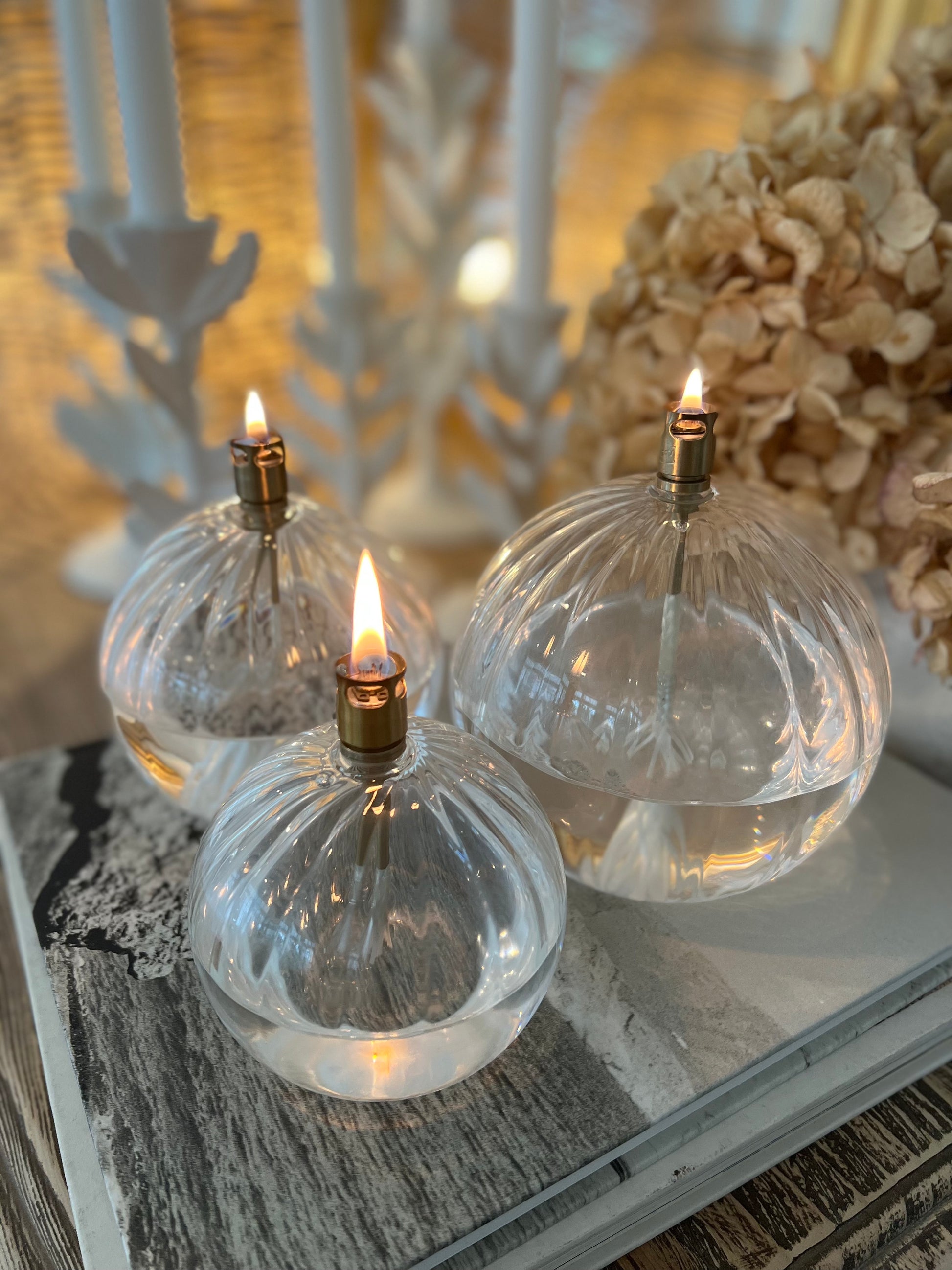 This round shaped glass oil lamp is an elegant decorative detail to illuminate your summer tables or to decorate a corner of your home. Mix and match the different sizes and shapes, to create a stunning array of lights that will create a magical atmosphere.