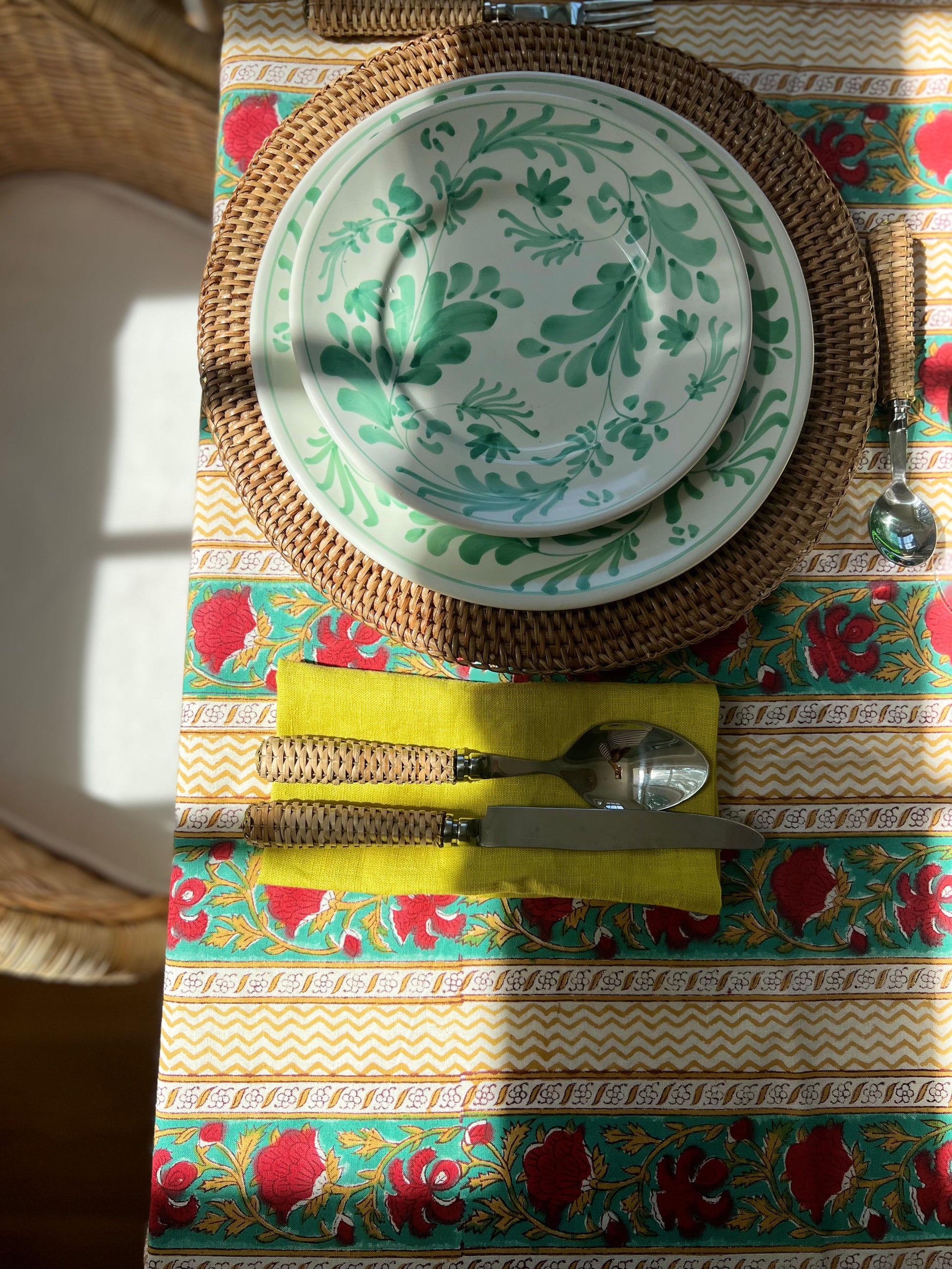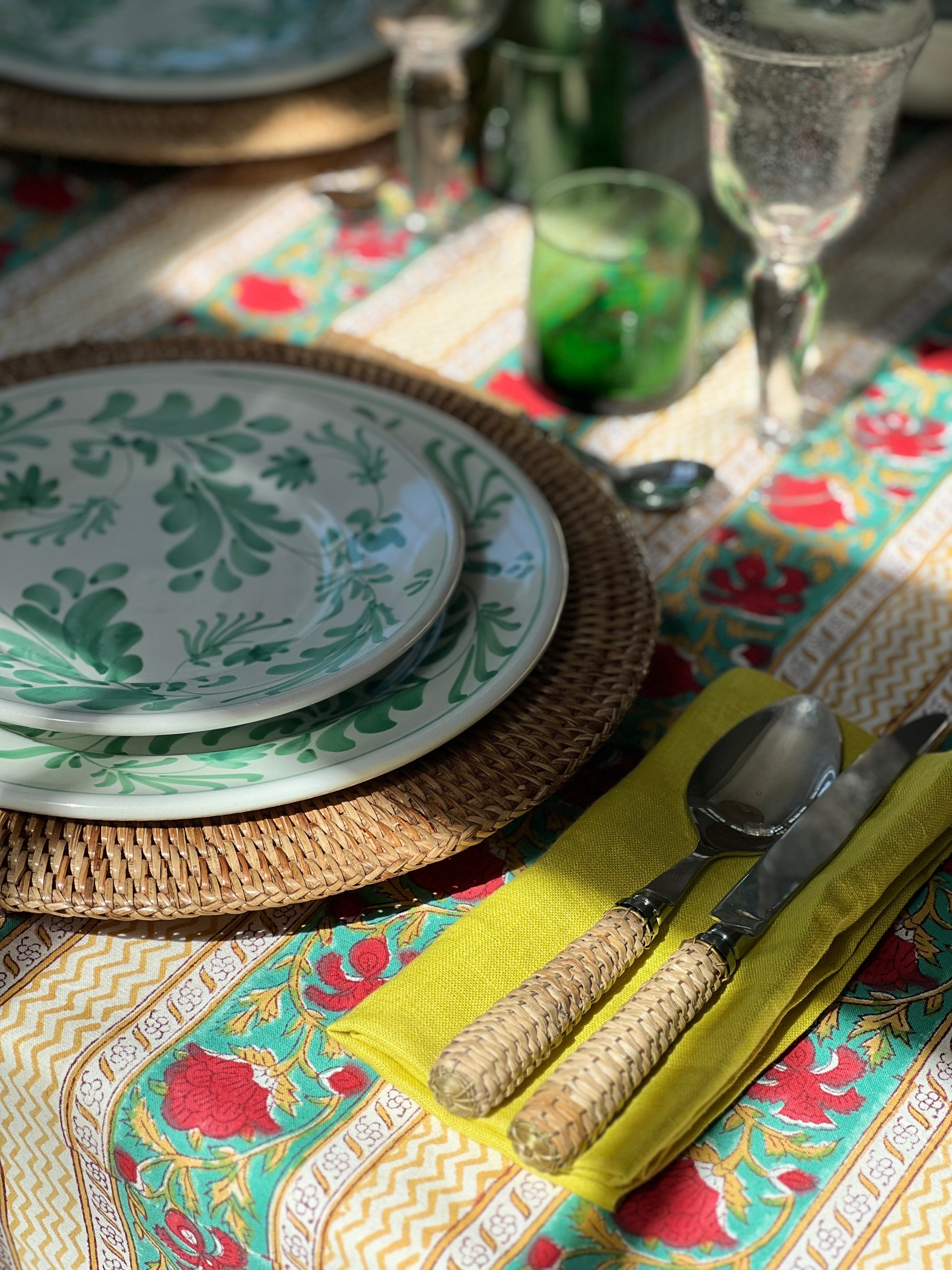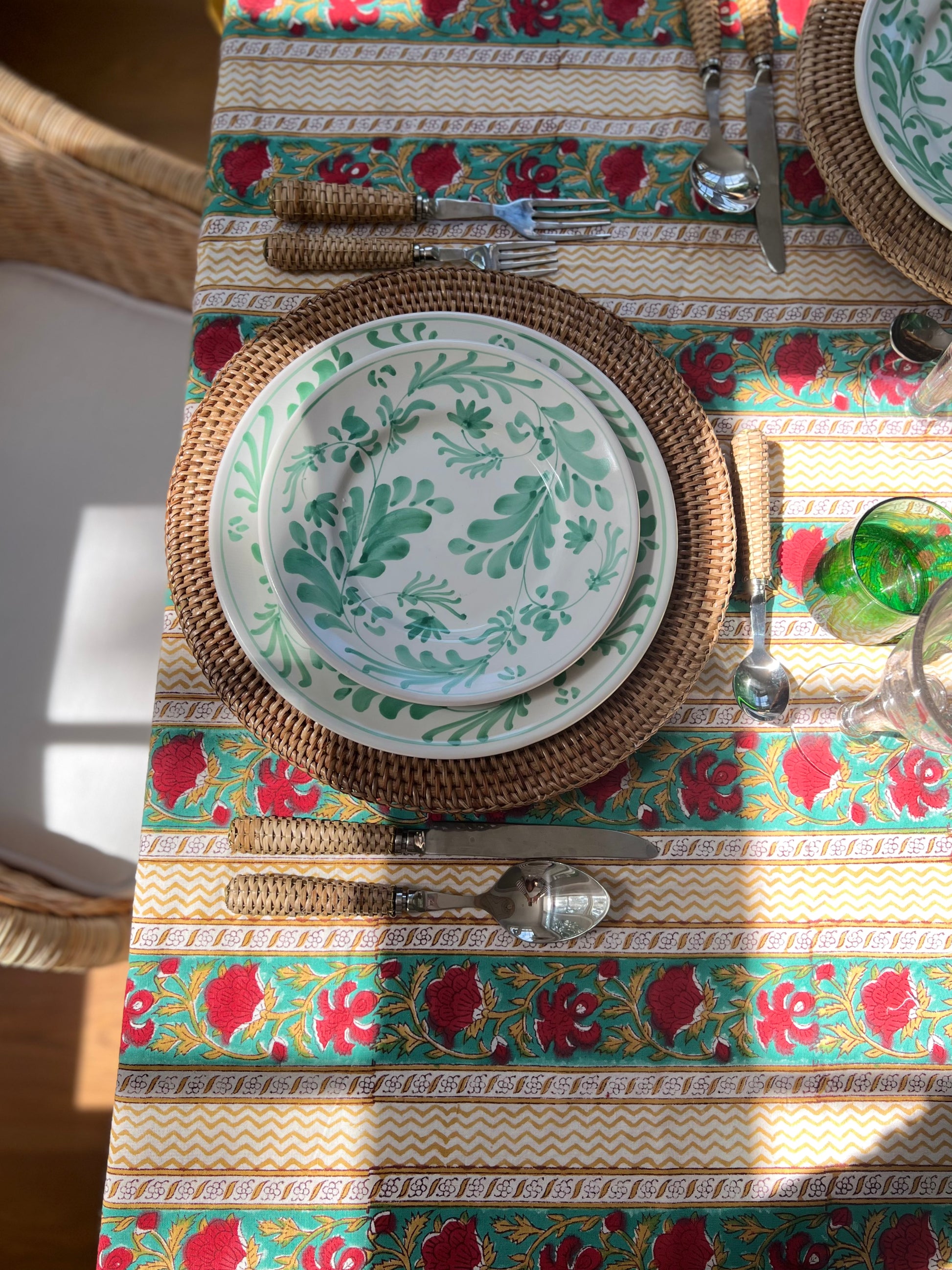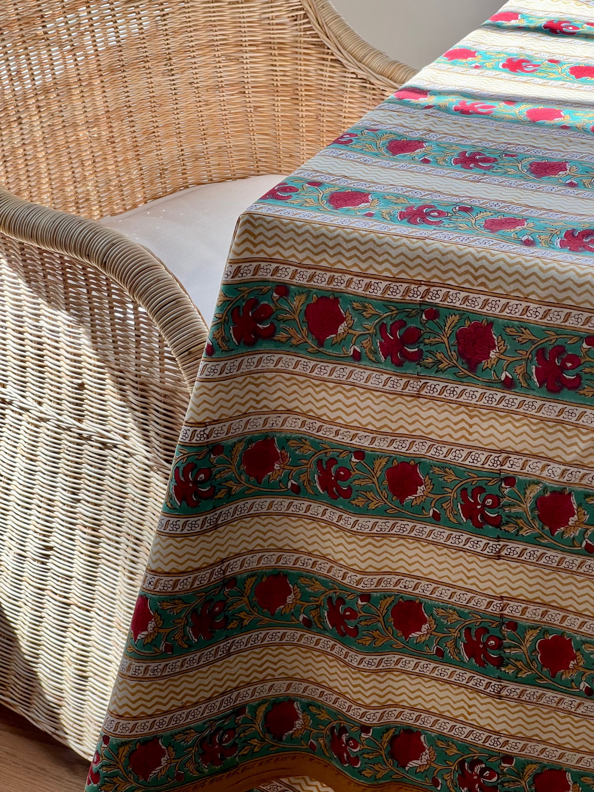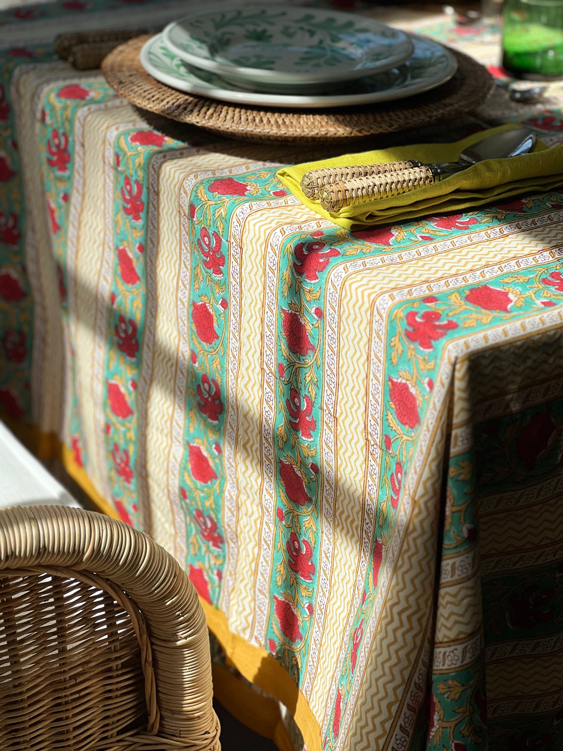 Embrace the vibrant essence of summer with our exquisite block printed tablecloth, inspired by the scenic beauty of French Provence and designed for large family tables (8-10 seaters). Each piece is meticulously handcrafted in India, showcasing the artistry of traditional block printing techniques.