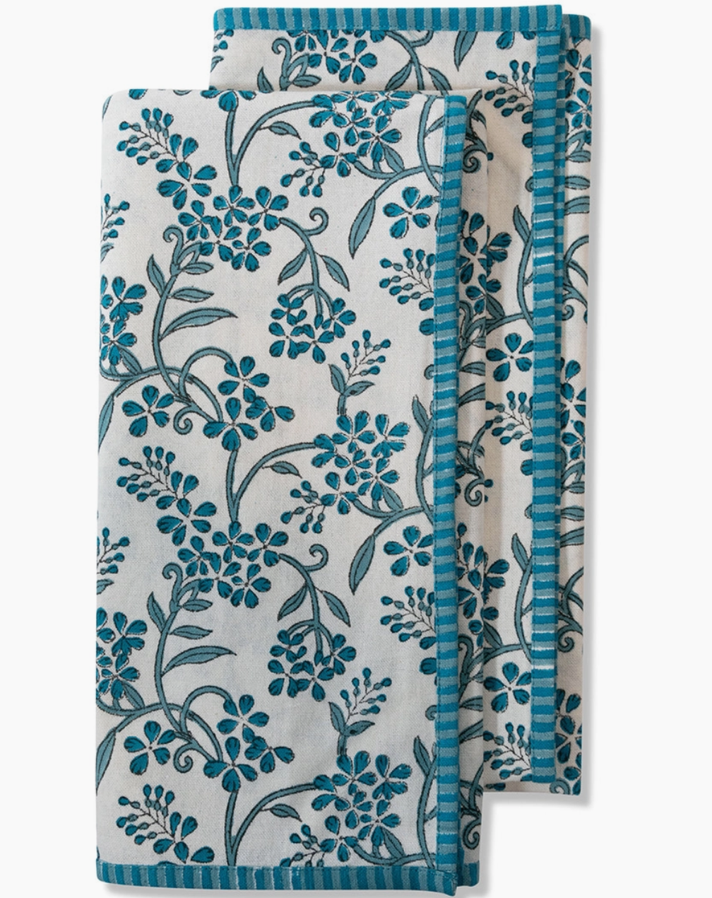Chic and timeless, these pretty blockprint kitchen towels elevate the everyday and add a colorful charm to your kitchen or powder room.