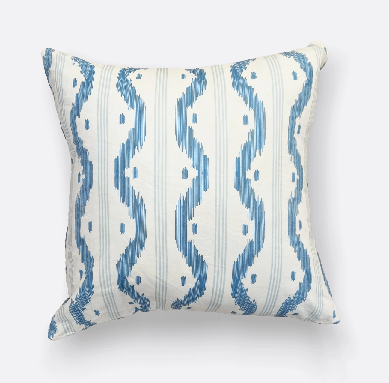 Made in the USA, this 20x20 inch pillow cover pairs coastal ease with timeless design. Woven in 100% cotton, free from polyester, it’s soft yet sturdy, finished with a clean hidden zipper. Blue and white, classic and relaxed — perfect for layering on a sofa, chair, or reading nook. Cover only.