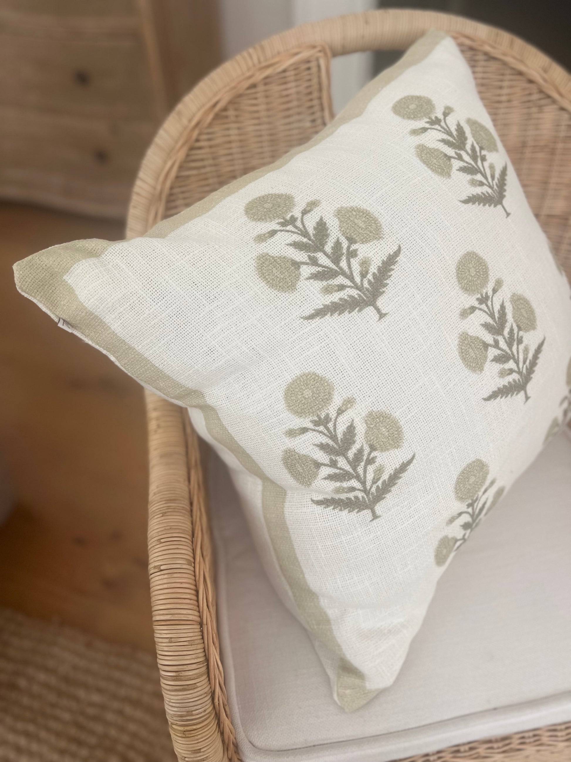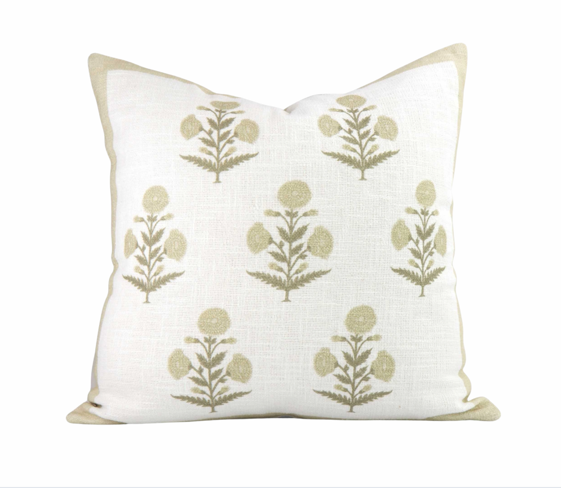 Introducing our Seraphina Block Print Pillow Cover from Tajik Home. Inspired by vintage Indian designs, this meticulously crafted piece seamlessly blends traditional elegance with modern flair. Each intricate detail is carefully curated, drawing from historic art found in old wallpaper books, vintage homes, and antique marketplaces. Tajik Home has infused vibrant, modern colors to breathe new life into classic patterns, ensuring a perfect blend of timeless charm and contemporary style. Featuring a sage and white floral print, it evokes serene coastal vibes and effortlessly complements our coastal collection. Its versatile design allows for effortless mixing, matching, and layering with other pillows from our collection, empowering you to create your own unique aesthetic with ease.