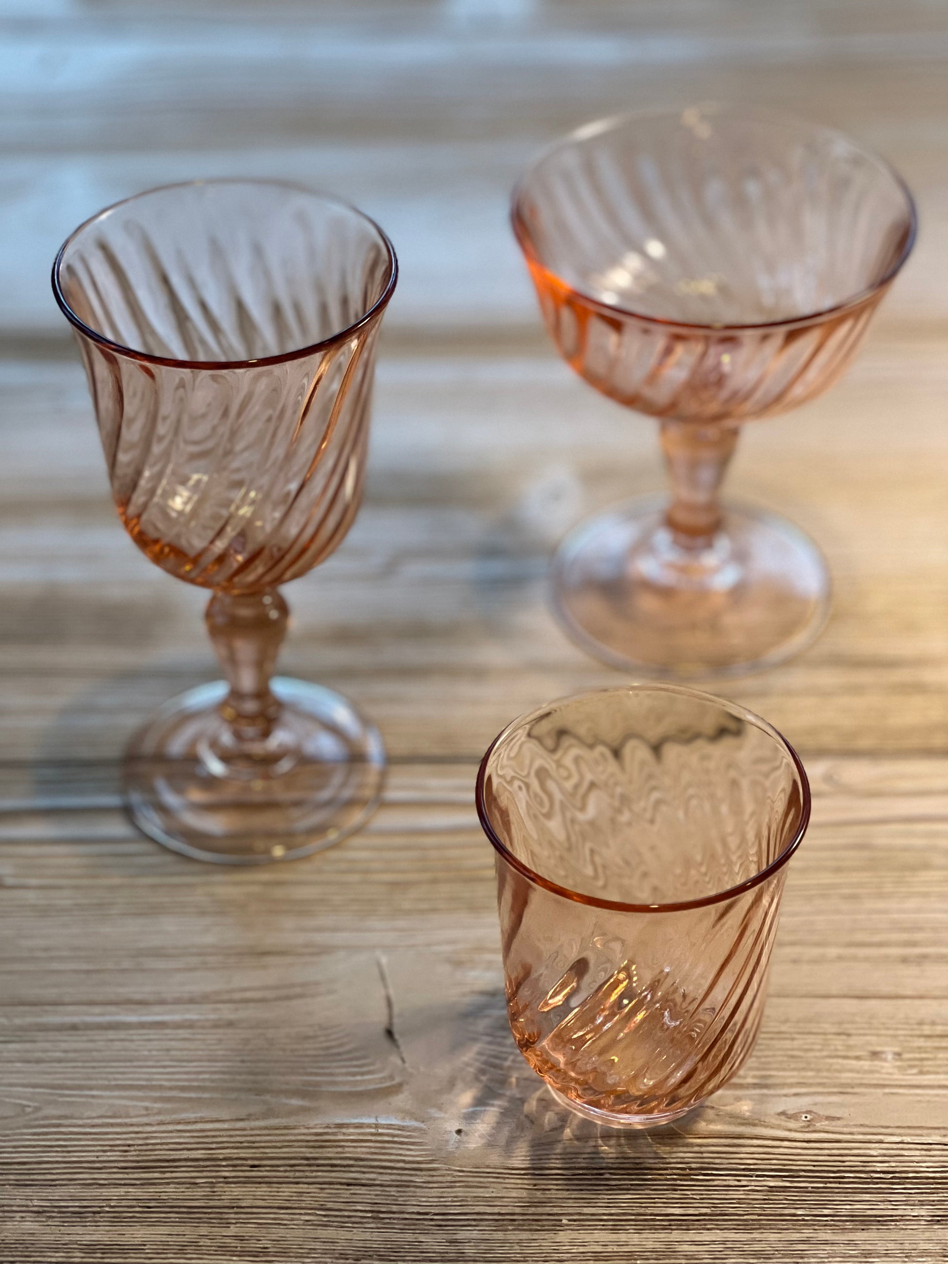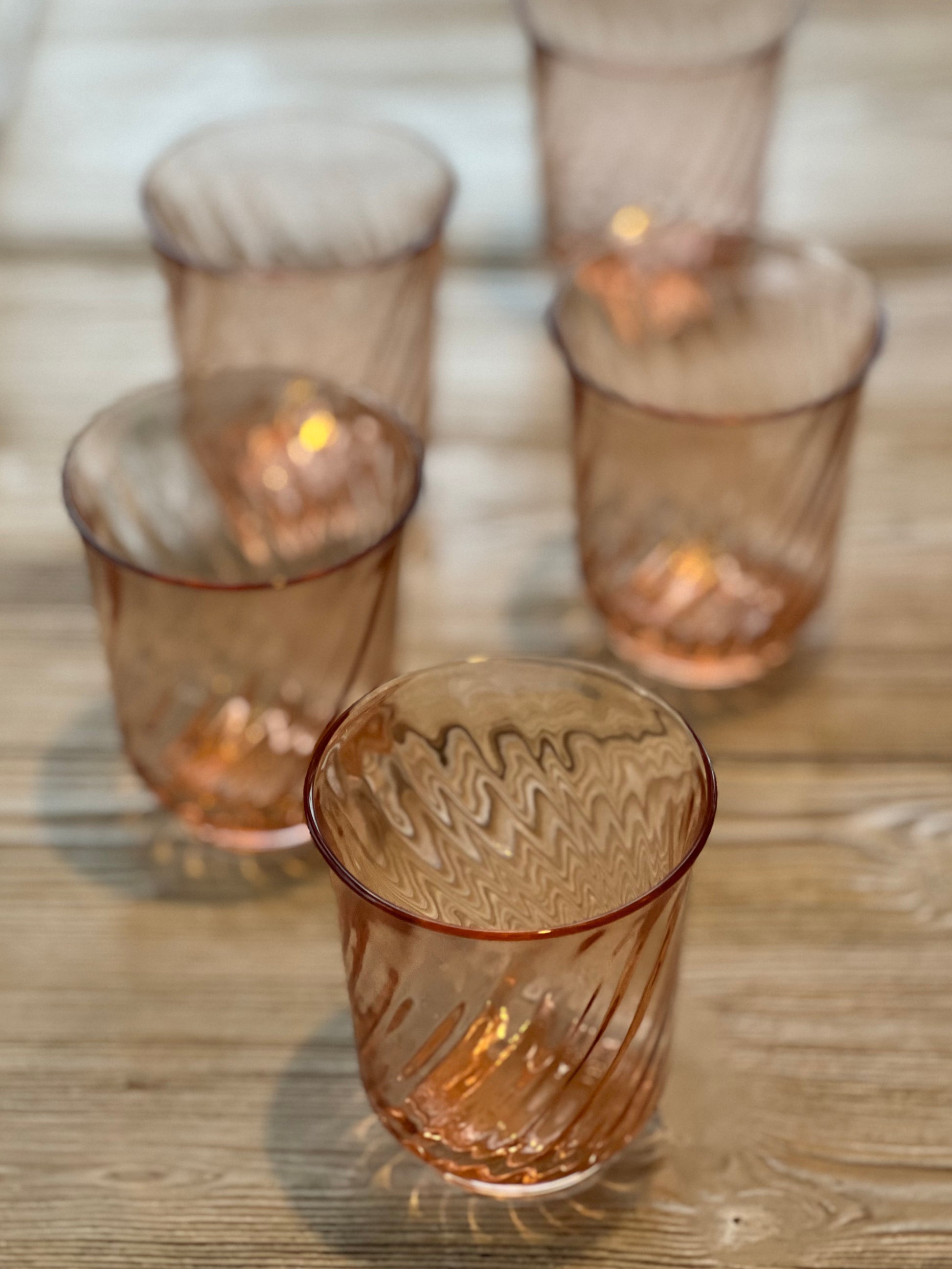 Beautiful set of 2 vintage pink water glasses from the 1970s, made in France. This is the Rosaline model by Luminarc, renowned for its quality craftsmanship. Crafted from pink "twirled" glass, each glass exudes a charming retro vibe. The glass with its soft blush pink color captures the light and sparkles.