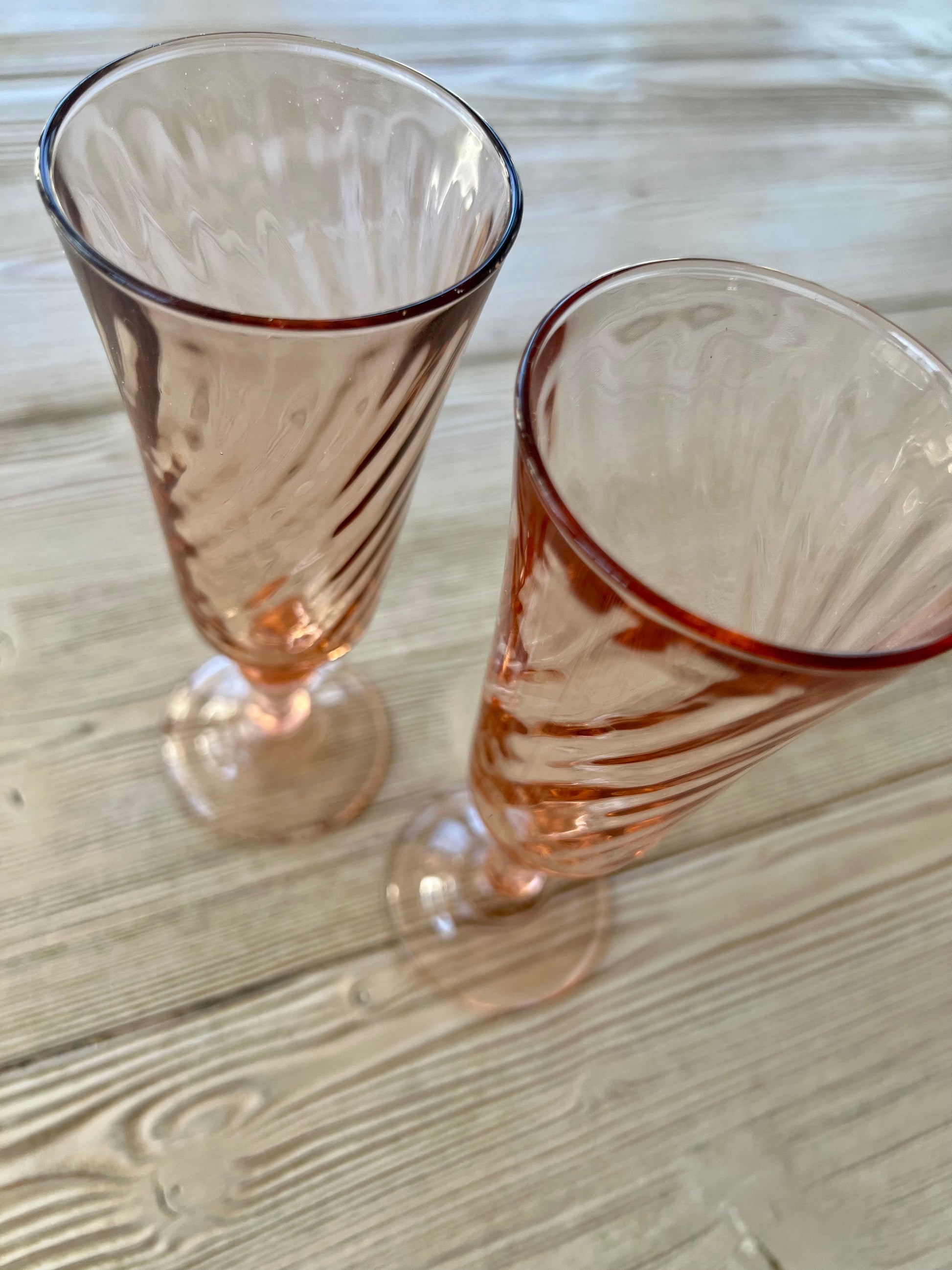 Beautiful set of 2 vintage pink Champagne flutes from the 1970s, made in France. This is the Rosaline model by Luminarc, renowned for its quality craftsmanship. Crafted from pink "twirled" glass, each glass exudes a charming retro vibe. The glass with its soft blush pink color captures the light and sparkles.