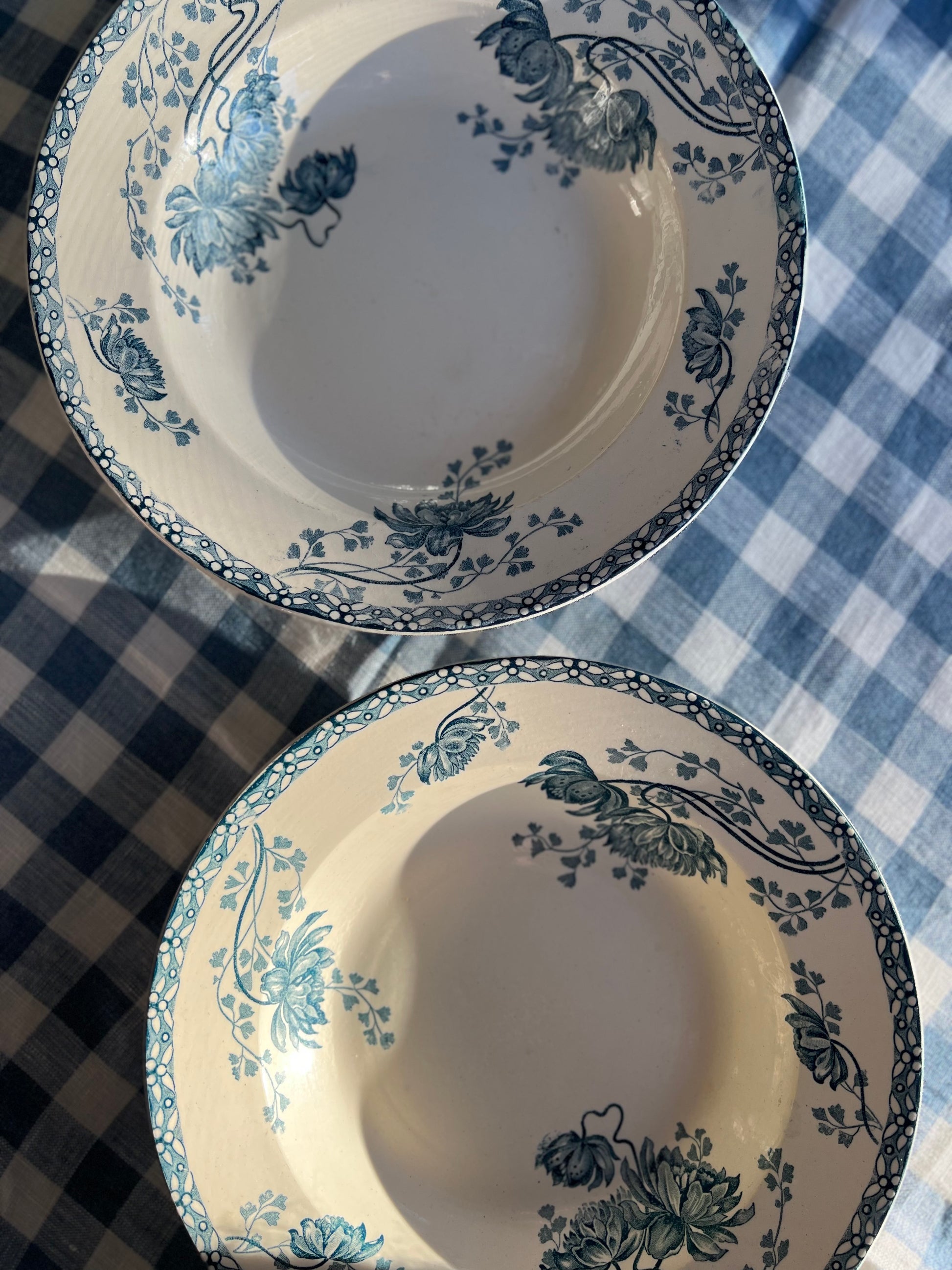 Step into the 19th-century splendor with our exquisite French 'Terre de Fer' soup plates (ironstone) by Sarreguemines (Royat model). Crafted with meticulous detail, these plates evoke timeless beauty.