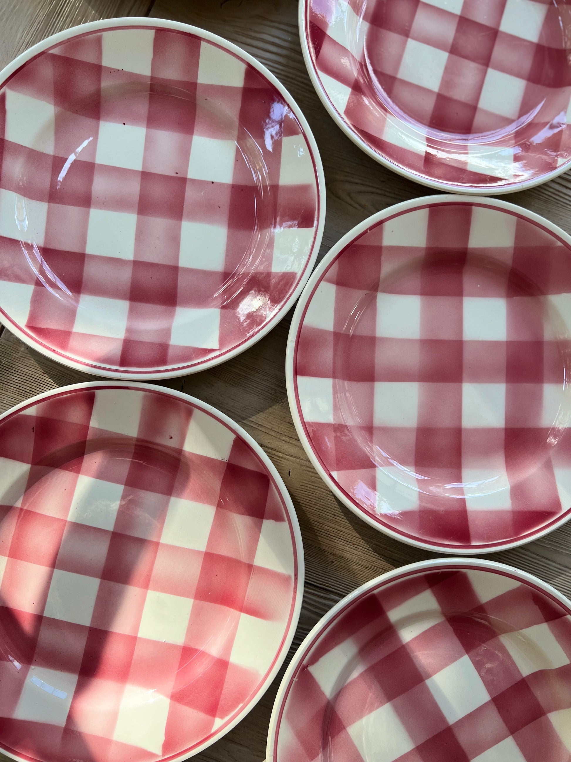 Add a touch of nostalgia to your table with this set of four vintage plates from Faïencerie Givors, dating back to the 1950s. Each plate features a charming red and pink tartan design, accented by a classic checkered pattern in red and white or burgundy and white. With a diameter of 9 inches, these deep plates are perfect for serving your favorite dishes. As true vintage pieces, they exhibit slight imperfections that speak to their history, adding character and authenticity to your collection.