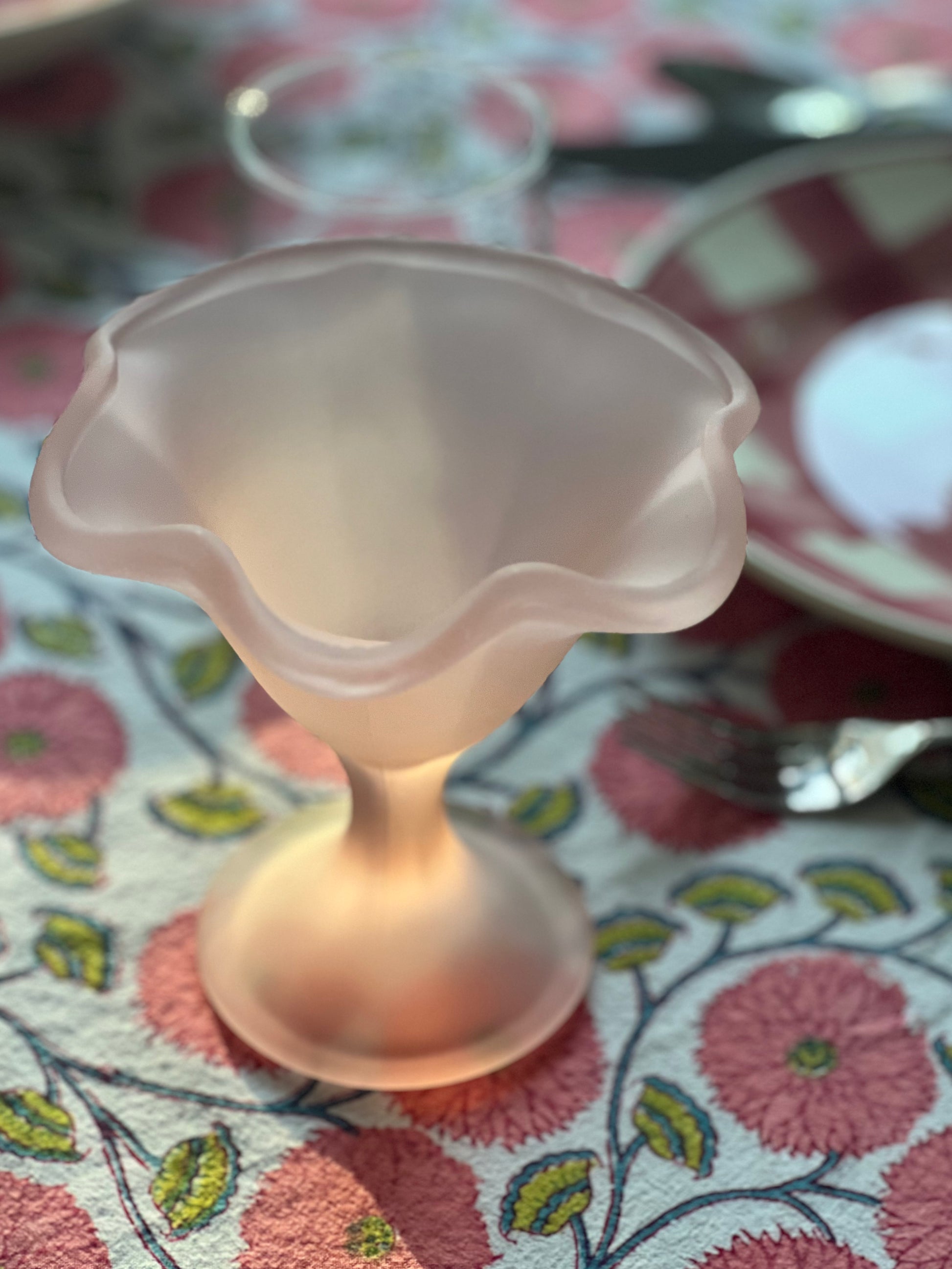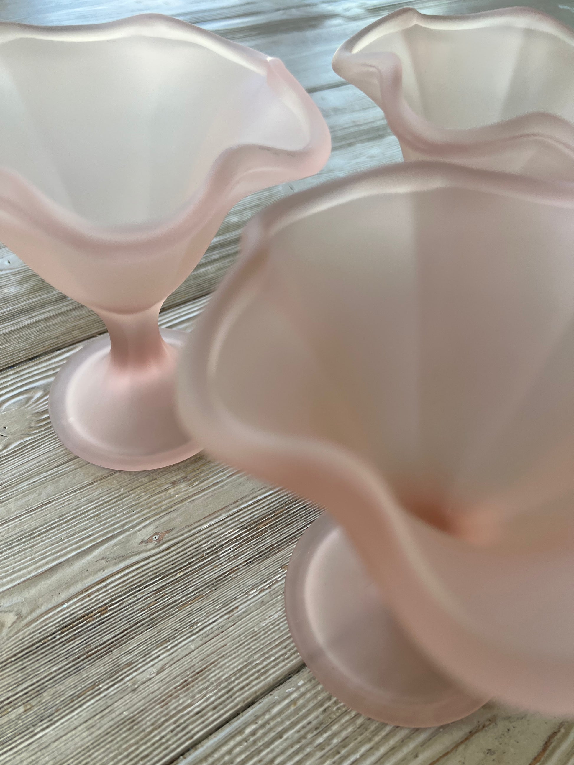 Charming 1980s dessert coupes featuring delicate flower-shaped rims in a soft matte pastel pink. Perfect to serve ice cream, sorbet, or any elegant dessert. Made from thick frosted glass with a sculpted footed base. A beautiful blend of retro Italian design and Art Nouveau inspiration.
