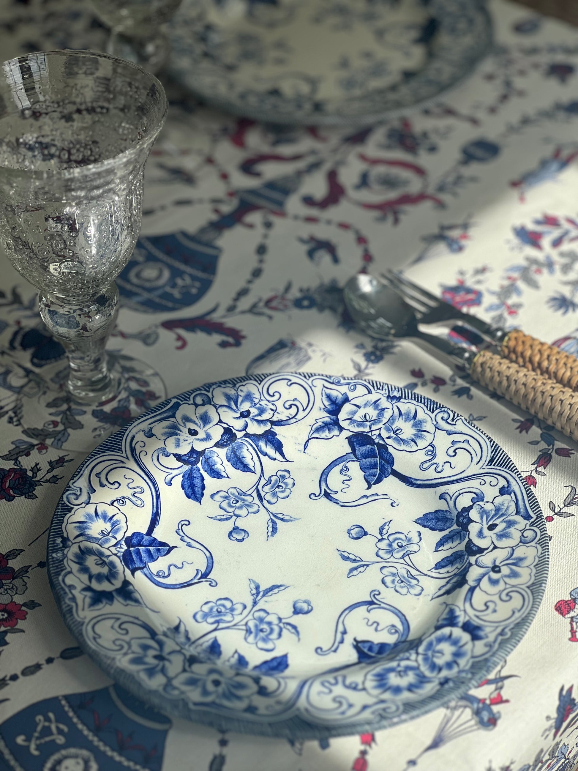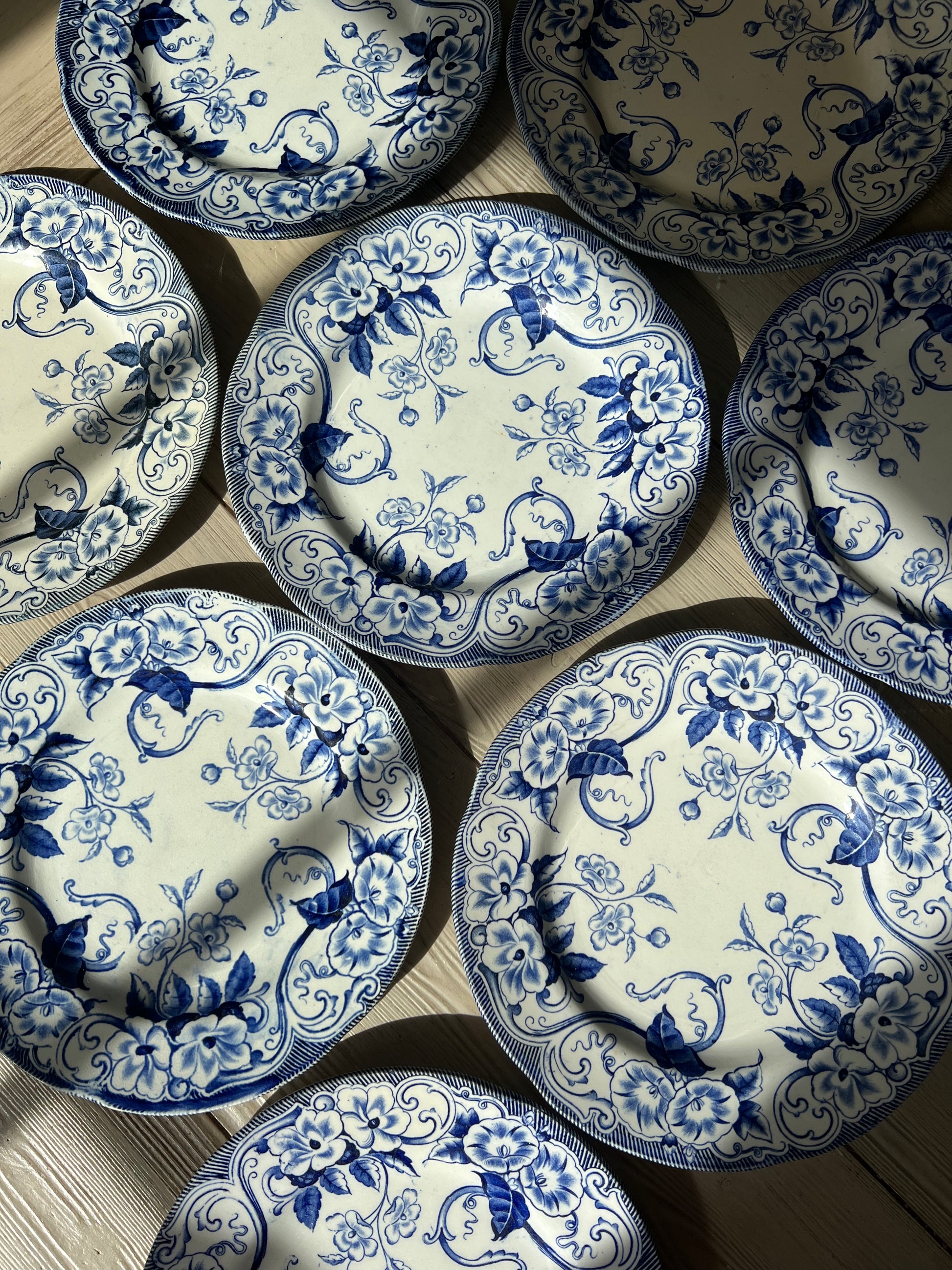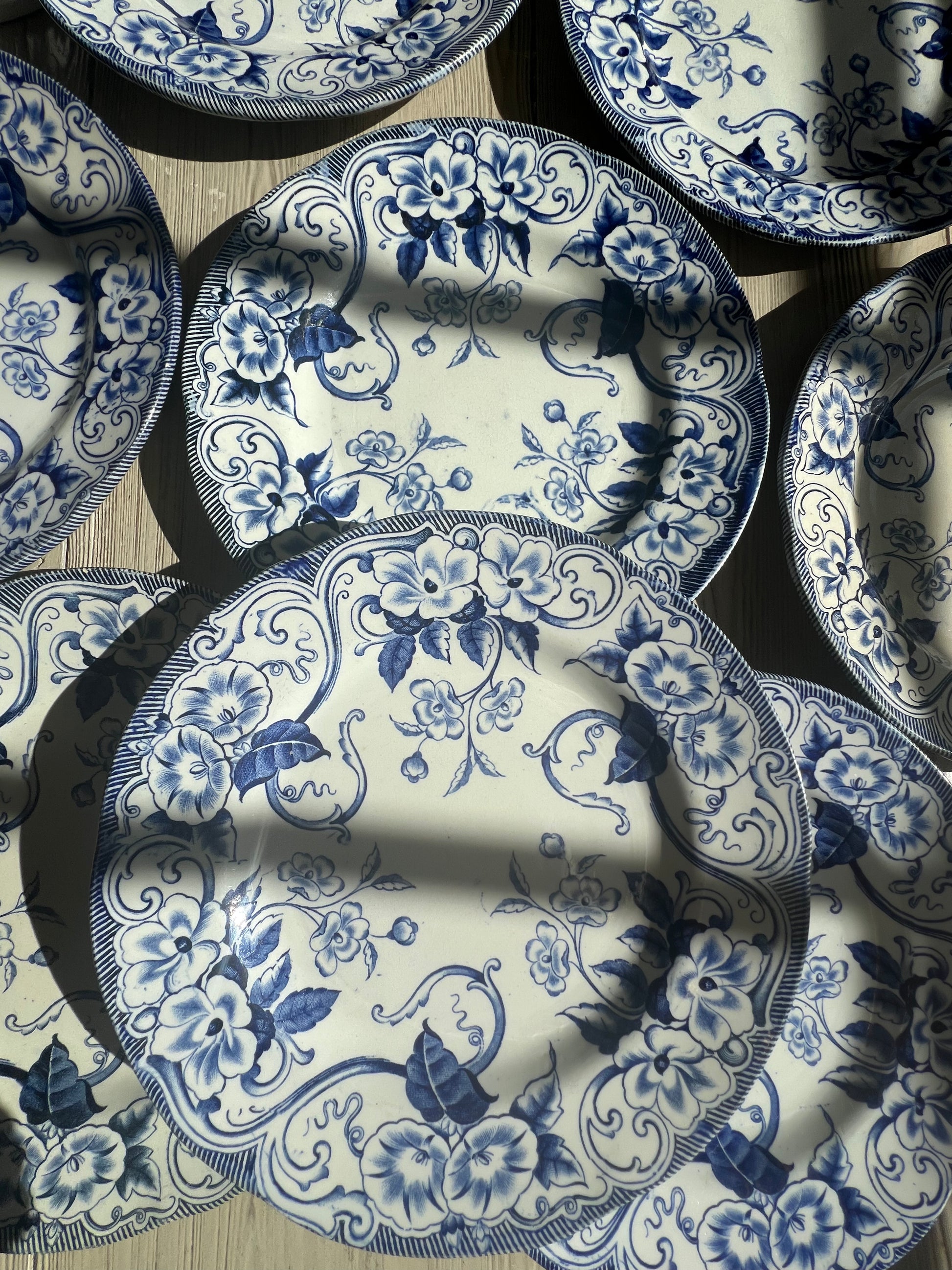 Step into 19th-century splendor with this exquisite set of eight French Terre de Fer (ironstone) salad plates in the rare “Flora” cobalt blue pattern by Creil et Montereau. These plates showcase delicate floral motifs and timeless French craftsmanship.