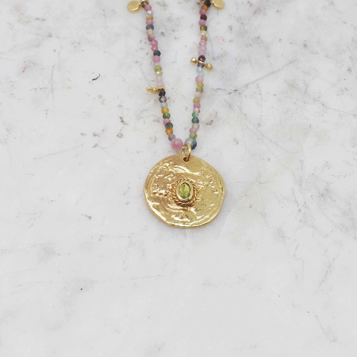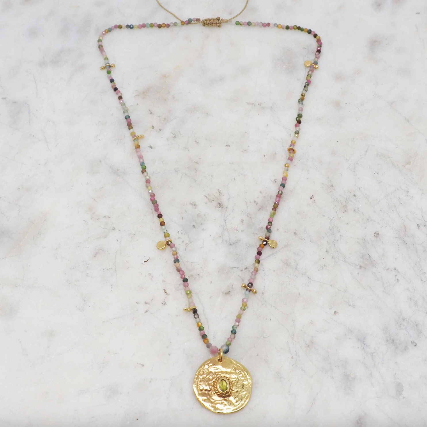 Materials : Goldfilled necklace with tourmalines and peridot.
