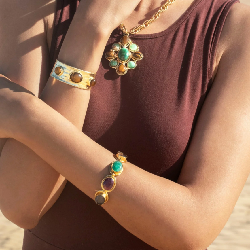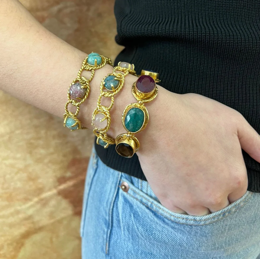 A delicate boho-chic piece from a French brand, Nikki Paris, this gold-finished brass bracelet features a row of oval semi-precious stones, including smoky quartz, sapphire, emerald, and ruby.