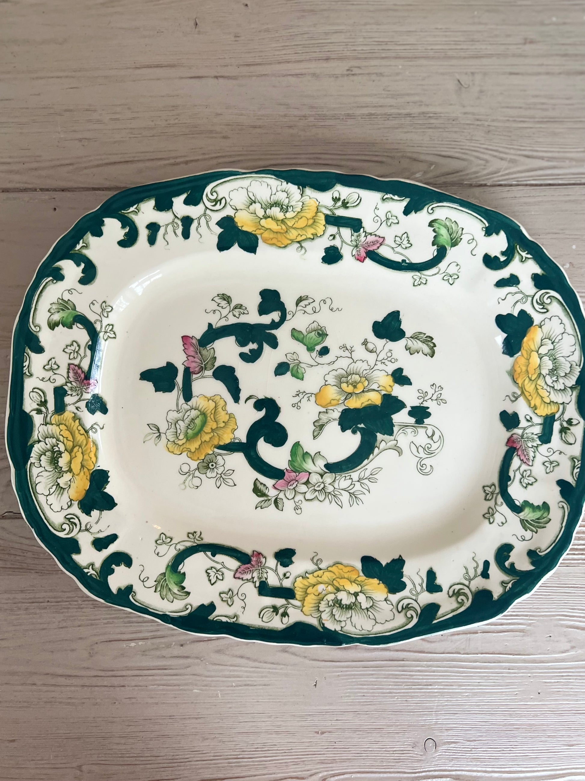 Presenting a stunning green transferware rectangular serving platter from Masons. This platter features a delicate trailing vine of Chinoiserie-style flowers, accented with gilding and hand-enameled details in chartreuse, yellow, and deep teal. A beautiful example of green transferware, it measures approximately 12 inches. The condition is good, with no chips or cracks and only minimal crazing.