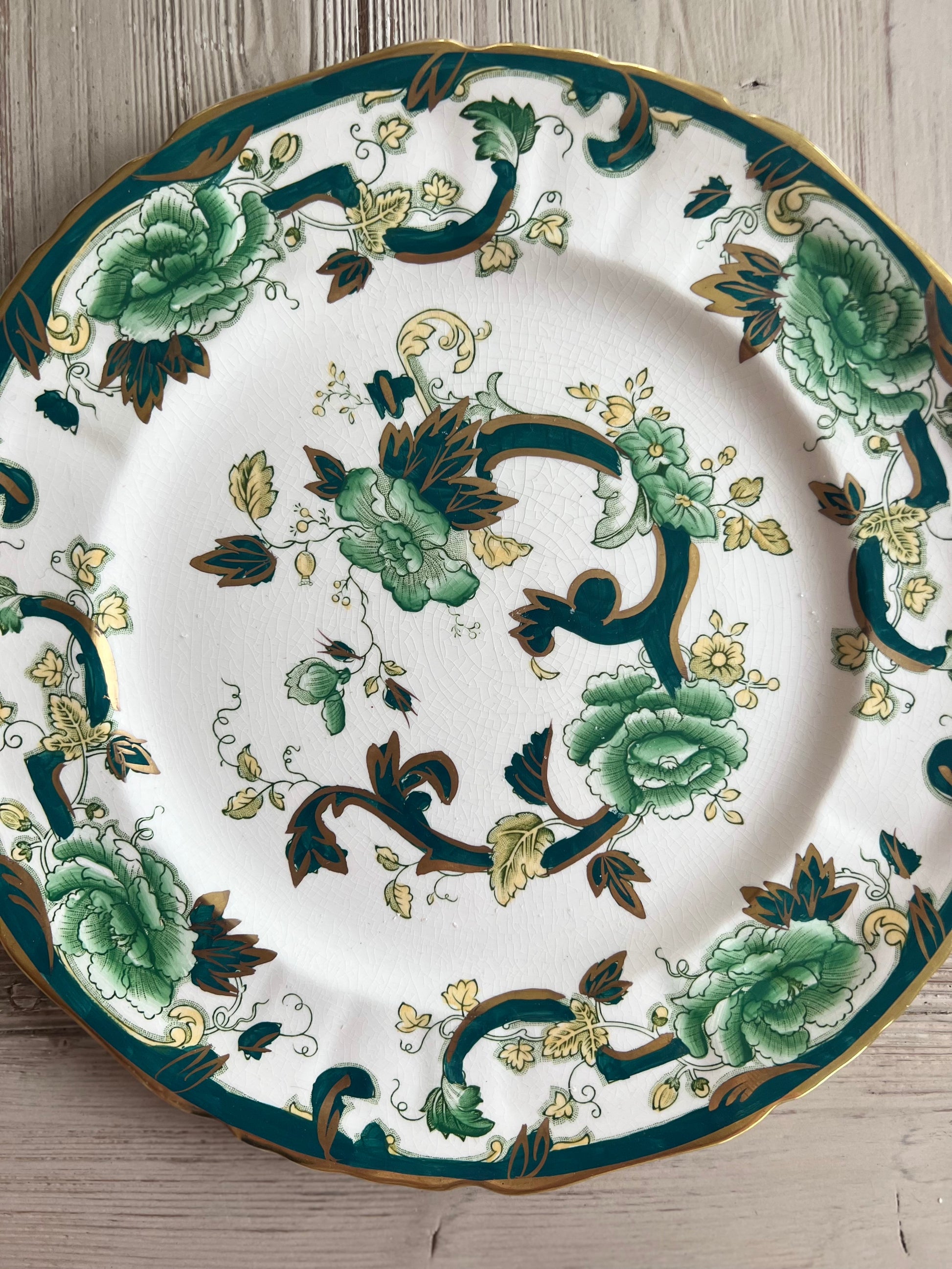 Presenting a stunning green transferware dinner plate from Masons. This plate features a delicate trailing vine of Chinoiserie-style flowers, accented with gilding and hand-enameled details in chartreuse, yellow, and deep teal. A beautiful example of green transferware, it measures approximately 10 inches. The condition is good, with no chips or cracks and only minimal crazing.